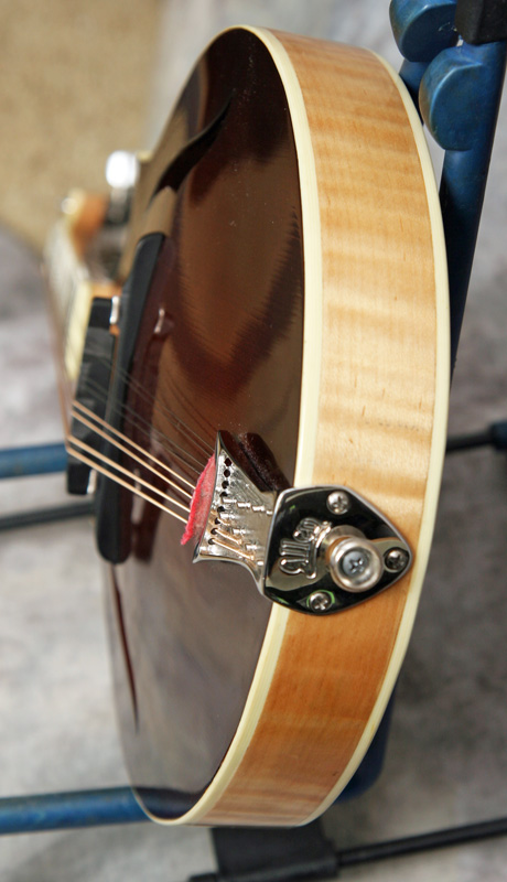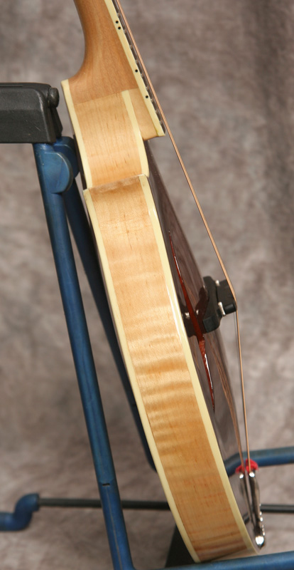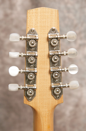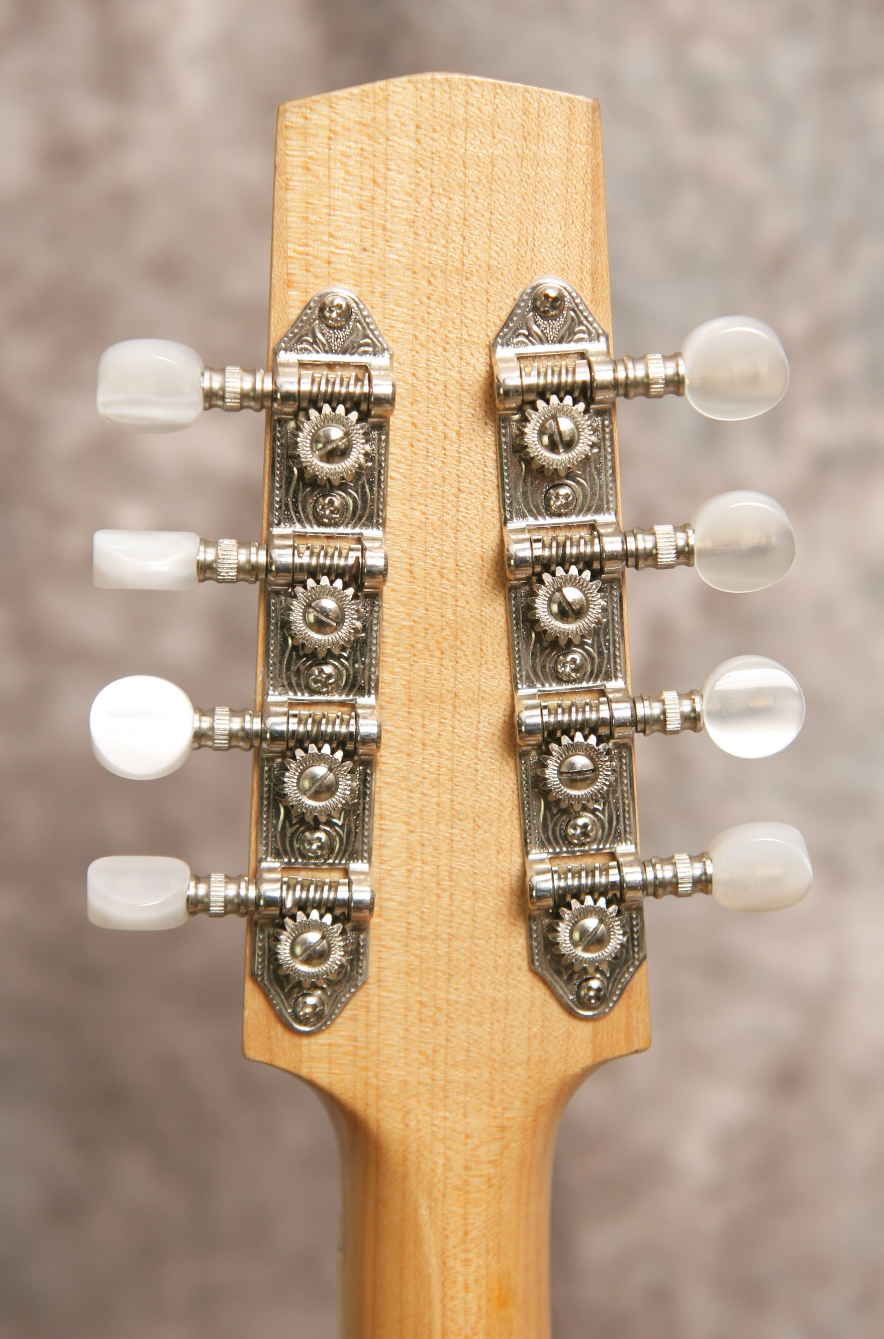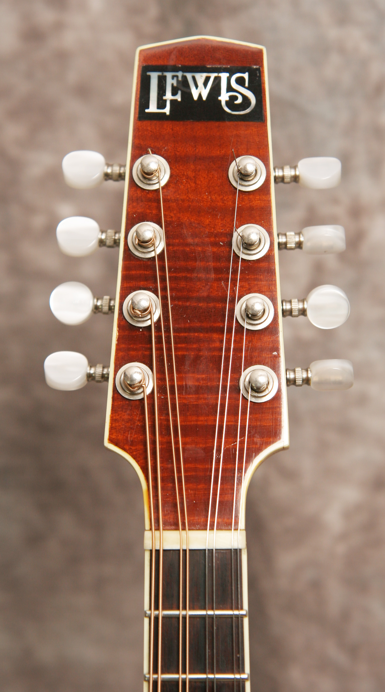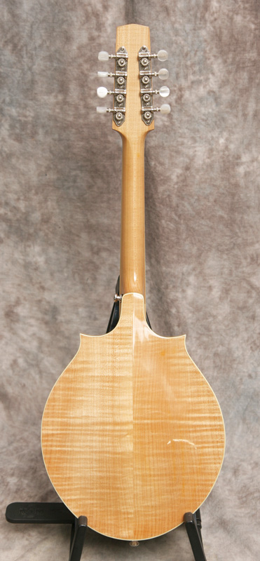 (Serial No. M143DS) Excellent condition, dark top with a natural maple back. It has all the good stuff - long neck, 2 point body, f-holes, elevated fret board, flamed maple back and sides, solid European spruce top, bound Desert Ironwood fingerboard, nickle hardware, and a pearl logo. Frets are fine, neck is straight and the neck set is good. Fitted with Schaller tuners and an Allen one piece tailpiece. Good sounding mandolin with clear trebles and a nice woofy bass. Click here for a video clip of this mandolin.Comes with a nice hard case.