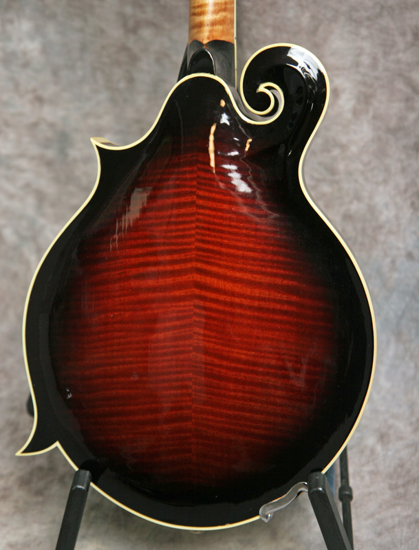 (Serial No. 182510) Excellent plus/near mint condition. This is the main workhorse mandolin for Weber, and it carries the load well. This mandolin will give you that good bluegrass sound. Has a dark sunburst lacquer gloss finish, a solid carved red spruce top which gives it the cut and chop, traditional tone bar bracing, heavily flamed AAA grade maple back, sides and deep V profile neck, fully bound, nickle Grover tuners with pearl buttons, Weber one piece cast tailpiece, pearl "The Weber" logo, and an ebony Weber Traditional bridge. The finish has been removed from the back of the neck (a speed neck) to stop your hand from sticking on the back of the neck in the summer. This work is so clean it has to be factory work. Fitted with an easily removable armrest. Bound radiused fret board with 1 1/8 inch nut, diamond position markers, jumbo frets, and no treble extension which helps to eliminates pick click. Its a loud mandolin with good chop and a very warm woody tone. Very clean mandolin - anything that looks like a blemish is probably a reflection. Bruce Weber built a lot of great Gibsons and Flatirons there in Montana. This was built in his own shop, Sound to Earth LTD. in Belgade, Montana. This instrument is ready to go. It needs nothing but your fingers on the strings! Comes with the original shaped grey Weber hardshell case.