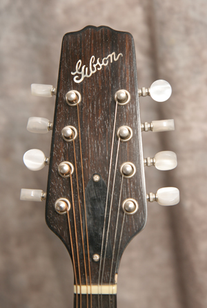 (Serial No. 20730010) Excellent condition with one crack repair. Solid brown lacquer with a satin finish. This is the "no frills" A5 style mandolin for Gibson, but it still has all the design features that give Gibson mandolins their legendary tone, including a hand-fitted dovetail neck joint, solid maple neck, sides and back, solid Sitka spruce top, tone bar bracing, and a hand-tuned tone chamber. Definately has a slim Loar neck with a sharp V profile, the traditional flat unbound ebony fretboard, and the Loar style 1 inch bone nut. Pearl logo in the peghead and it has the Grover tuners. Body is top bound only in black and no pickguard, both as made by Gibson. Shows a little playing wear as this mandolin is loud with good tone. It will cut a banjo. Excellent sounding mandolin with good response all across the strings and up and down the neck. Just set up by my luthier so the mandolin plays like butter and has the signature Gibson chop - excellent bluegrass sound! Here is a video clip of this mandolin as played by Nathan Beaumont. Comes with a shaped hardshell caseComes with a shaped hardshell case.