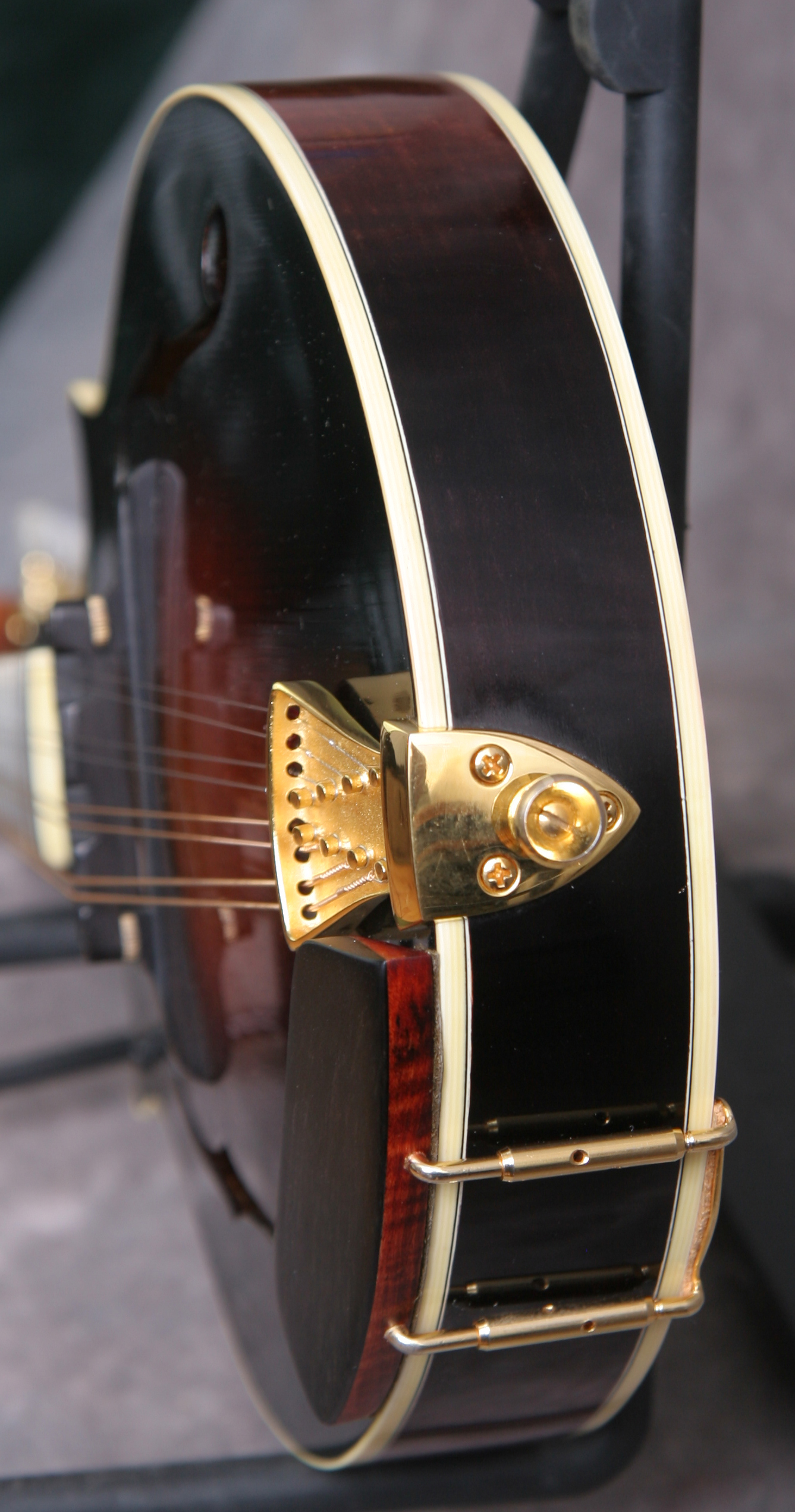 (Serial No. 3606) Near mint condition, dark red brown sunburst finish. This instrument was built by luthier Darren Craig in Hood River, Oregon. This is a two point A style with a hand-carved red spruce top, figured solid maple maple back and sides, 1 1/8 inch pearl nut, and a radiused and bound ebony fretboard. The fretboard is abbreviated to eliminate pick click and to allow you to play in the sweet spot. Has an ebony bridge. The peghead has a pearl logo, gold Schaller tuners and a Monteleone style one-piece tailpiece, and an ebony McClung armrest. Just set up by luthier Richie Dotson so it plays very well. Here is a short video clip click here of this mandolin played by Richie. Excellent sounding mandolin with strong volume and tone. Good bluegrass chop when needed. Comes with the original hardshell case.