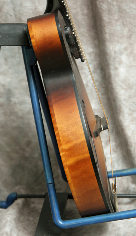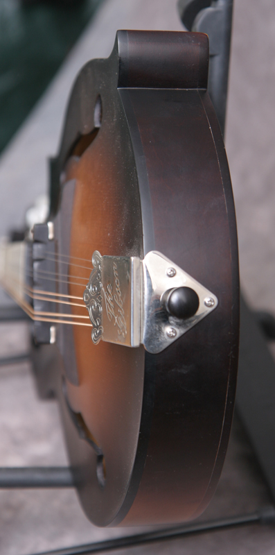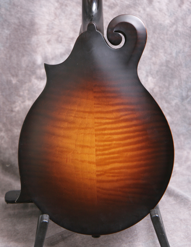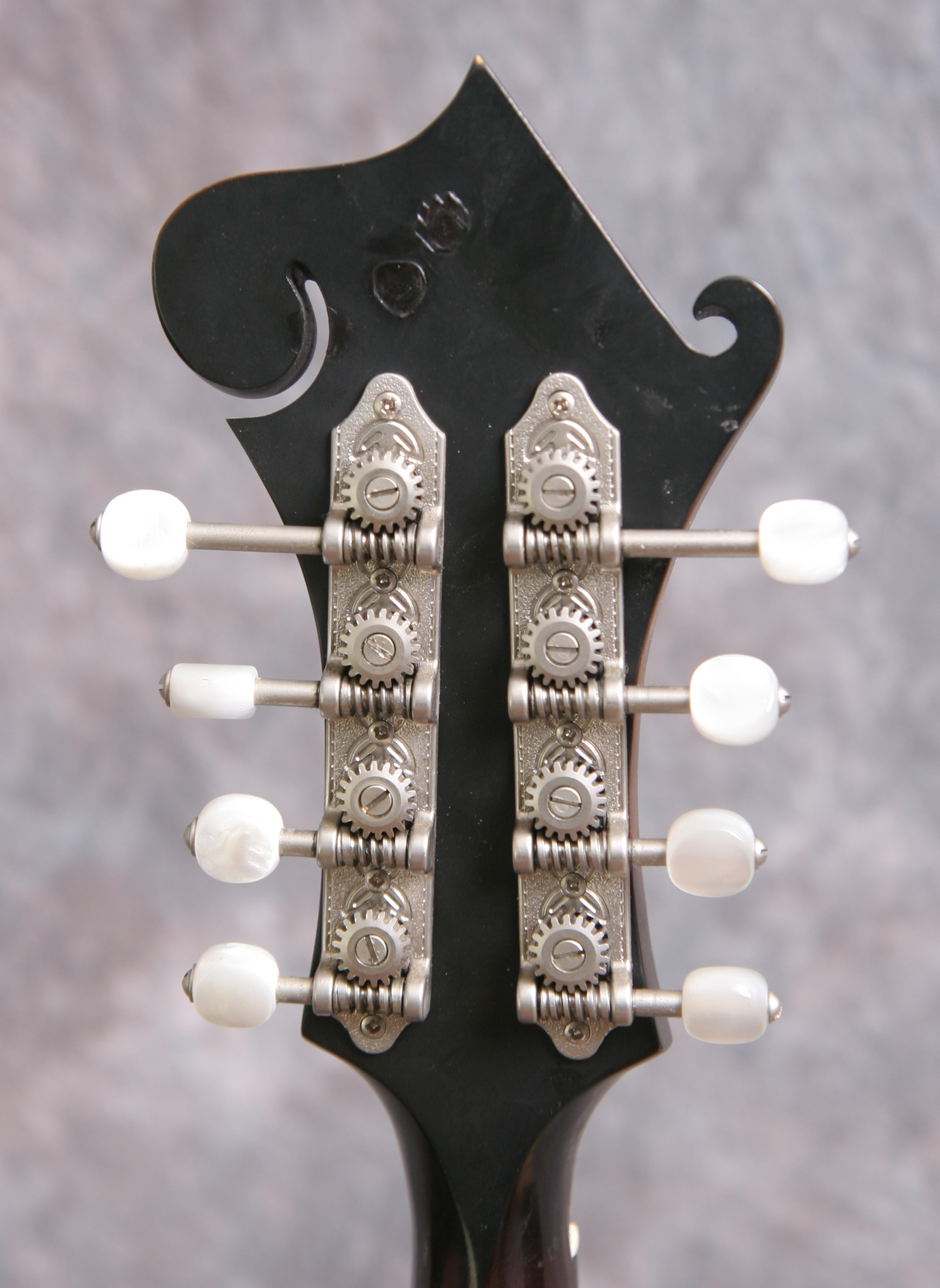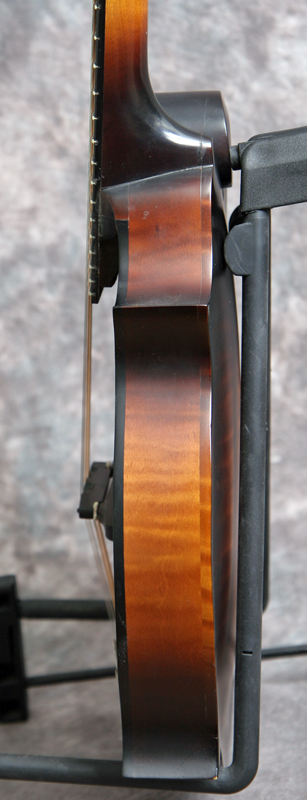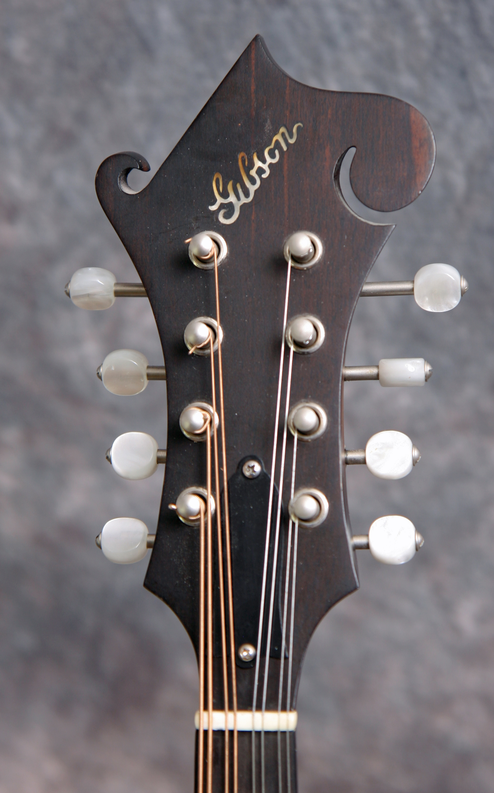 (Serial No. 71024010) Excellent condition. Brown sunburst lacquer with a satin finish. This is the "no frills" F5 style scroll mandolin for Gibson, but it still has all the design features that give the F5 its legendary tone, including a hand-fitted dovetail neck joint, nicely figured maple neck, sides and back, solid Sitka spruce top, tone bar bracing, and a hand-tuned tone chamber. Has the traditional Loar style flat unbound ebony fretboard with a V profile neck and a 1 inch bone nut. Pearl logo in the peghead. Body is top bound only in black. No pickguard as made by Gibson. There is some kind of minor impression in the back of the peghead - it looks like the mandolin was laid on something hot. Very good sounding mandolin with good response all across the strings and up and down the neck. Just set up by luthier Richie Dotson of Acoustic Box LLC so the mandolin plays like butter and has the signature Gibson chop - excellent bluegrass sound! Here is a short video clip of this instrument played by Richie. Comes with the original shaped hardshell case.