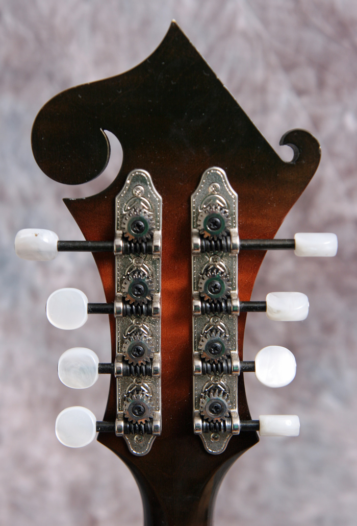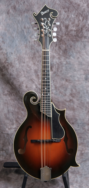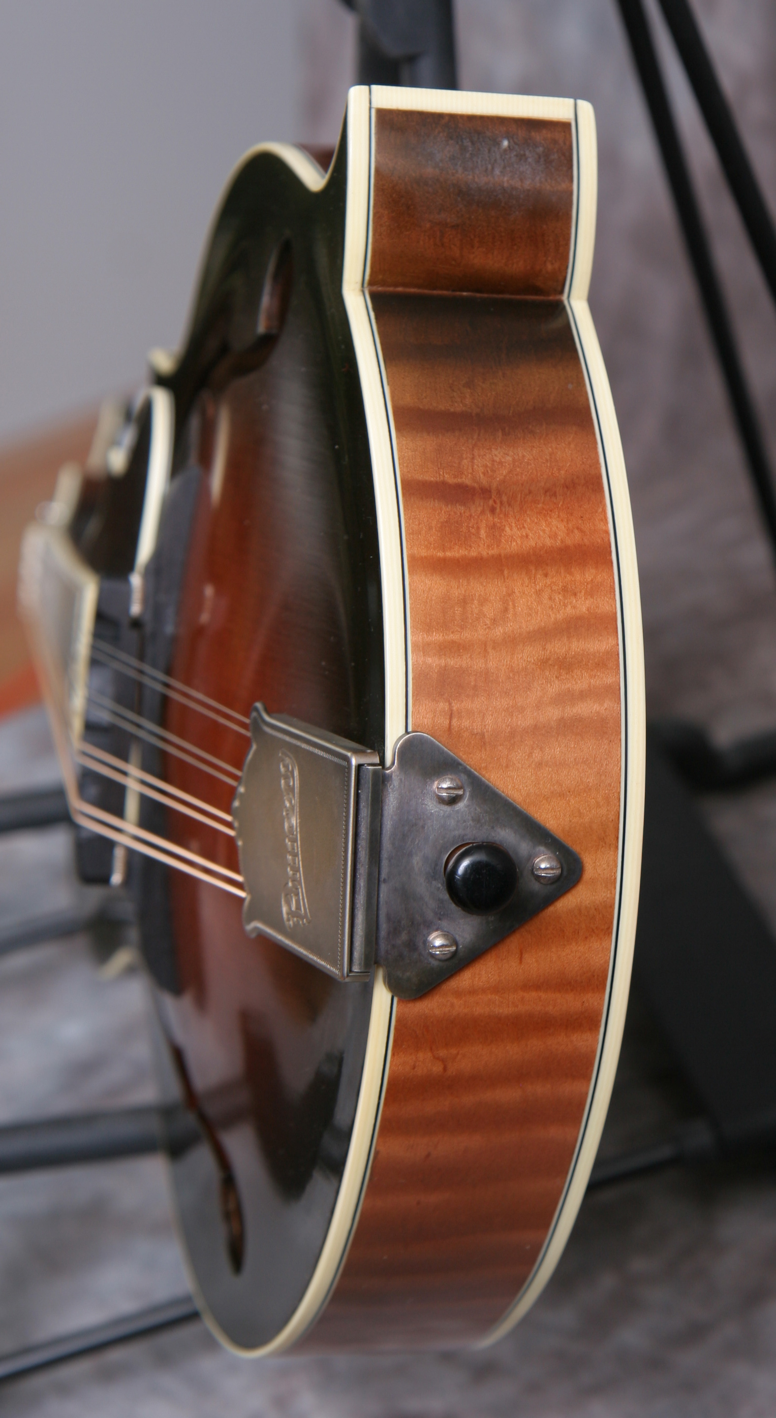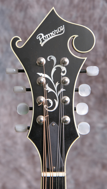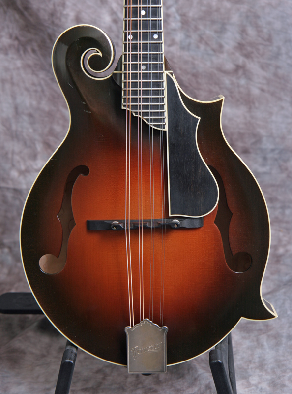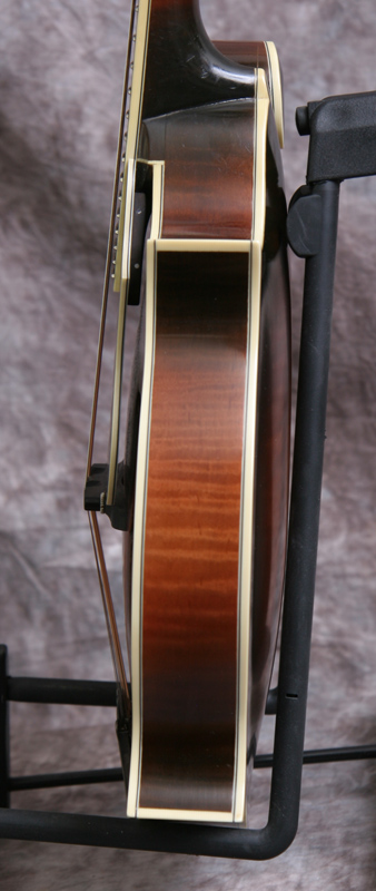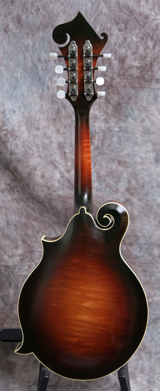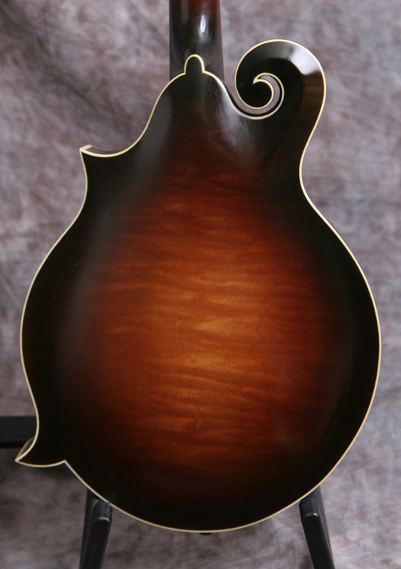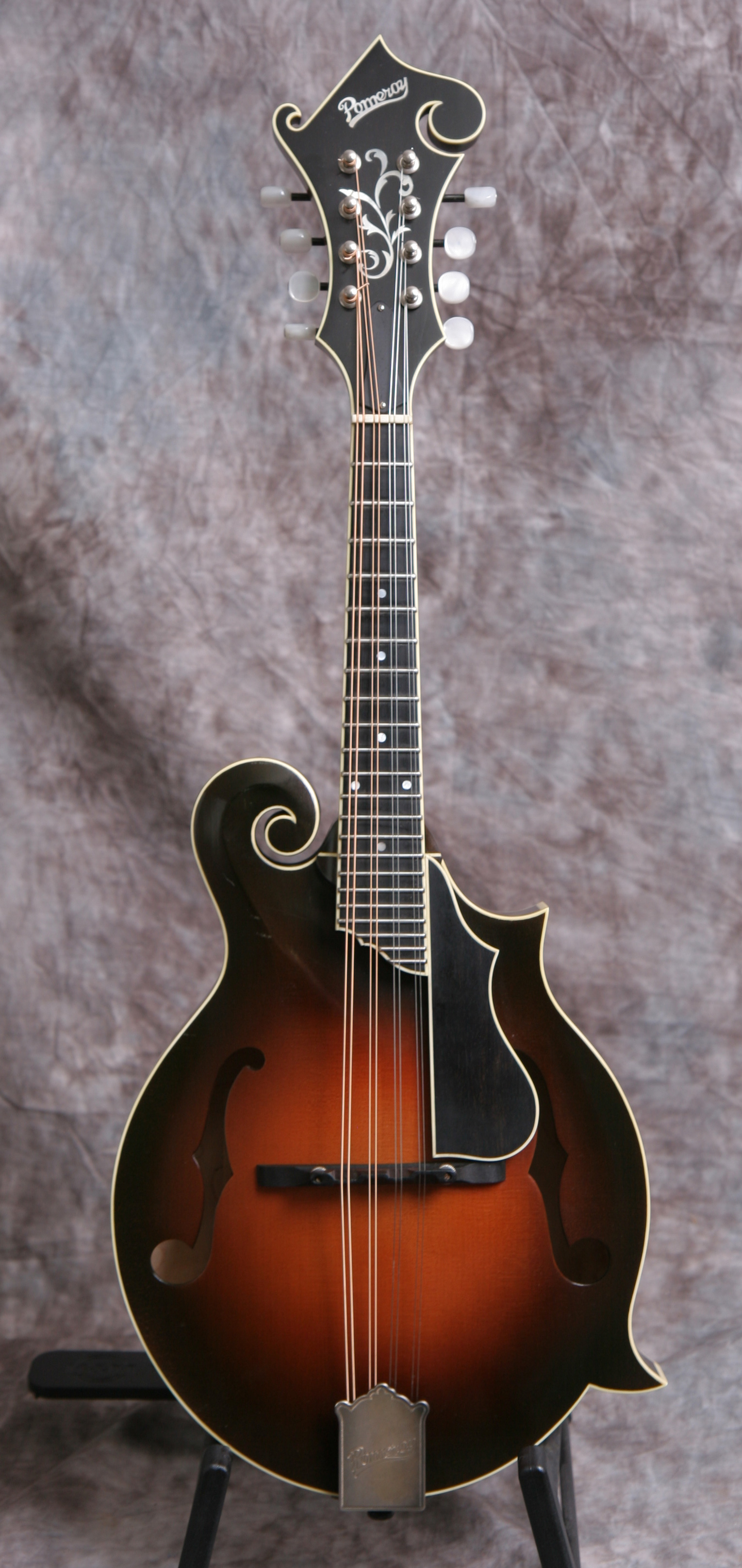 (Serial No. 134) Excellent condition. Lacquer sunburst finish that has been sanded by Pomeroy with steel wool to reduce gloss. Has an one piece back and sides of flamed maple, solid Englemann spruce top, tone bar bracing, flat ebony fretboard and bridge, 1 1/8 inch nut, and pearl logo. Has a silver engraved James tailpiece. The fretboard was built shortened to eliminate pick click. Nickle Grover tuners with pearl buttons. Fully bound. Fitted with a custom bound ebony pickguard. Shows almost no playing wear. Very good sounding mandolin with good response all across the strings and up and down the neck. Just set up by my luthier so the mandolin plays like butter and has an excellent bluegrass chop. Comes with a nice hard shell case.