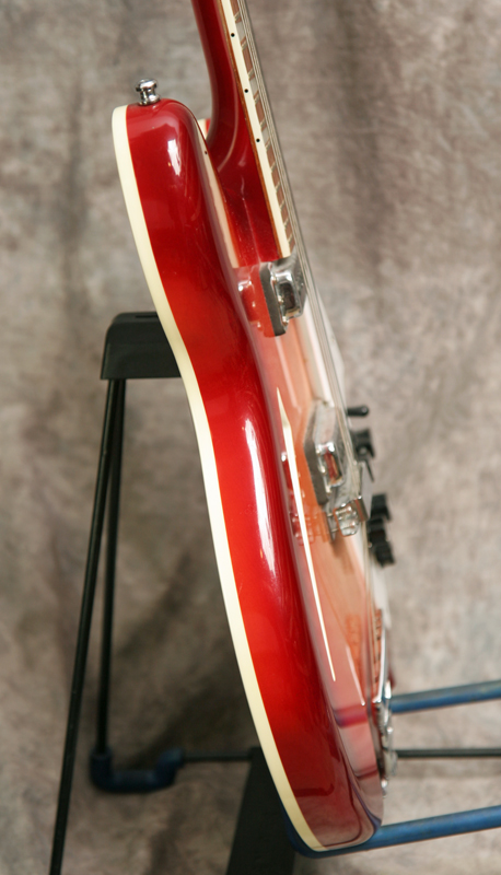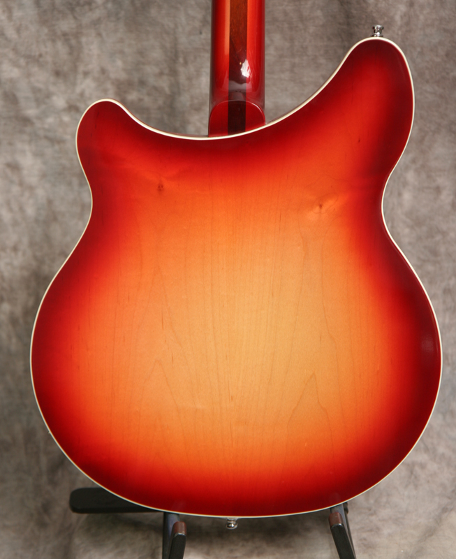 (Serial No. 04330) Mint condition, Fireglo finish. This guitar looks unplayed. The Rickenbacker 360 is the deluxe version of the 330. These were notably played by George Harrison, Peter Buck and Roger McGuinn. In addition to the 330s jangly tones and classic good vibes, the 360 gives you rounded horns, all maple construction (except the fretboard), a contoured top edge that rolls into back binding, slash soundhole, bright nickle hardware, and shark fin fingerboard inlays. It is also fitted with two pickups and the Rick-O-Sound stereo output. This sends each of the Hi-gain single coil pickups to its own amplifier, or straight into a recording medium for instant stereo guitars. These pickups deliver the bite of many other single-coils, but with an aggressive cut that has driven so many rhythm and lead guitar tracks through the decades. A 5-knob control layout with "blend" knob gives you a wide range of sounds. Very versatile and comfortable guitar. Comes with the original very nice hardshell case with some case candy.