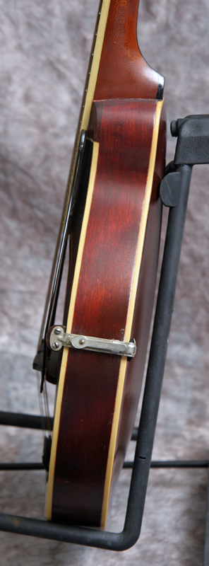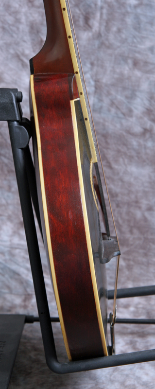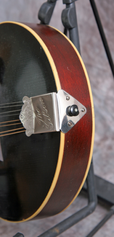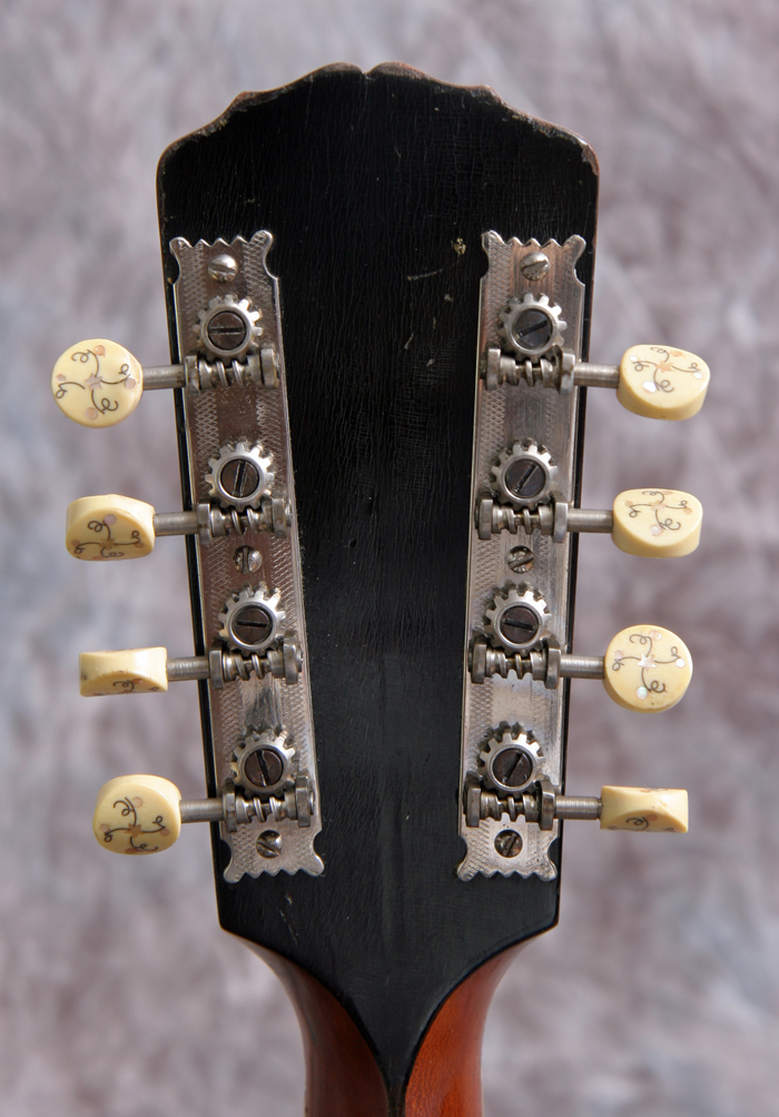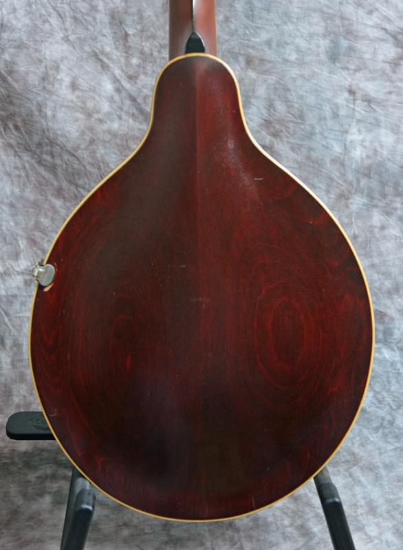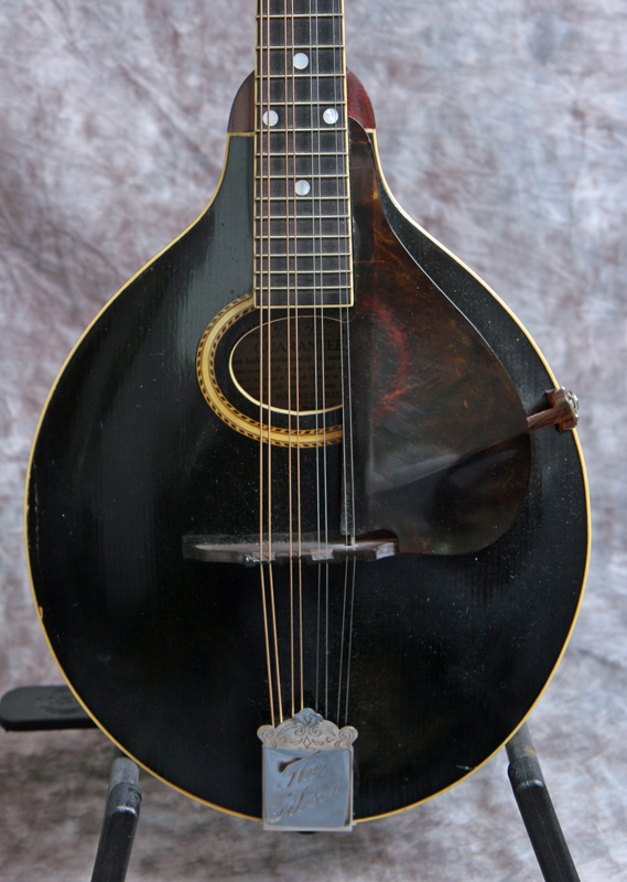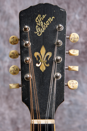 (Serial No. 13234) Excellent plus condition. The A4 was the top of the line A style mandolin for Gibson. This one is really clean and was played in a leading mandolin orchestra for years. Original finish with black top and a reddish back and sides, all solid woods with a two piece back and sides, spruce top, pearl logo and fleur di lise in the peghead, original hardware including the inlaid Handel tuners, bound top and back, and a bound ebony fingerboard with treble extension. Original one piece bridge. Frets were just dressed and the mandolin set up perfectly by luthier Jerry Ray. Nice big woody sound from this mandolin with good bass! Neck is straight, neck angle and frets are good. No structural repairs and only a few of the usual nicks and dings. Excellent for Celtic or old time or jazz or classical. Comes with the original hardshell case. Consigned.