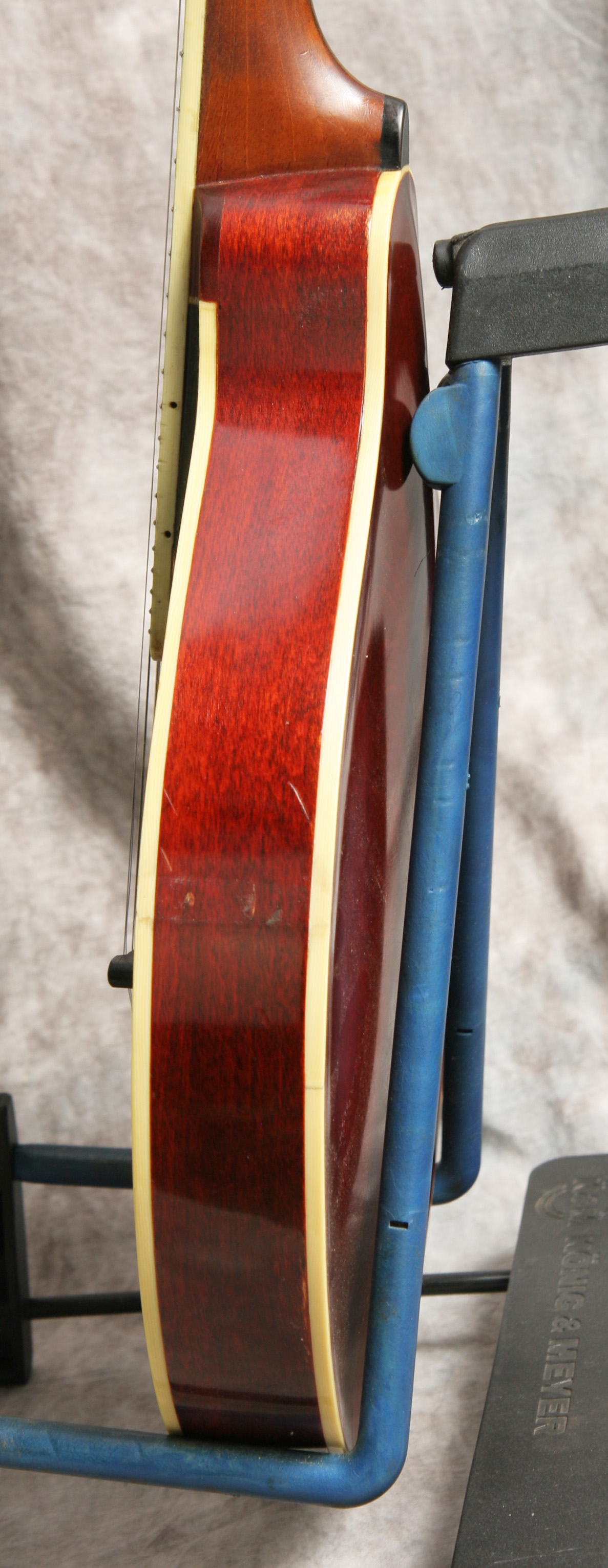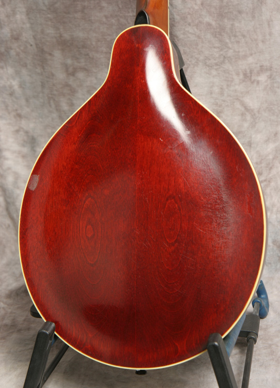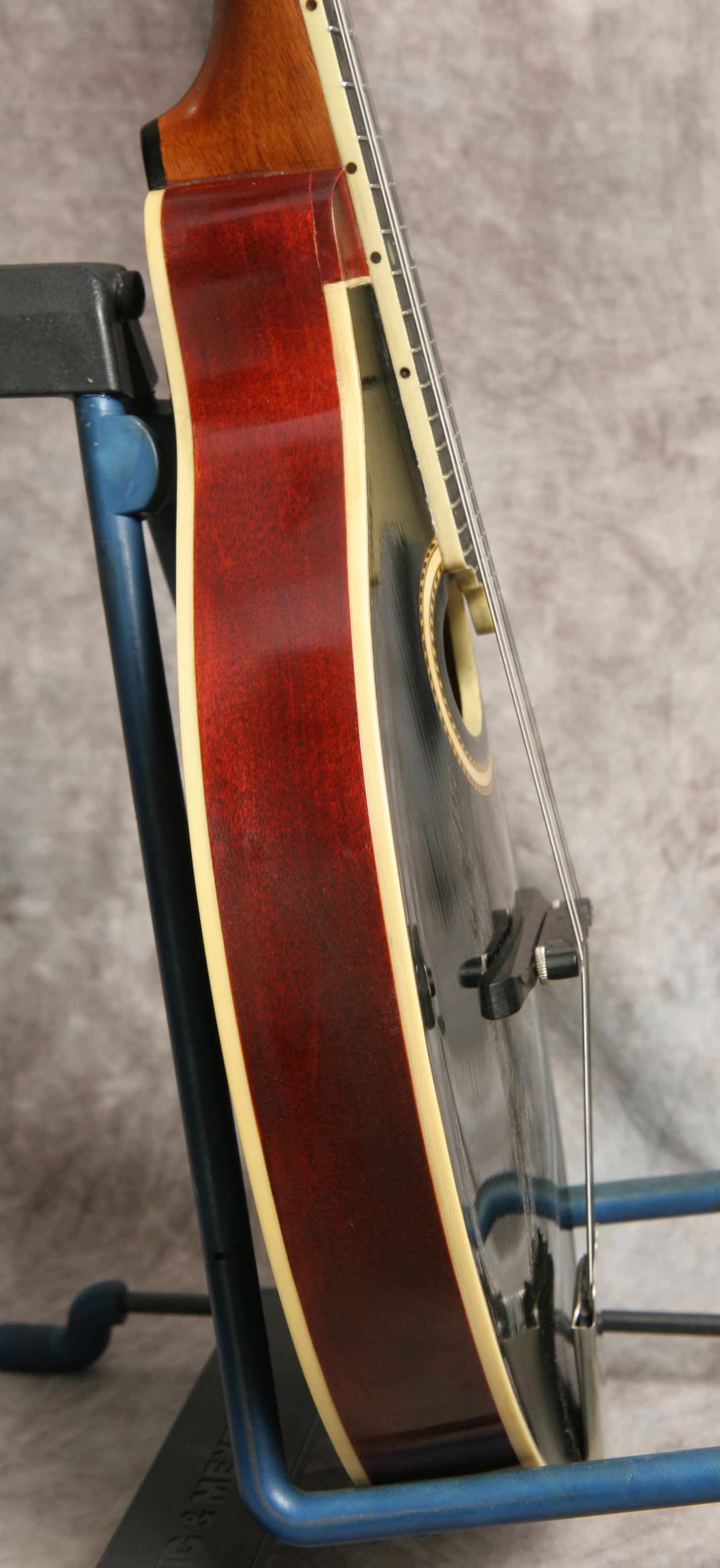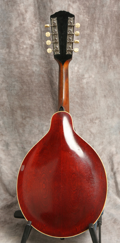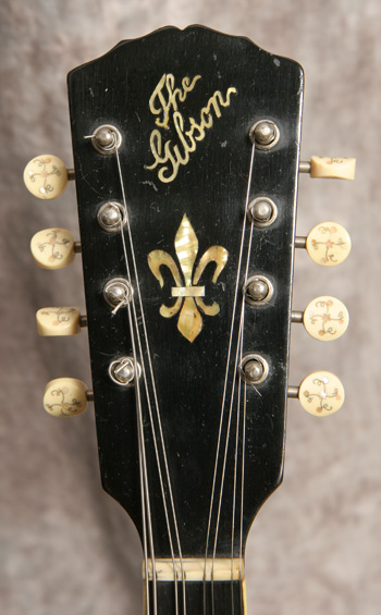 (Serial No. 23569) Beautiful excellent condition. The A4 was the top of the line for the Gibson A style mandolins. It has the black top finish with a reddish back and sides, a pearl logo and peghead inlay, bound top and back, and a bound ebony fingerboard with treble extension. The hardware is all original including the inlaid Handel tuners, but the pickguard is missing. Nice big woody sound from this mandolin with good bass! Neck is straight, neck angle is good and the frets are in great shape. Just set up so plays like silk. Shows almost no playing wear little playing wear and very little of the the usual nicks and dings. Excellent for Celtic, old time and jazz. Comes with a nice original hard case.