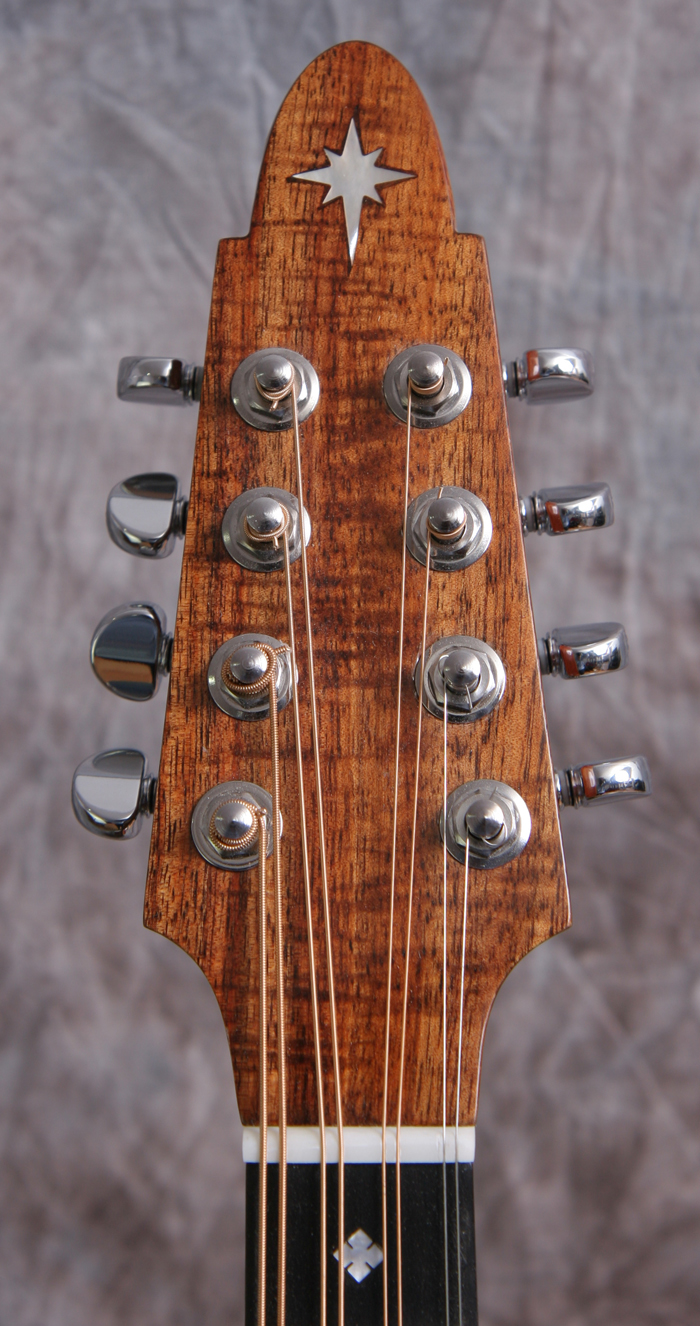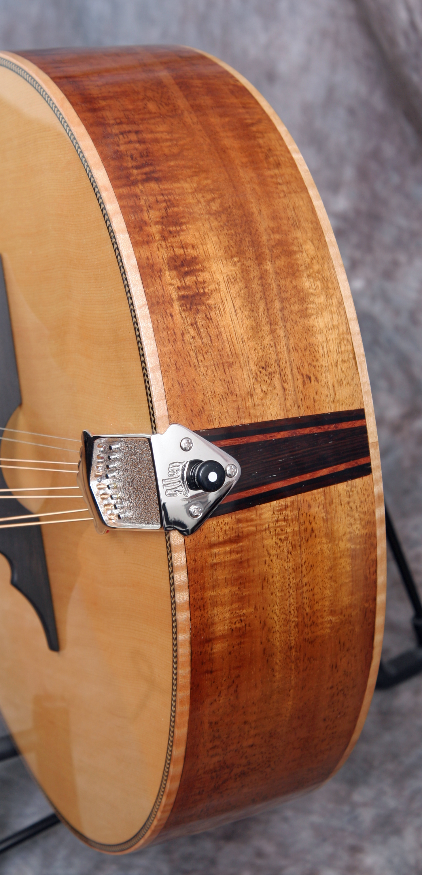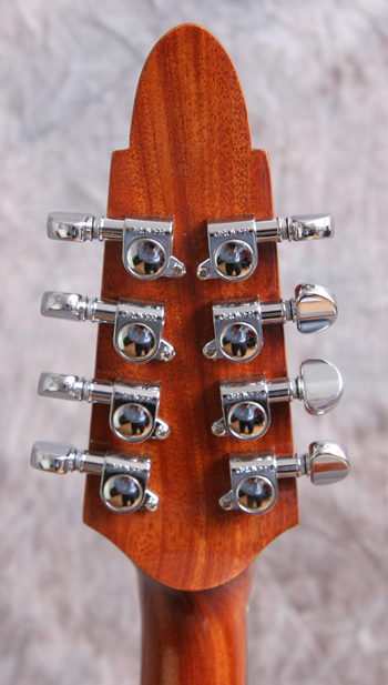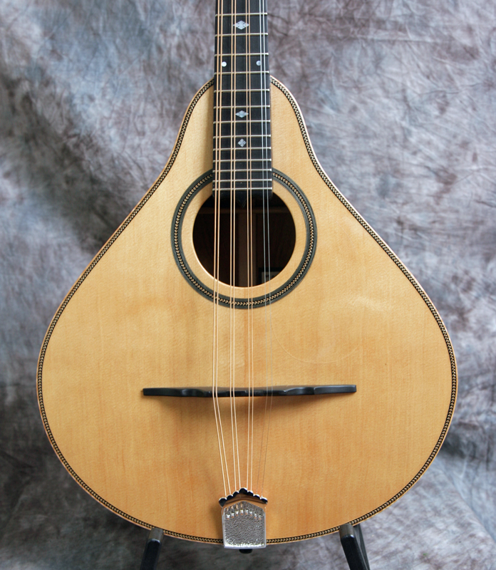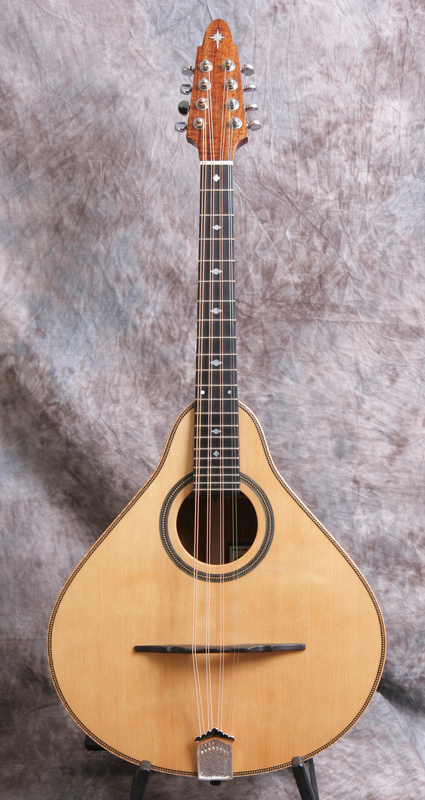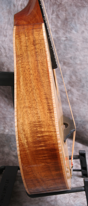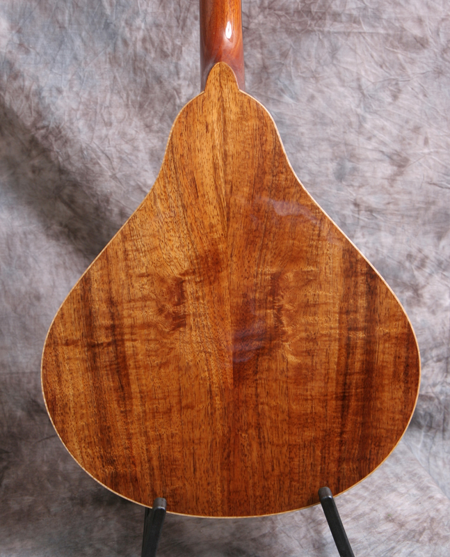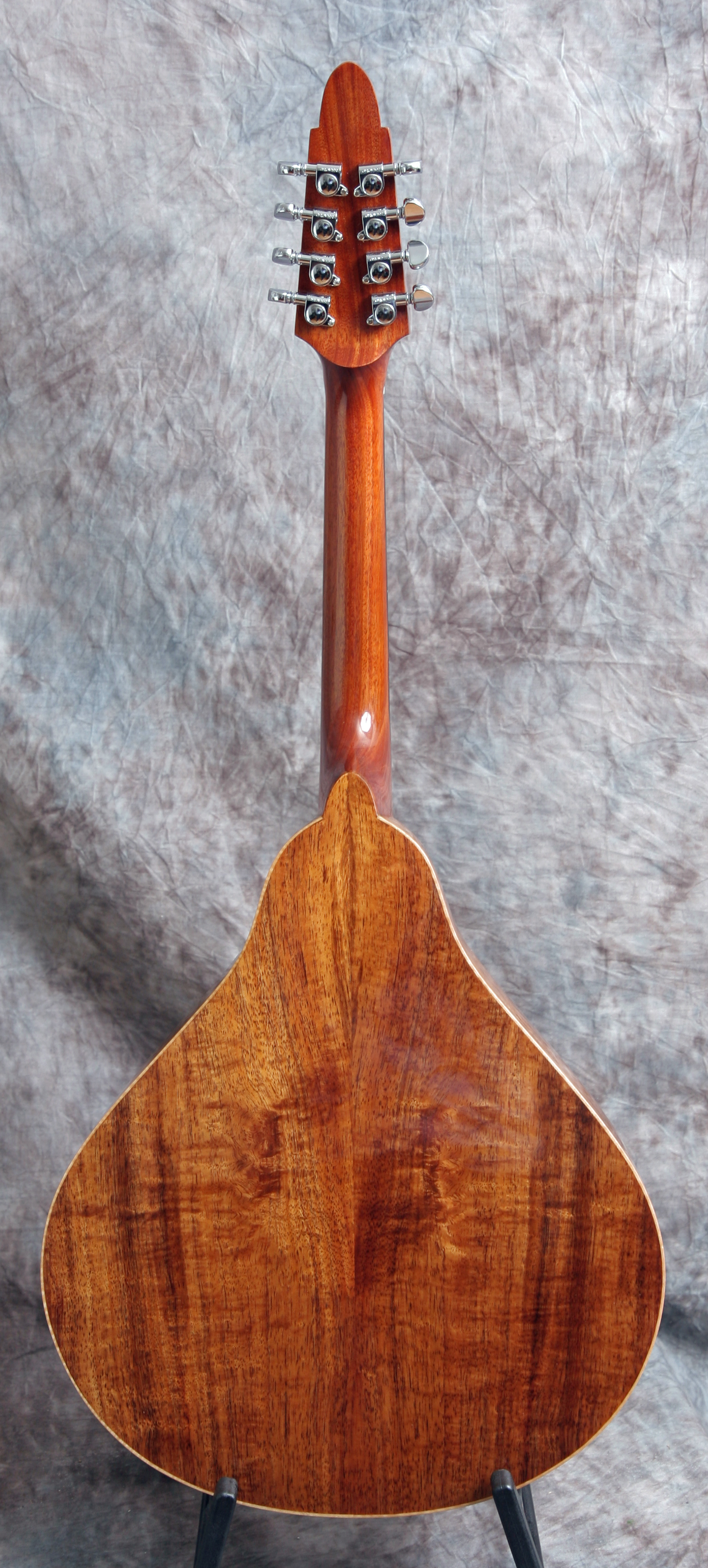 (Serial #52) New with warranty. This is an outstanding example of Richards fine craftmanship. These are professional grade instruments. Tremendous resonance and response in this one. It has a strong and powerful percussive sound with a deep rich bass. The back and sides are flamed Hawaiian Koa which I think is a superior tone wood for long scale double course instruments. The fingerboard and bridge are ebony, and the top is Alaska Sitka. The top is x-braced with herringbone top trim and curly maple binding. The neck has an adjustable truss rod and the ebony fingerboard has slotted diamond inlays. Solid one piece tailpiece eliminates buzzing and loose covers. Fit and finish is first class professional work - as good as those famous guitar makers. Nut is 1 3/8 inch. Scale length is 21 1/4 inches so it gives the guitar-like resonance for backup rhythm playing but is still comfortable for melody playing. The x-braced top gives it plenty of punch for driving a session. Nice low action plays effortlessly with a great neck. Its currently tuned GDAE as an octave mandolin but any zook tuning like ADAD or GDAD would work as well. Handmade in North Carolina and comes with a custom fitted hardshell case.