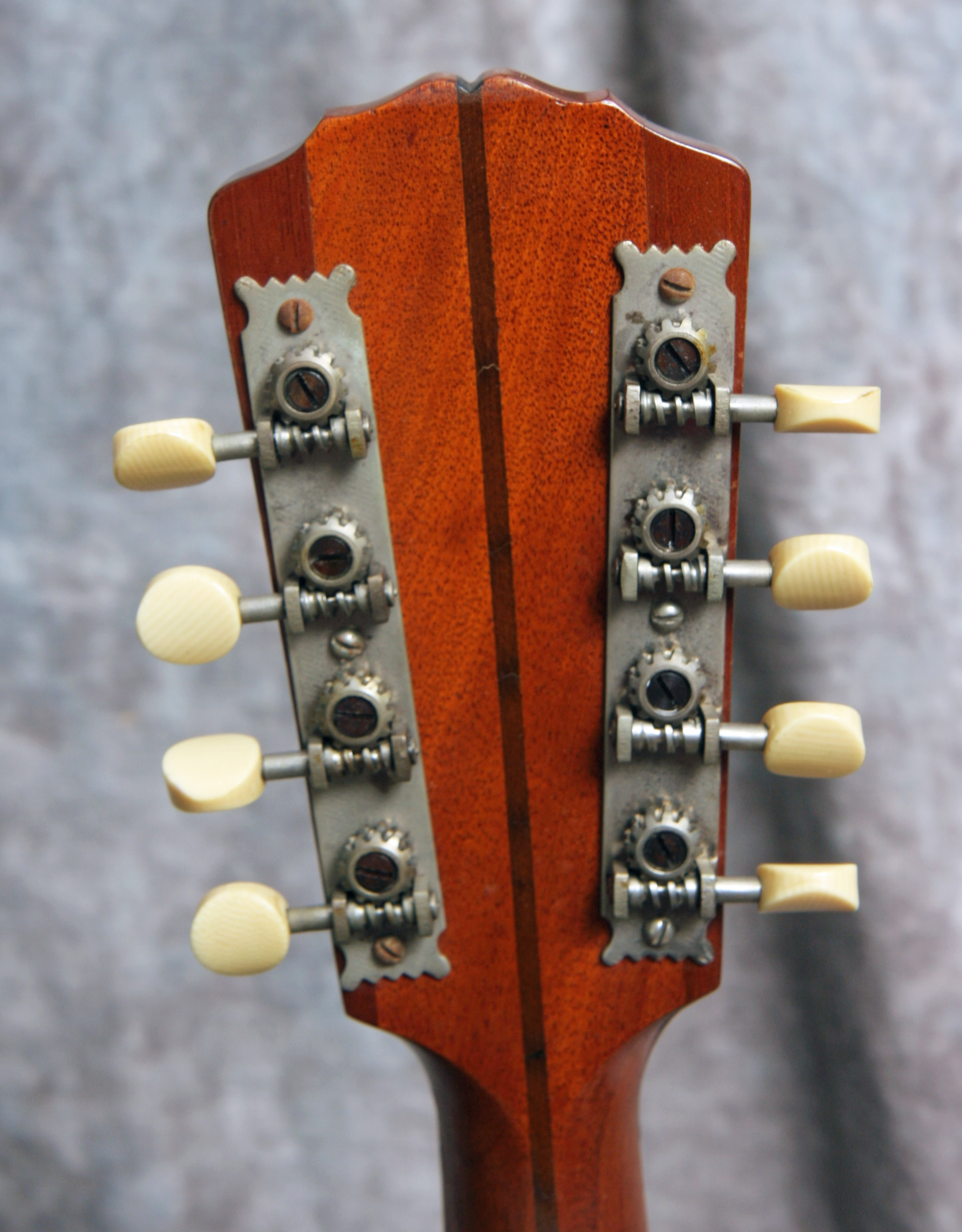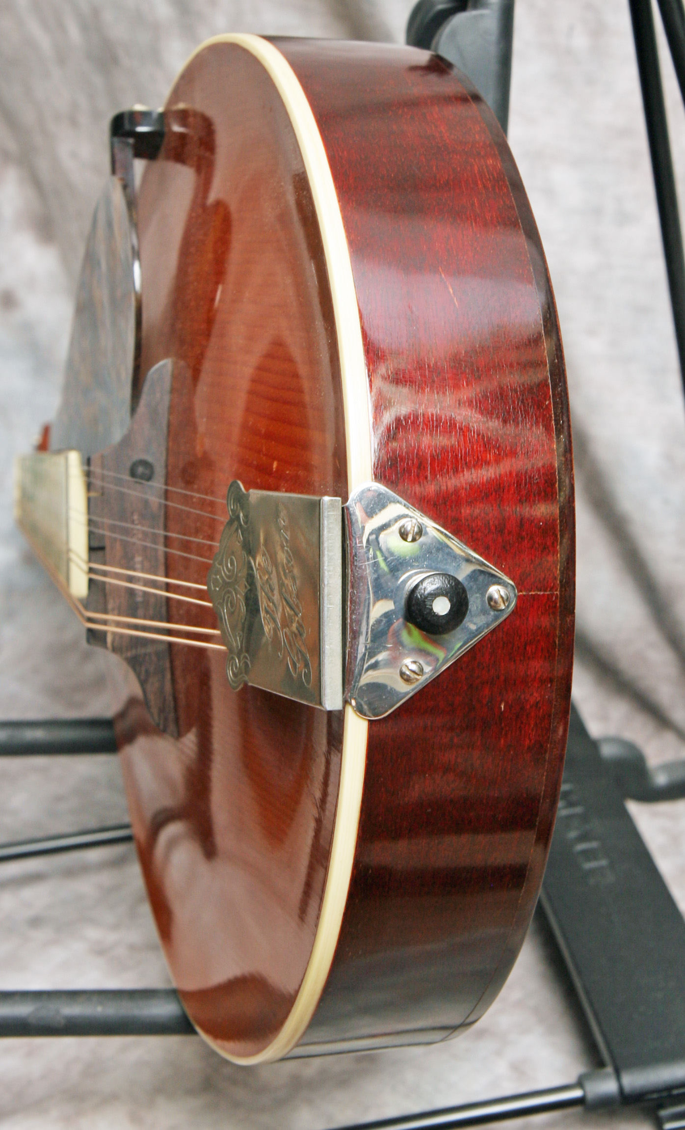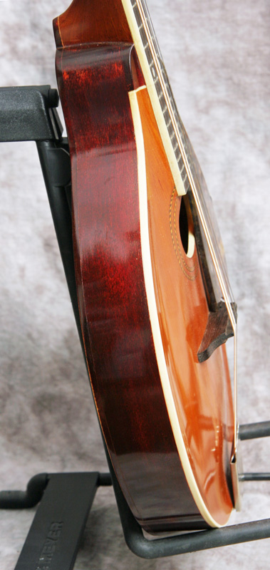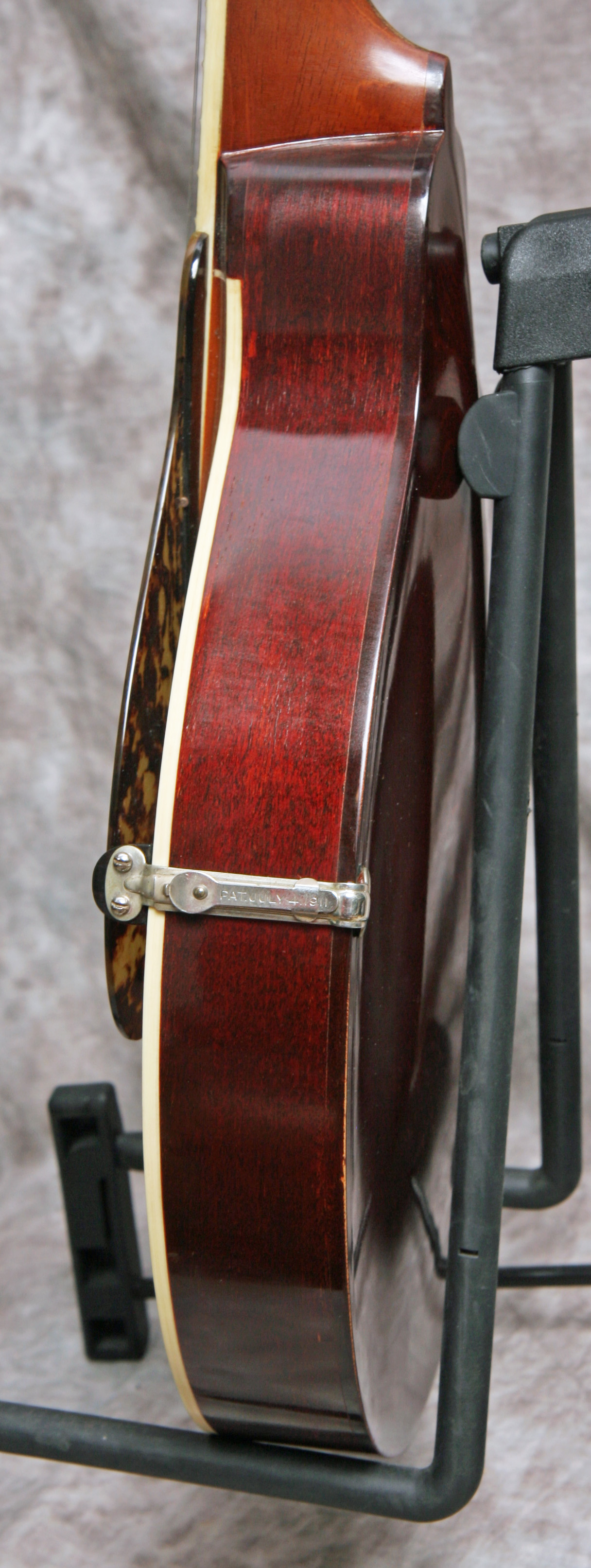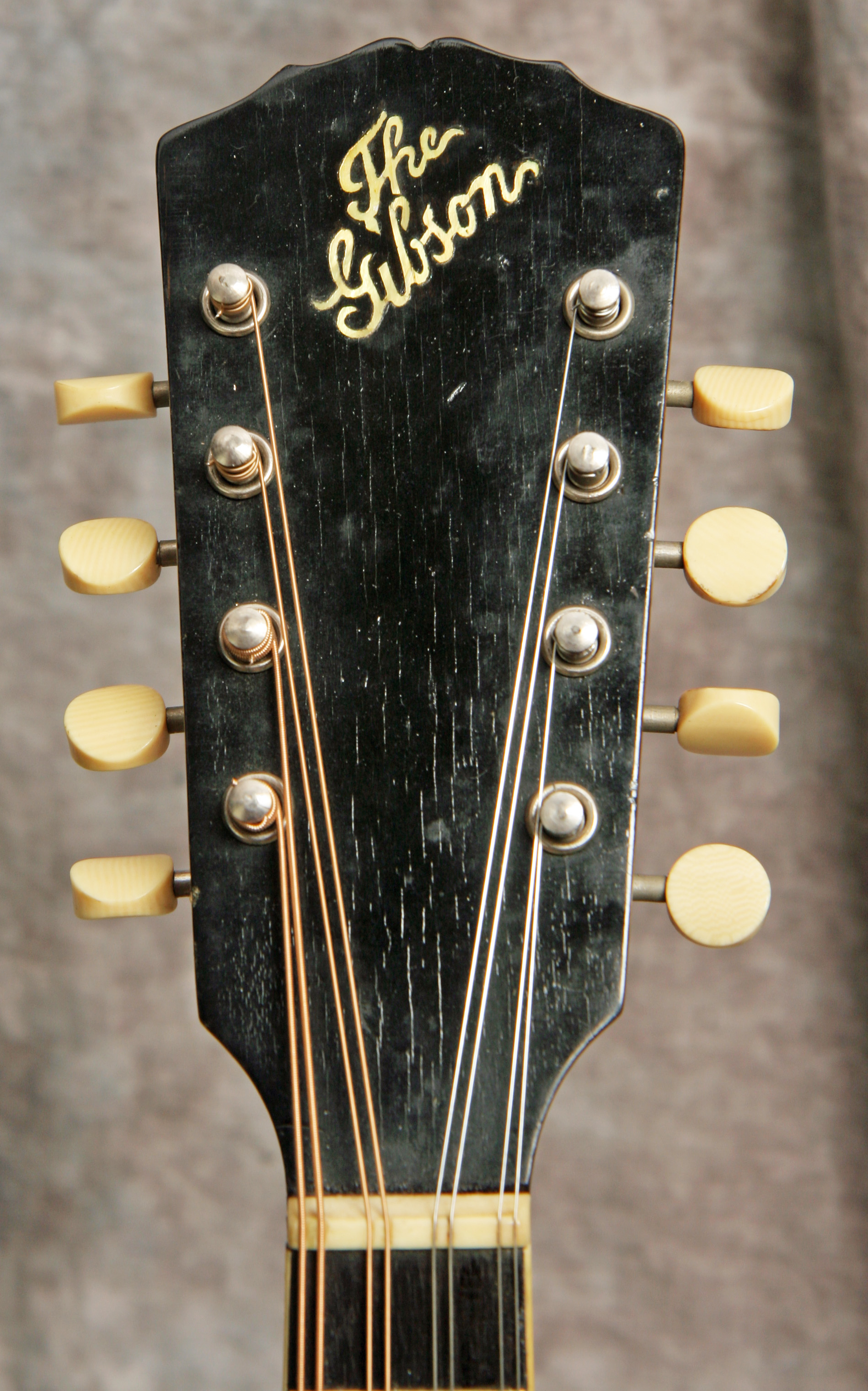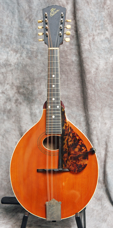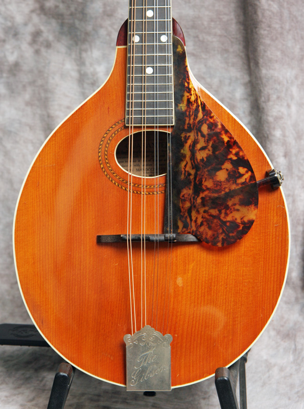 (S/N 30373 FON 3105) Excellent condition. Pumpkin top finish with dark back and sides. Has the pearl logo in the peghead, top bound only, unbound fingerboard, original Gibson label inside. All finish and hardware is original, including the unique bridge used in 1916. Shows very little pick wear, neck is straight, frets are fine. No repairs or refinish noted. Just set up by luthier Marty Beeson so it plays nice and easy with good volume and tone. Excellent for Celtic, old time and jazz. Comes with the original hard case.
