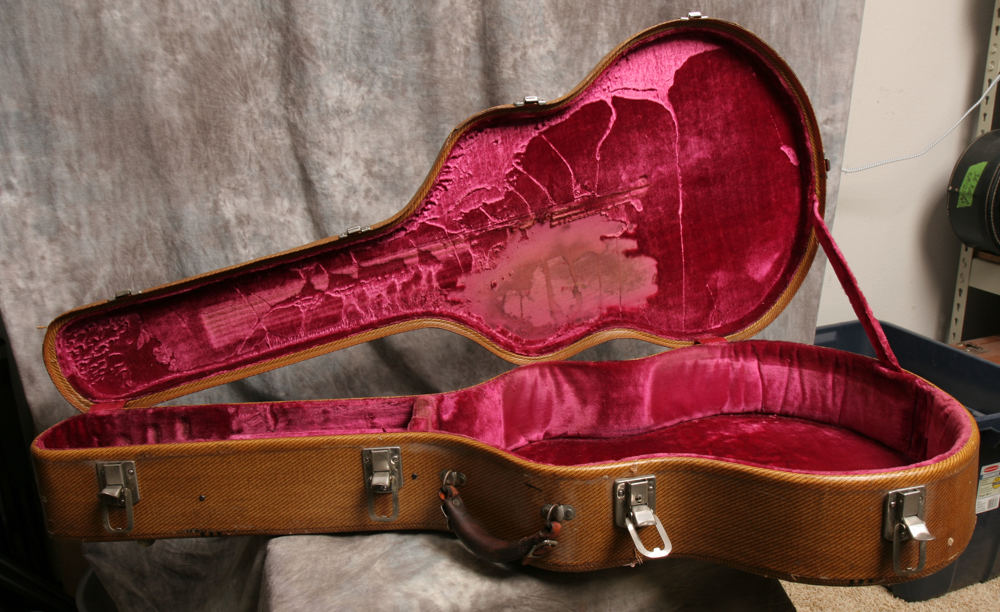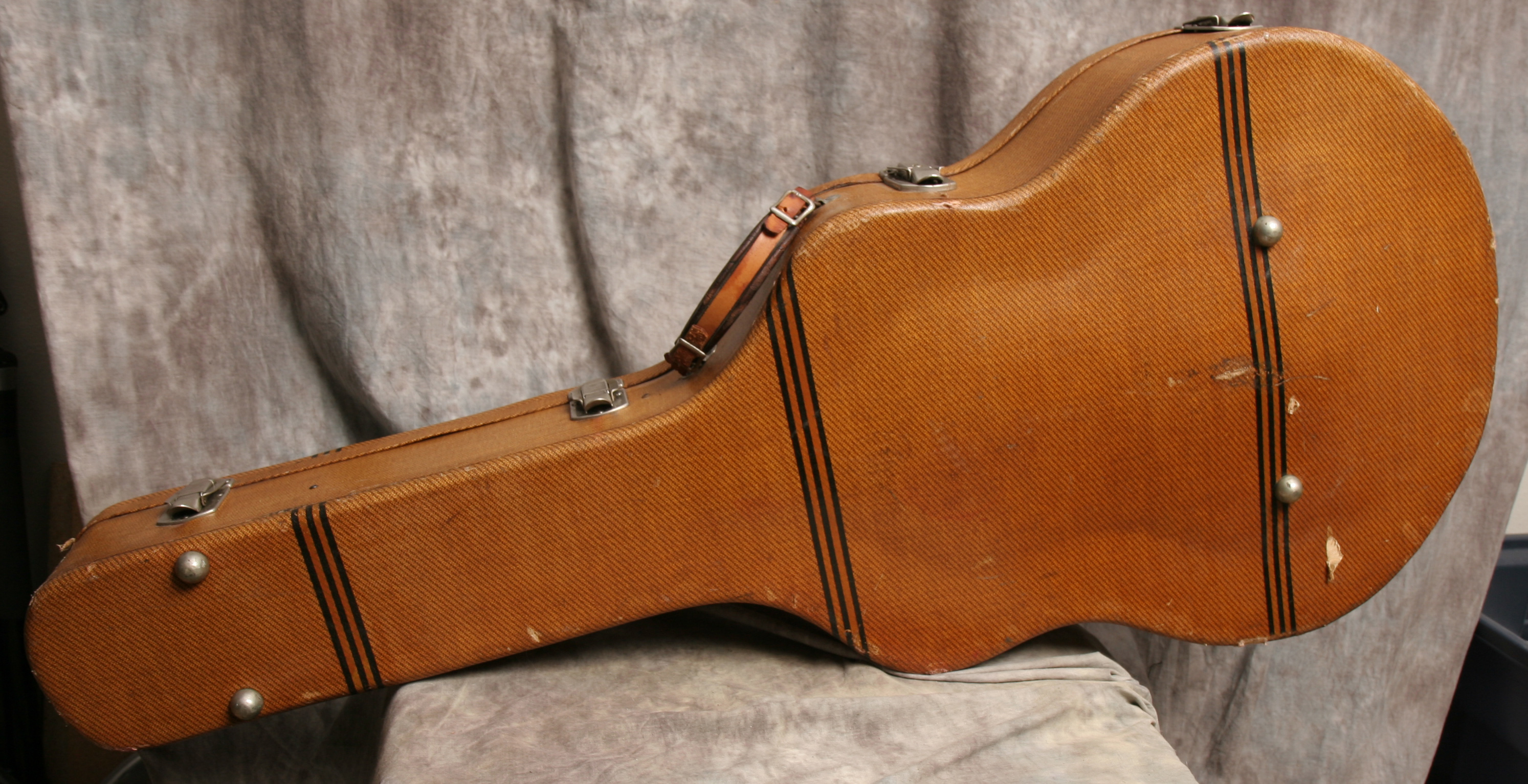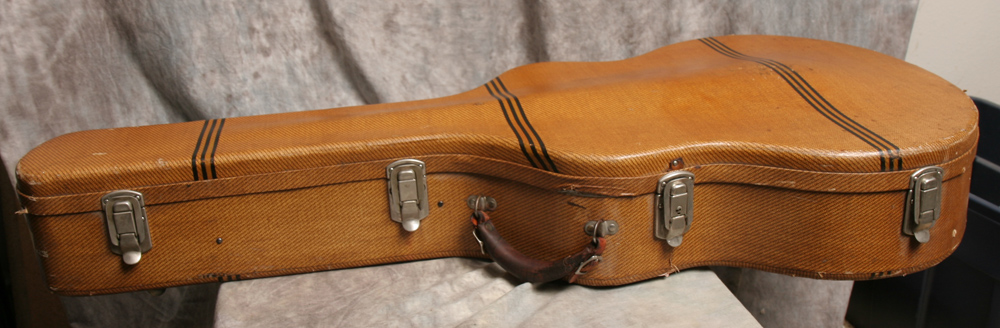 This is one of the finest, most beautiful, and well-built guitar cases ever made, a 1939 (estimated) Geib "Aeroplane" or "Racing Stripe" tweed case. These are legendary among collectors and players for their craftsmanship and style. This is a 17 inch lower bout case, suitable for a Gibson L-5, L-7, and ES-300 guitars. It is also an excellent fit for Gibson J-200 models and other 17 inch guitars. The condition of this case is excellent considering its age. All latches, hinges, and the metal feet are original hardware. The handle is a replacment. The interior has the original pink lining. The only significant wear to the lining is on the underside of the lid, where some of the pile is worn from the pickguard offgassing. The exterior tweed is in excellent shape, with very light scuffing and a few very small tears.
