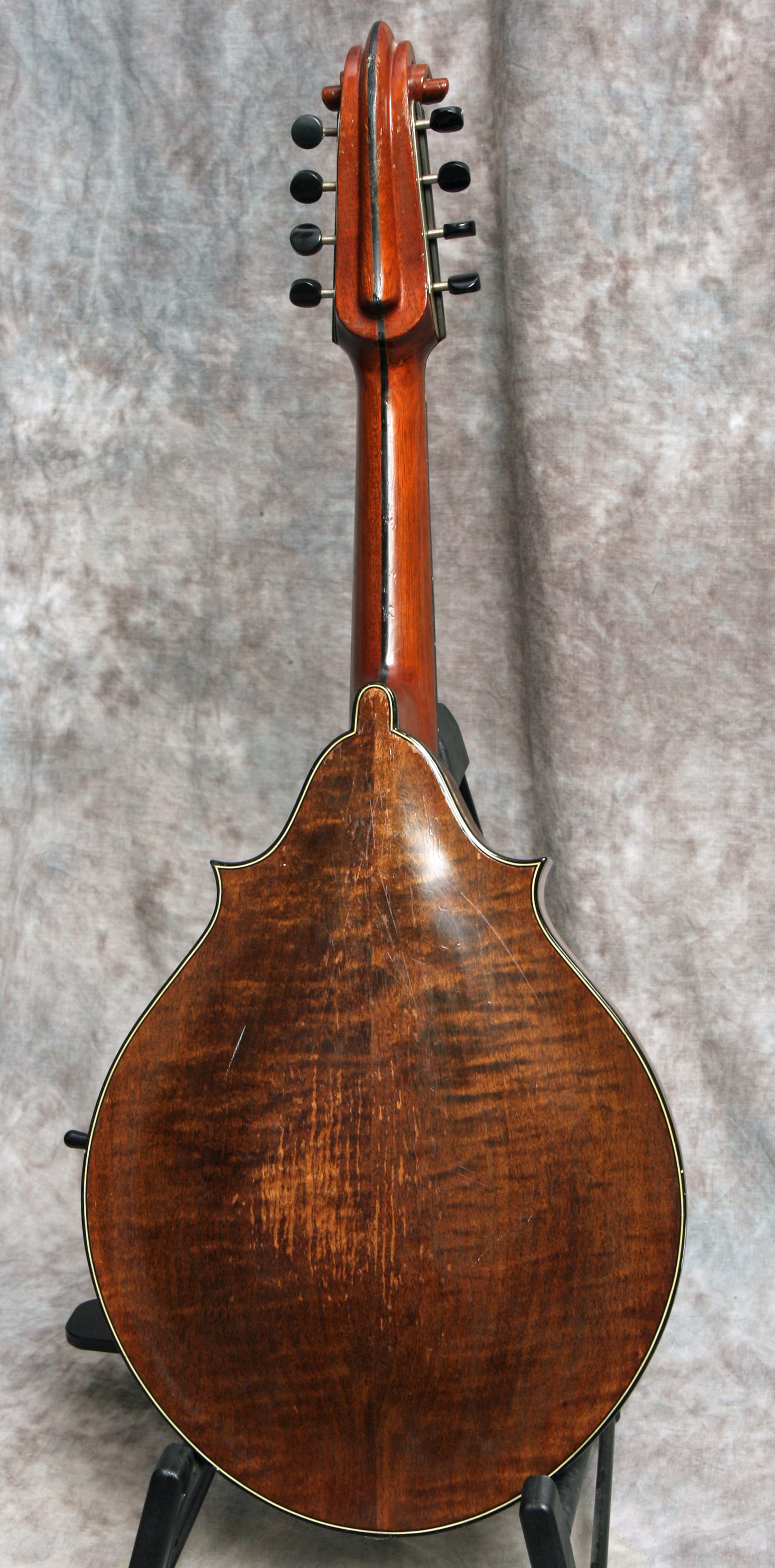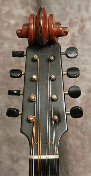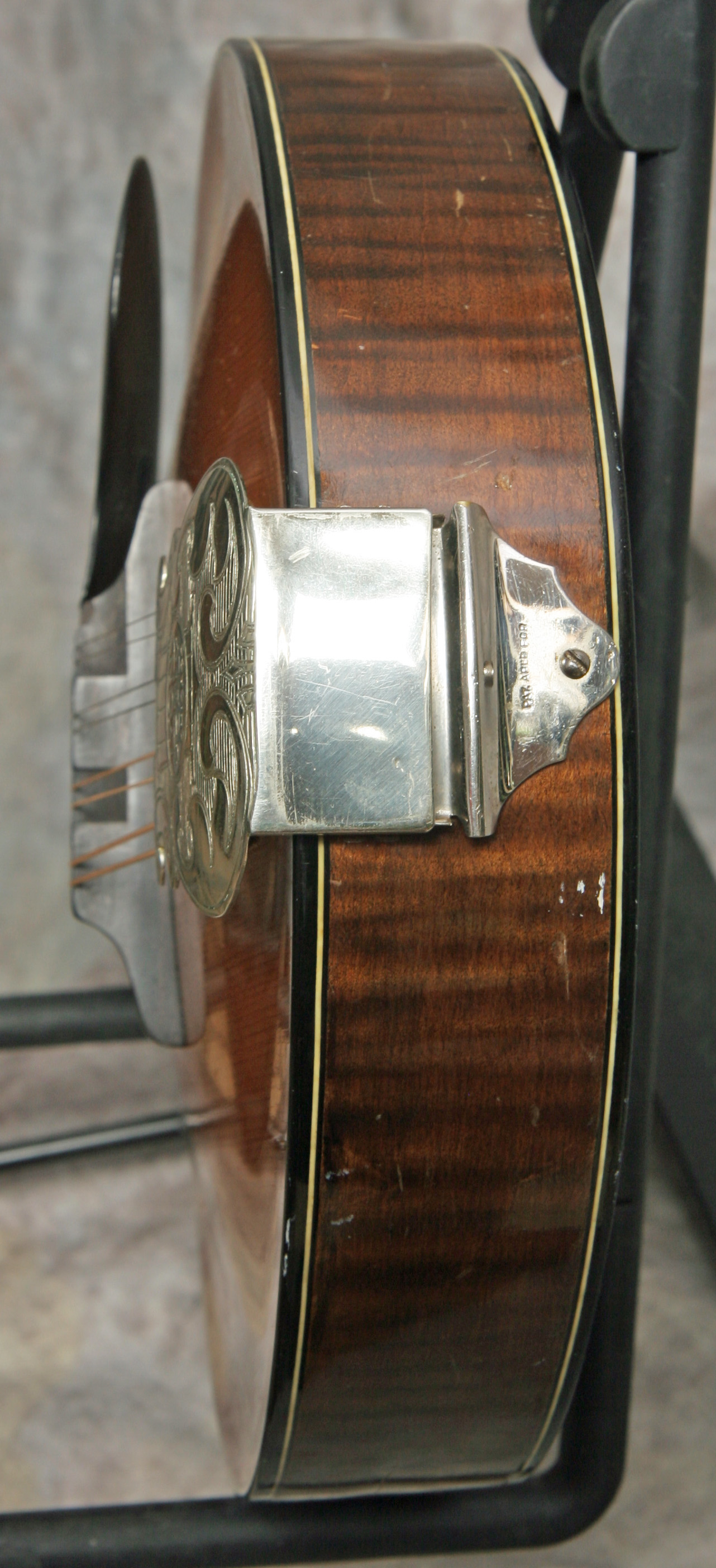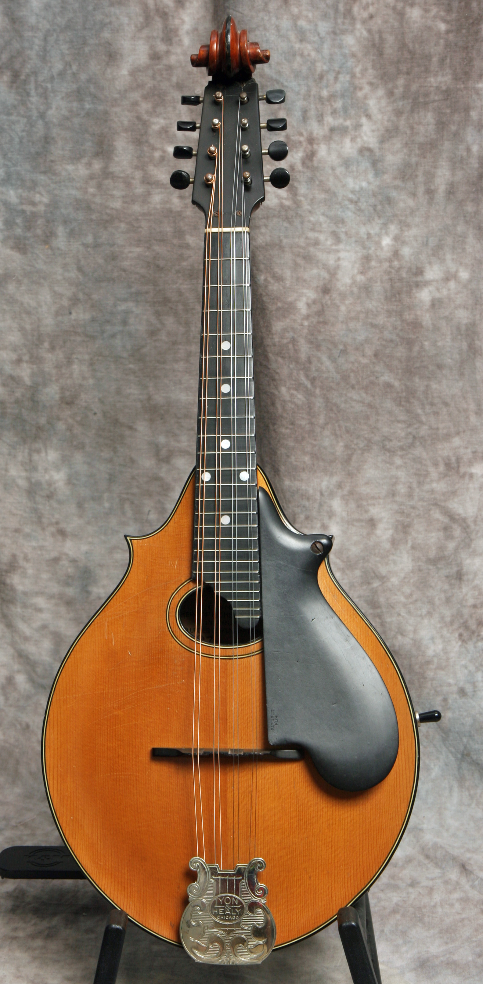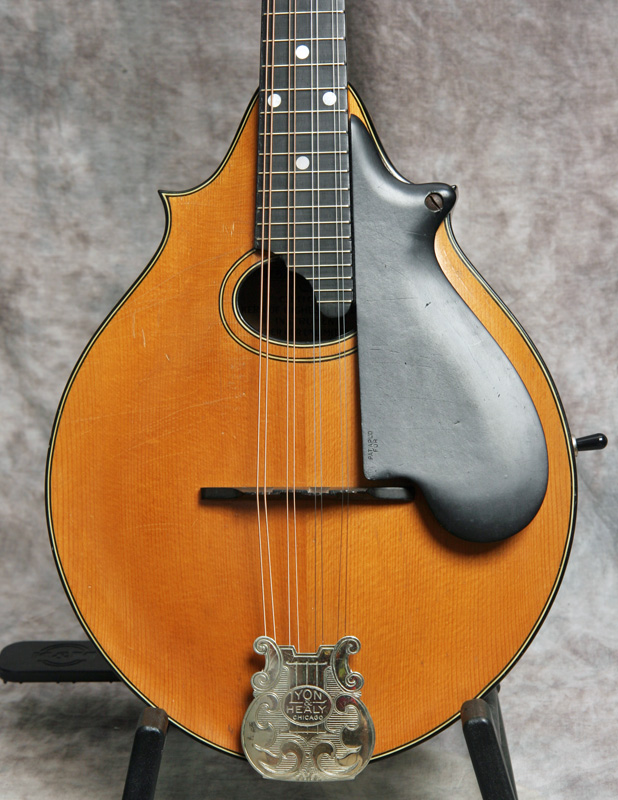 (Serial No. 97) Has a solid spruce top, dark stained back and sides finish, maple back and sides, mahogany neck with ebony fingerboard, period black hard shell case. These elaborate and beautifully made mandolins were the only really serious competition Gibson ever faced in the high-end carved top 8-string market. Lyon & Healy launched this line in a blaze of publicity in the late 1910's and they were built (both under that brand and subsequently "Washburn") well into the depression years. Using the finest materials and a thoroughly original design, Lyon & Healy created a timeless classic in the Style A. The violin scroll headstock is immediately distinctive, but the 2-point body, shaped pickguard, pull-out leg rest and clamp tailpiece cover are all signature features. The sound of these instruments is more delicate and lighter than most Gibsons, with a nicely rounded top end and less "bark". They have been considered since the 1920's to be the best instruments ever made for classical mandolin playing, but have not been much known or used by old-time or bluegrass musicians. We are always impressed by both the sound and craftsmanship of the Lyon & Healy mandolins, and Style A-the top of the line model -is an extremely fine instrument worthy of any player's or collector's attention. Overall length is 25 in. (63.5 cm.), 9 3/4 in. (24.8 cm.) width, and 1 13/16 in. (4.6 cm.) in depth, measured at side of rim. Scale length is 13 3/4 in. (350 mm.). Width of nut is 1 1/16 in. (27 mm.). This mandolin is an excellent player and fairly clean overall, but does have some old restoration work visible. The headstock has a very well done repair on the rear just below the tuning pegs, completely solid but noticeable, with fairly light touch up. This is typical of the L&H scoll headstock mandolins - the back of the headstock rested directly on the bottom of the case. If you accidently dropped the case, you stood a good chance of cracking the peghead. Most of the Style A mandolins I have seen have a crack at the peghead. The screw-on headplate shows a repaired crack as well. There is some fairly noticeable shirt button wear to the back of the mandolin. The rest of the mandolin is fairly clean except for a couple of random dings. It has been expertly set up with by luthier Marty Beeson. It has very good action and sound - an excellent example of what is considered by many the finest mandolin of its type ever built.