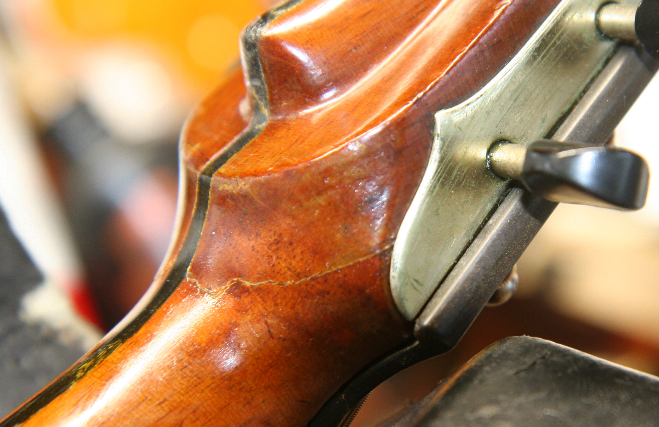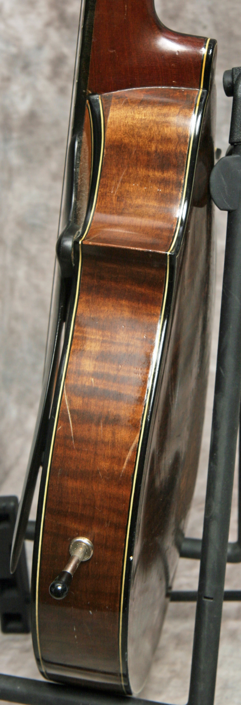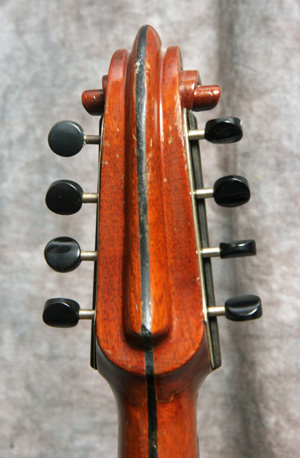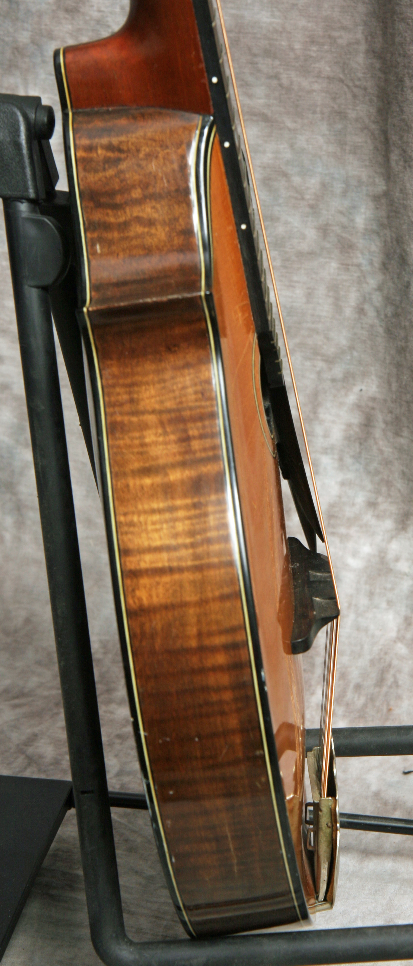 (Serial No. 97) Has a solid spruce top, dark stained back and sides finish, maple back and sides, mahogany neck with ebony fingerboard, period black hard shell case. These elaborate and beautifully made mandolins were the only really serious competition Gibson ever faced in the high-end carved top 8-string market. Lyon & Healy launched this line in a blaze of publicity in the late 1910's and they were built (both under that brand and subsequently "Washburn") well into the depression years. Using the finest materials and a thoroughly original design, Lyon & Healy created a timeless classic in the Style A. The violin scroll headstock is immediately distinctive, but the 2-point body, shaped pickguard, pull-out leg rest and clamp tailpiece cover are all signature features. The sound of these instruments is more delicate and lighter than most Gibsons, with a nicely rounded top end and less "bark". They have been considered since the 1920's to be the best instruments ever made for classical mandolin playing, but have not been much known or used by old-time or bluegrass musicians. We are always impressed by both the sound and craftsmanship of the Lyon & Healy mandolins, and Style A-the top of the line model -is an extremely fine instrument worthy of any player's or collector's attention. Overall length is 25 in. (63.5 cm.), 9 3/4 in. (24.8 cm.) width, and 1 13/16 in. (4.6 cm.) in depth, measured at side of rim. Scale length is 13 3/4 in. (350 mm.). Width of nut is 1 1/16 in. (27 mm.). This mandolin is an excellent player and fairly clean overall, but does have some old restoration work visible. The headstock has a very well done repair on the rear just below the tuning pegs, completely solid but noticeable, with fairly light touch up. This is typical of the L&H scoll headstock mandolins - the back of the headstock rested directly on the bottom of the case. If you accidently dropped the case, you stood a good chance of cracking the peghead. Most of the Style A mandolins I have seen have a crack at the peghead. The screw-on headplate shows a repaired crack as well. There is some fairly noticeable shirt button wear to the back of the mandolin. The rest of the mandolin is fairly clean except for a couple of random dings. It has been expertly set up with by luthier Marty Beeson. It has very good action and sound - an excellent example of what is considered by many the finest mandolin of its type ever built.