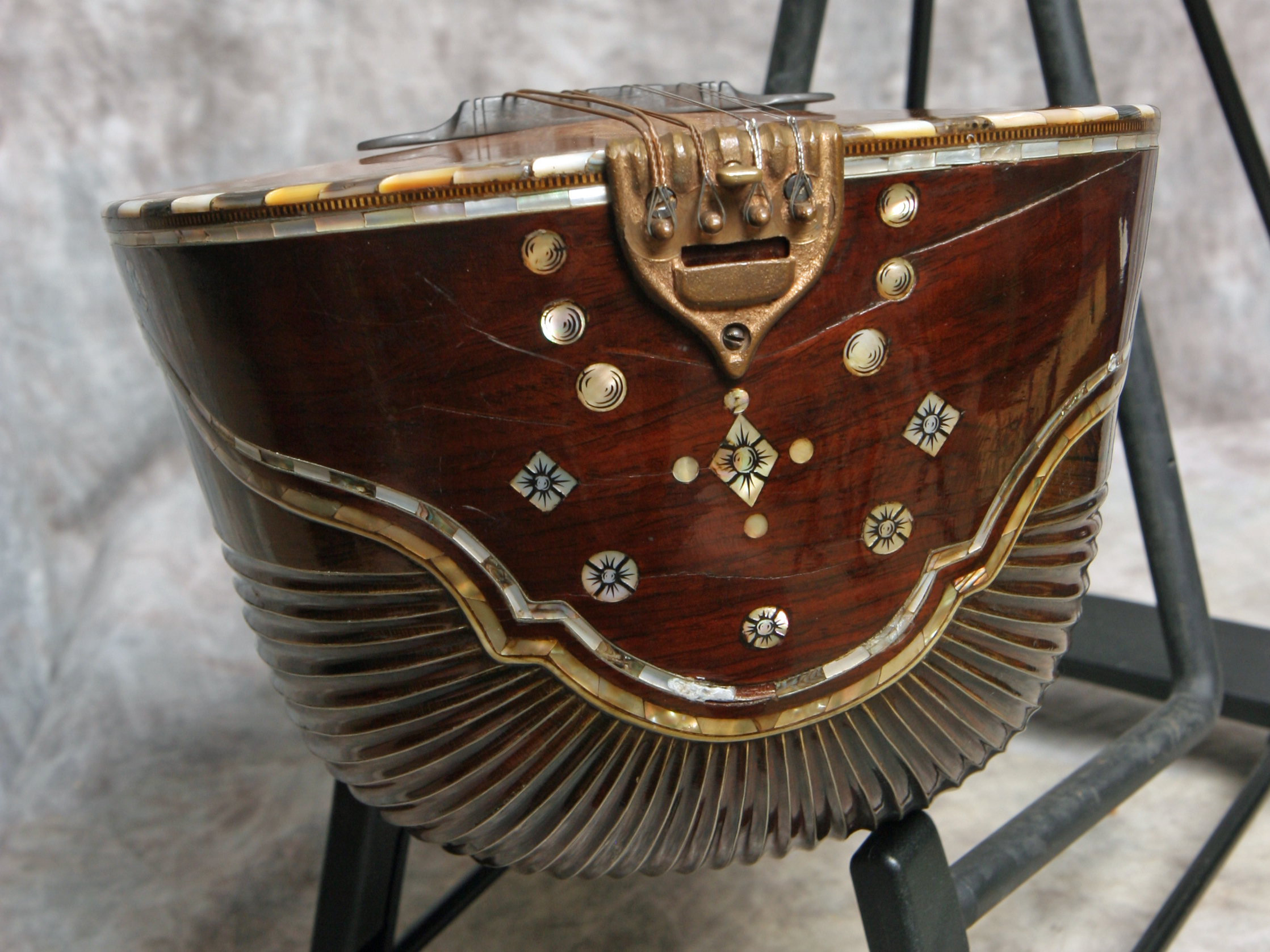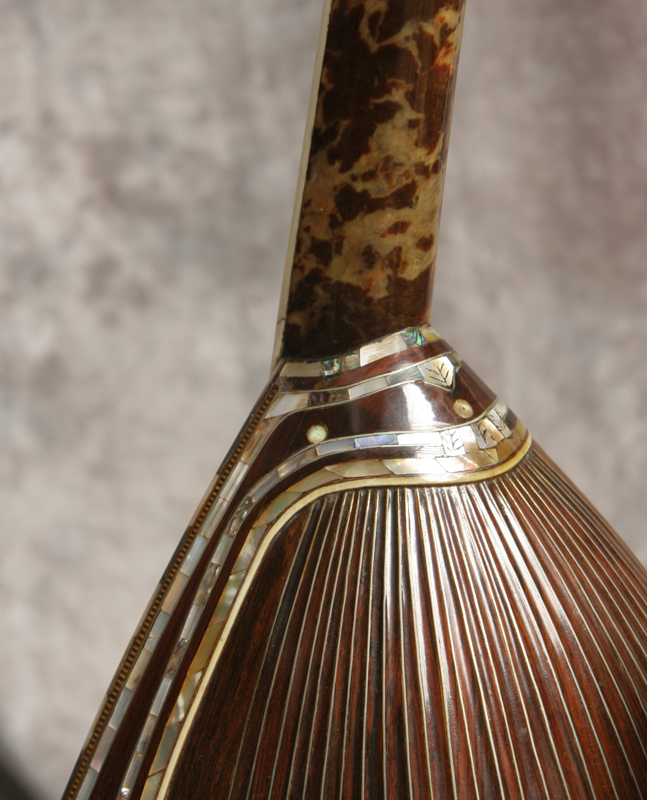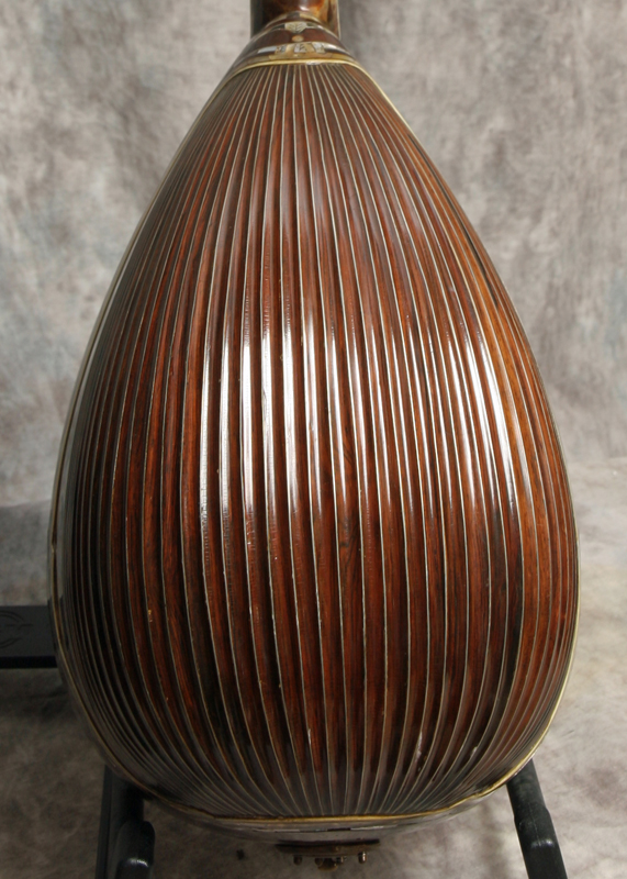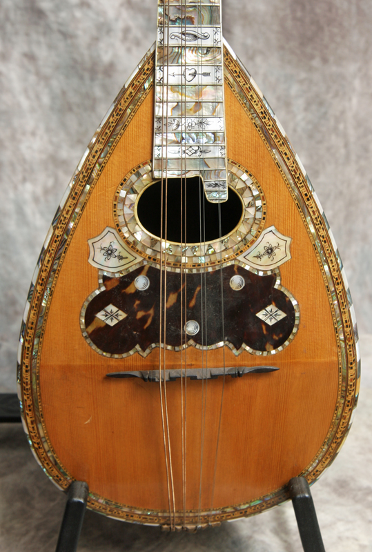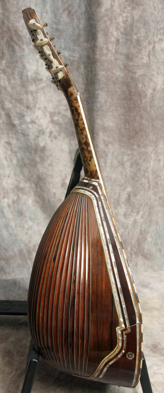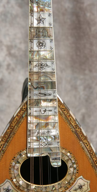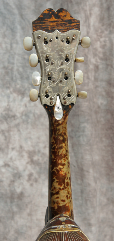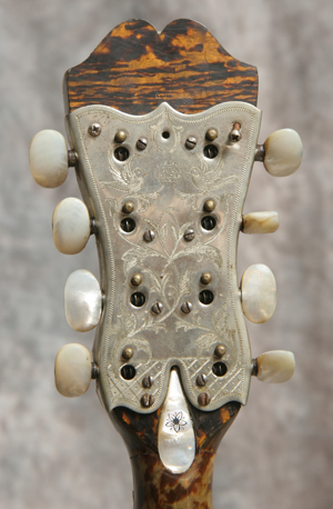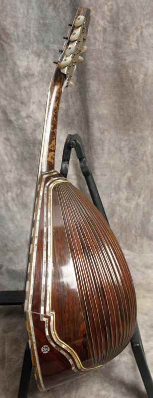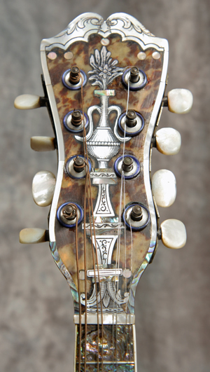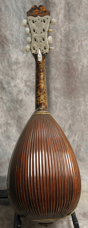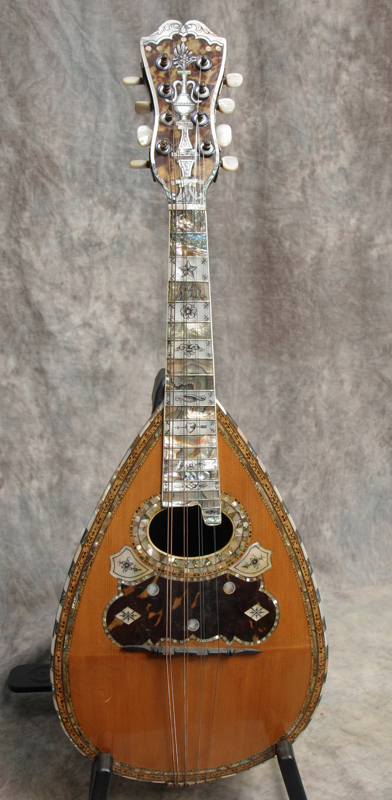 (Serial No. none) Joseph Bohmann was born in Germany and immigrated to the US in 1868 and settled in Chicago. Bohmann had a standing wager of $10,000 (in the early 1900s!) that he could build the fanciest mandolin in the world. This is the instrument he would bring out if challenged. This is a typical bowlback of the period with a canted top of Adirondack spruce. The bowl is Brazillian rosewood with 40 fluted ribs, interlaced between each rib with silver. The are 8 (or 11, depends how you count them) layers of binding. The fretboard is engraved abalone and pearl. The back of the neck is overlaid with genuine tortoise shell, and the front pickguard is tortose shell as well. The small volute on the back of the peghead is snail pearl. The tuners are enclosed with an engraved German silver backplate dated 1891. The tuner buttons are genuine pearl, and the tailpiece is one piece cast bronze. There is extensive pearl inlay everywhere, even on the bottom of the bowl. The bridge is a modern replacement. Comes with a period hard case.