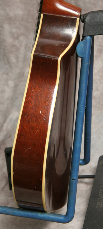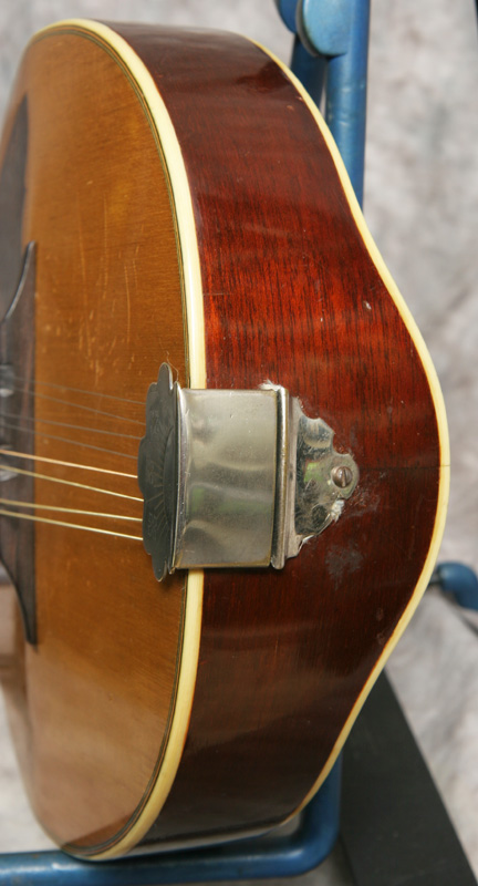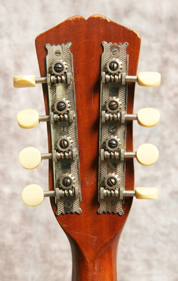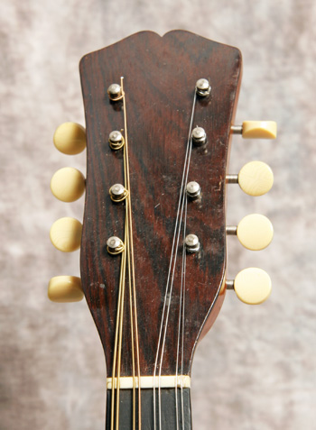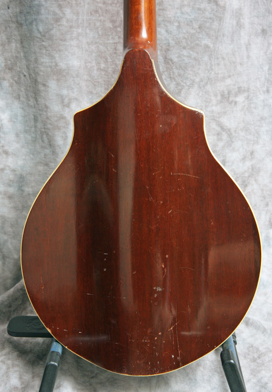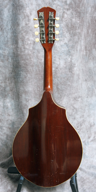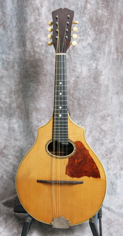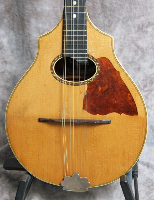 (Serial No. 35978) Excellent structural condition showing some playing wear. The serial number puts the manufacture date around 1918 - I might be a year off in either direction - there is no exact list of Vega mandolin serial numbers. The cylinder back refers to a cylindrical bulge running longitudinally along the back plate, from the tailpiece to the neck heel. This bulge increases the internal volume of the instrument. The result has been described as a compromise between the earlier bowlback mandolins and the more modern styles with relatively flat backs. This is a Style 202 with a mahogany body and a spruce top. Has an ebony fretboard and bridge. The bone nut is 1 1/8 inch on a flat fretboard. Has a nice herringbone style soundhole rosette and multi-ply top binding with single ply back binding. Original tuners and fancy engraved tailpiece cover. All finish and hardware are original. Excellent sounding mandolin with a sweet tone, not really a bluegrasser but it is excellent for recording or for just having a nice mandolin around.Here is a link to a video of the mandolin as played by James Hurlburt. Good volume and tone. Comes with the probably original hardshell case.