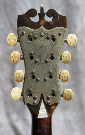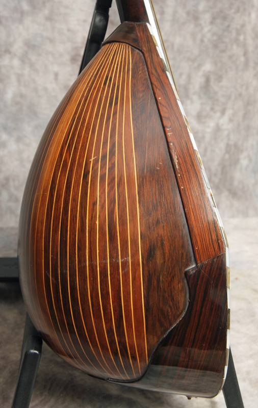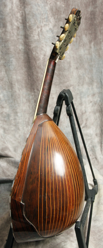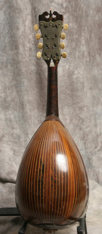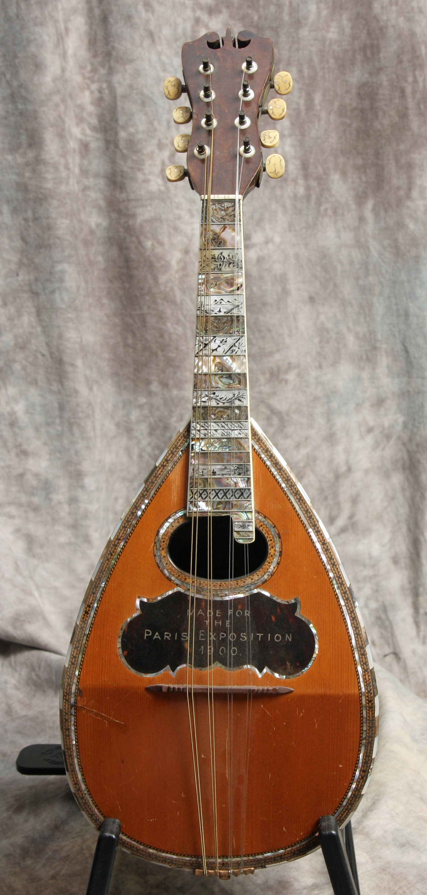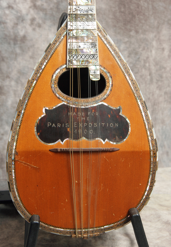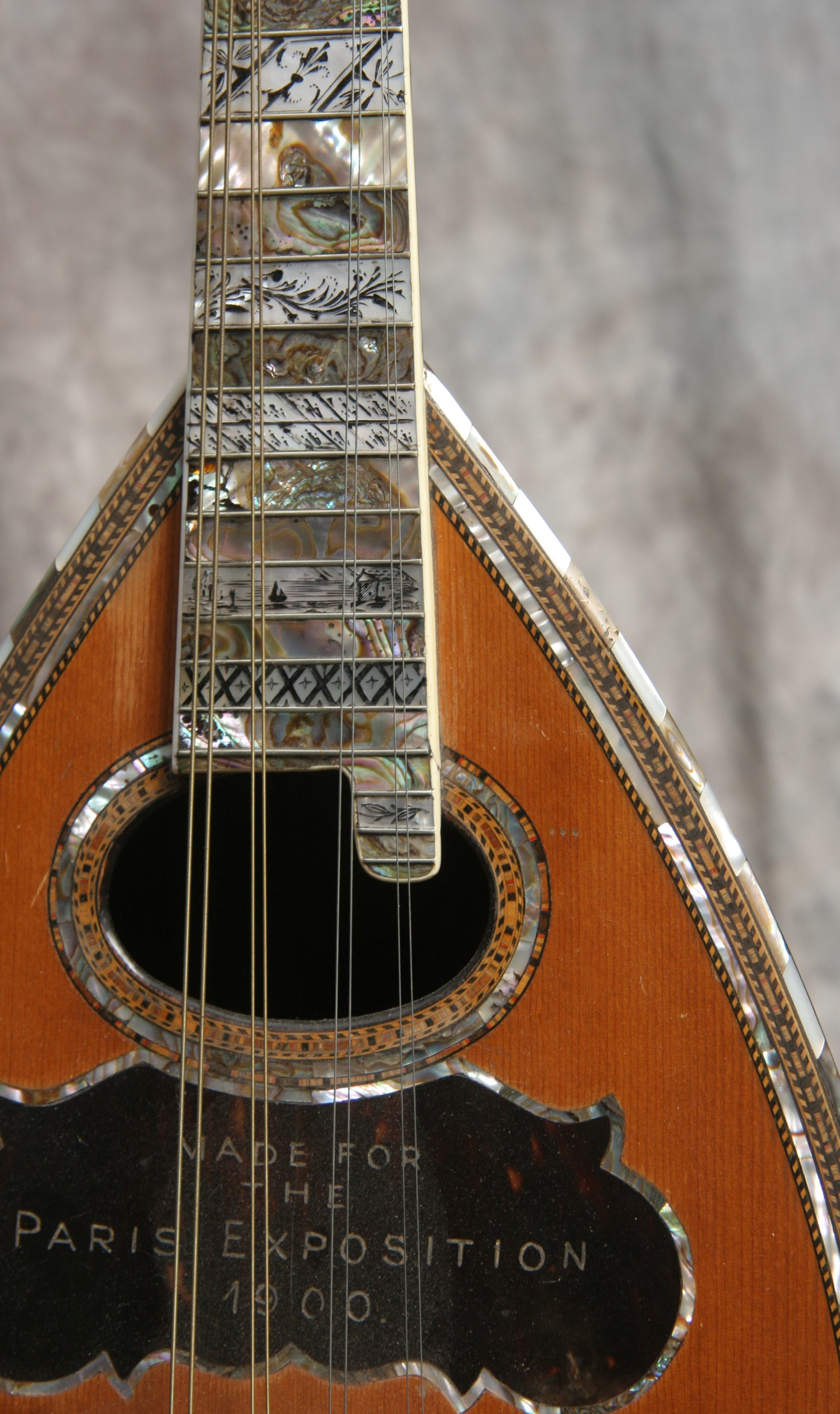 (Serial No. none) Joseph Bohmann was born in Germany and immigrated to the US in 1868 and settled in Chicago. This mandolin was built to showcase the Bohmann mandolin at the Paris Exposition of 1900. In fact, that phrase is written on the pickguard. This is a typical bowlback of the period with a canted top of Adirondack spruce. The bowl is Brazillian rosewood with 38 ribs, interlaced between each rib with a strip of lighter colored wood. The are 6 (or 10, depends how you count them) layers of binding. The fretboard is engraved abalone and pearl. The back of the neck is overlaid with genuine tortoise shell, and the front pickguard is tortose shell as well. The small volute on the back of the peghead is snail pearl. The tuners are enclosed with an engraved German silver backplate dated 1891. The tuners are fitted with Handel buttons inlaided with pearl and silver wire, and the tailpiece is one piece cast bronze. The bridge is Brazillian rosewood. Comes with a period case.