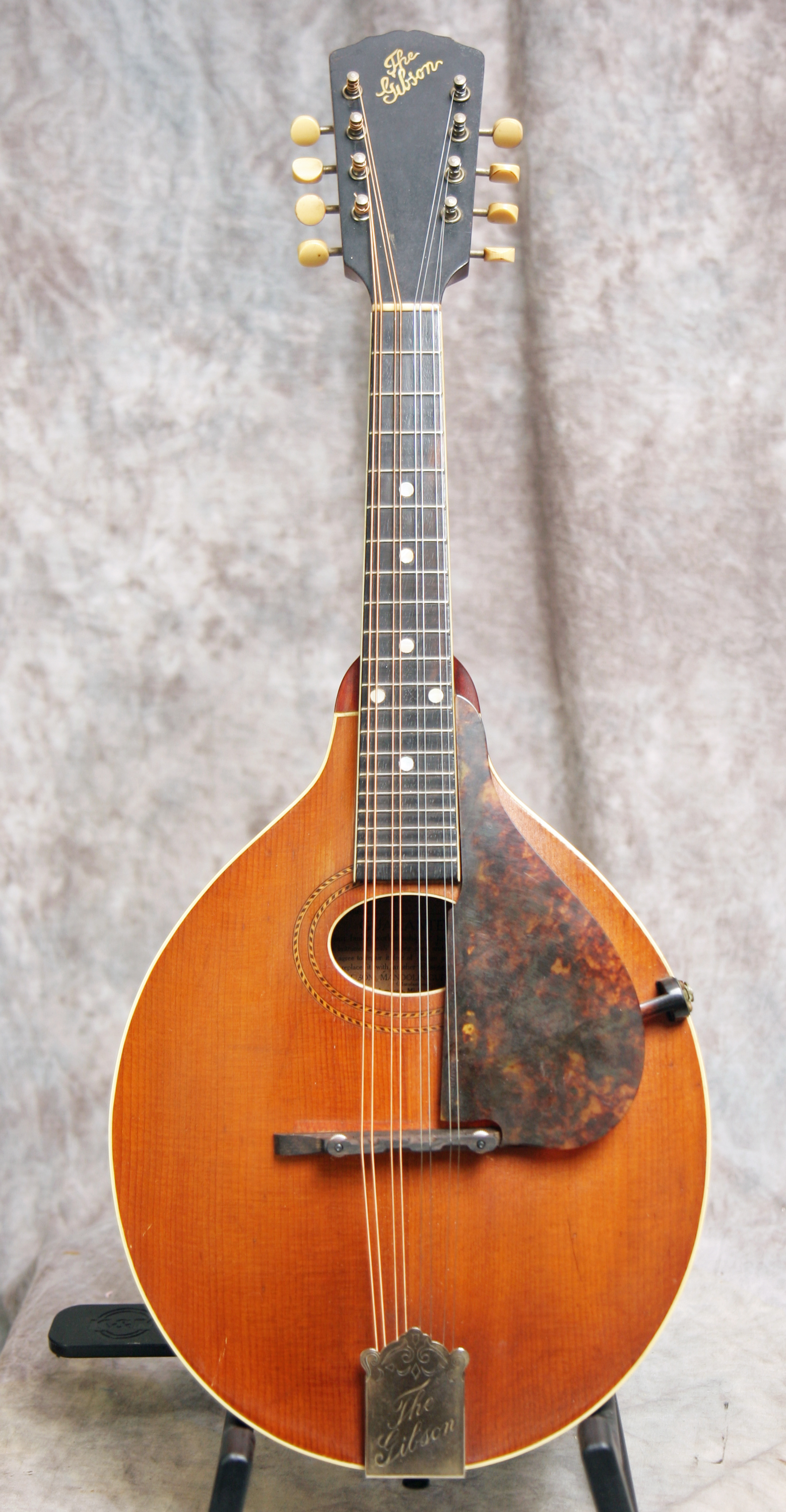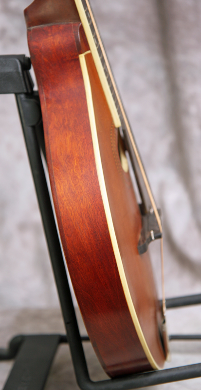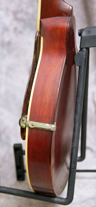 (Serial number 28062) Excellent condition. Pumpkin top finish with dark back and sides. Has the logo in the peghead, top bound only, unbound fingerboard, original Gibson label inside. All finish and hardware is original except the bridge is a modern Loar replica. Shows very little pick wear, neck is straight, frets are fine. No repairs or refinish noted. Just set up by luthier Marty Beeson so it plays nice and easy with good volume and tone. Excellent for Celtic, old time and jazz. Here is a short video clip of this instrument played by Nathan Beaumont of the Remedy Tree band in Brandon, FL. Comes with the original hard case.