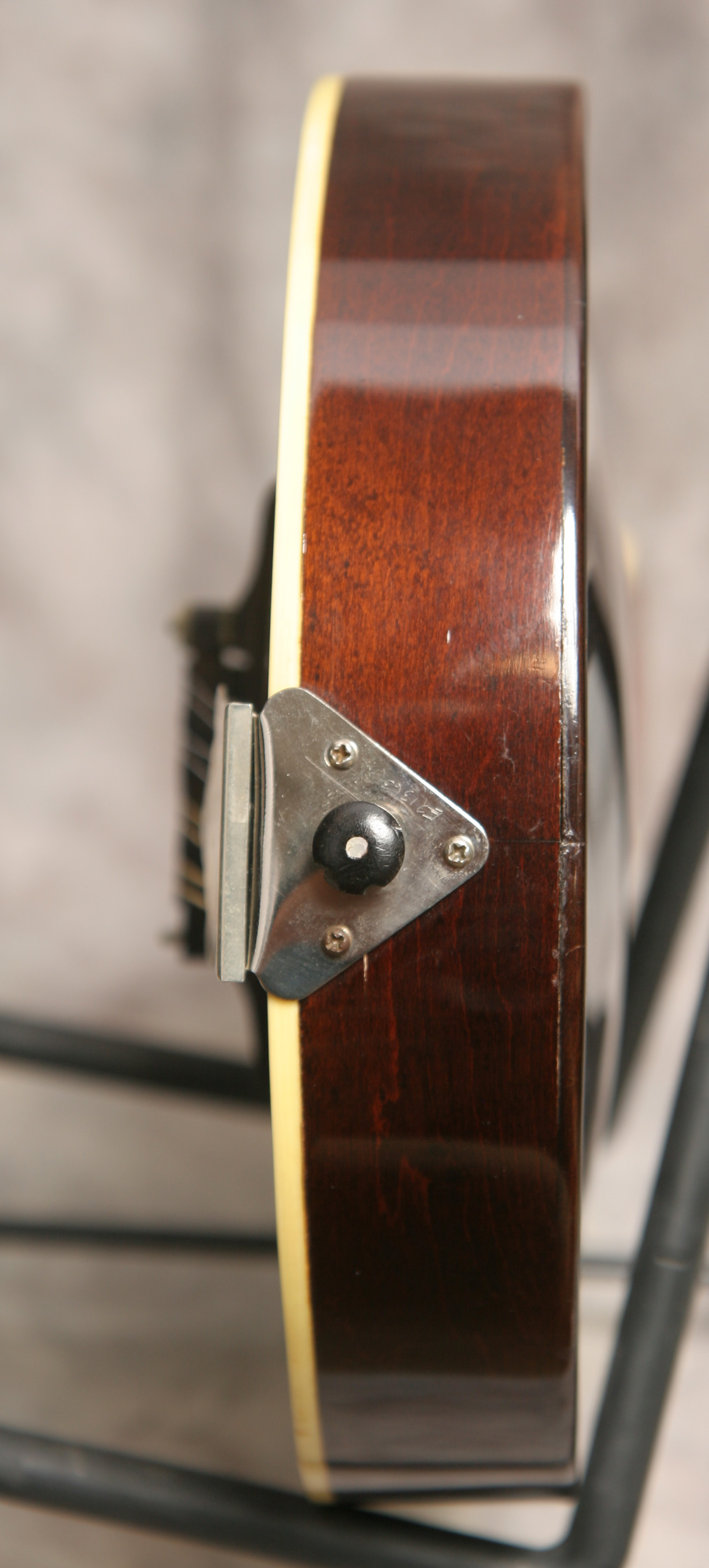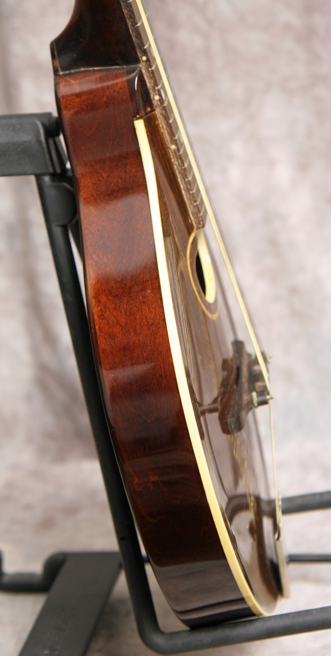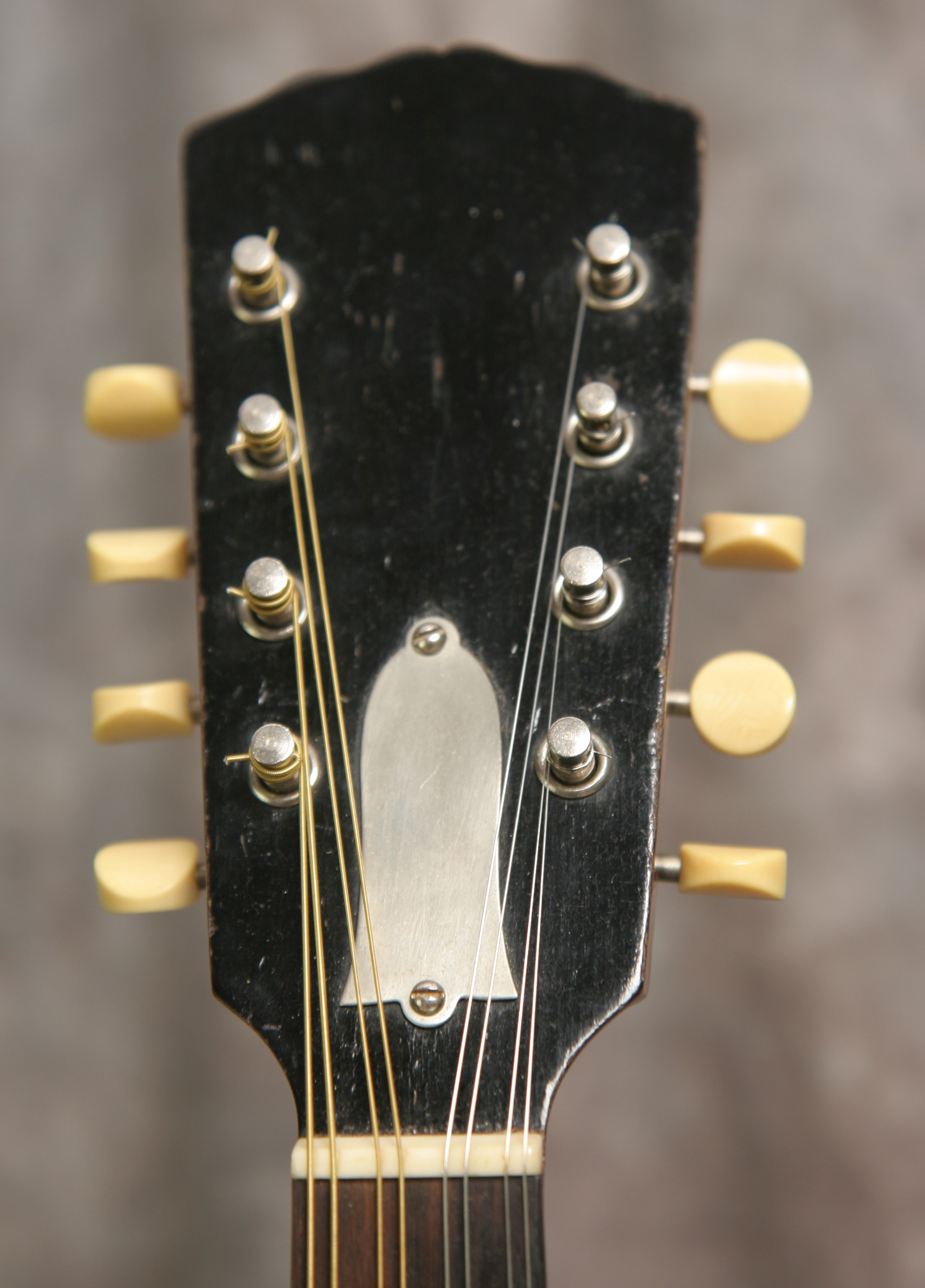 (Serial number 69091 FON 11627) If you are looking for a good session mandolin this is your mandolin. Here is a 1922 Gibson A style mandolin. Just an "A", so its top bound only and does not have the pearl logo. Its a very clean appearing mandolin with a good round woody oval hole sound. It does have the Gibson label inside and, importantly, it has the adjustable truss rod. This lets you set the mandolin up for your local climate and allows you change it easily if needed. Keeps the neck straighter, too. 1922 is the beginning of the Loar improvements to the mandolin such as the adjustable truss rod and adjustable bridge. You have the slightly wider paddle peghead neck and the truss rod. Plays smoothly with excellent volume and tone. My luthier just dressed the frets and set it up - its ready to play. No breaks,cracks or repairs. The mandolin is very clean - too clean, I think. The back of the neck has been refinished, and it looks like the rest of the mandolin was at least oversprayed, as I do not see the small finish crazing I expect to see. However, whoever did this work knew what they were doing. Its a professional job. Black top finish and brown back and sides. The hardware is original, but it is missing the pickguard. The nickle silver truss rod cover was only used for about one year. Comes with a newer hardshell case.