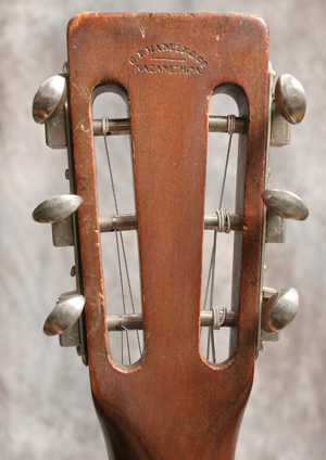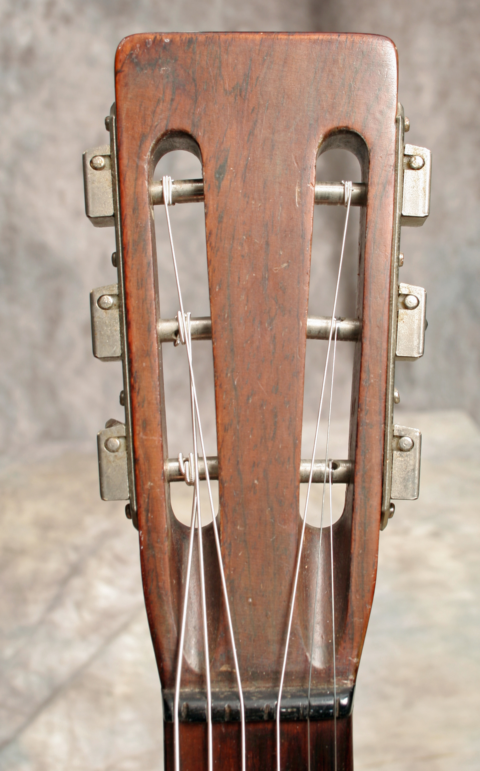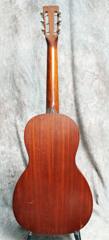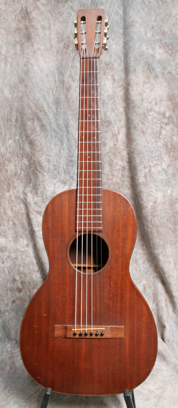 (Serial No. 19292) Excellent condition. These small body all mahogany Martins are great for blues, with that warm sound only a mahogany top will give. Its only 12 inchs wide at the lower bout with a 24 inch scale, 1 3/4 inch nut and 2 3/8 inch bridge spacing. The slot head tuners were replaced in the 1960s with Klusons. The finish is original and the guitar retains the original bar frets. Action is good. The saddle is most of the way down but it plays wonderfully as it is. The only repair noted is a small ding repaired near the endpin on the bottom edge of the guitar. Its a perfect travel or sitting on the couch guitar. Has a huge sound all out of proportion to the small size. It also makes a dynamite slide guitar; string it up with mediums, tune it to open G, and roar! Comes with a newer hardshell case.