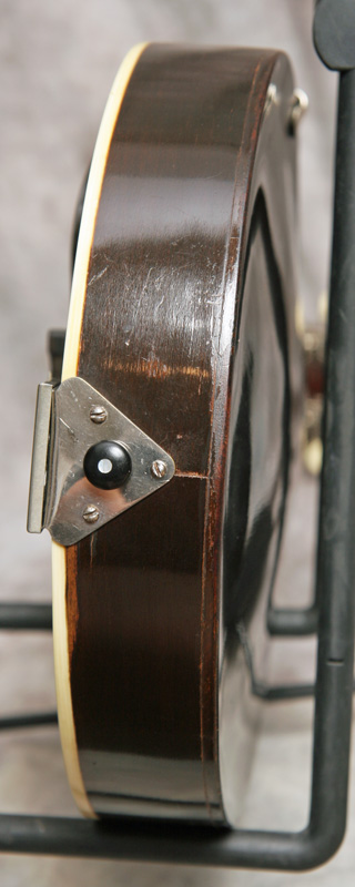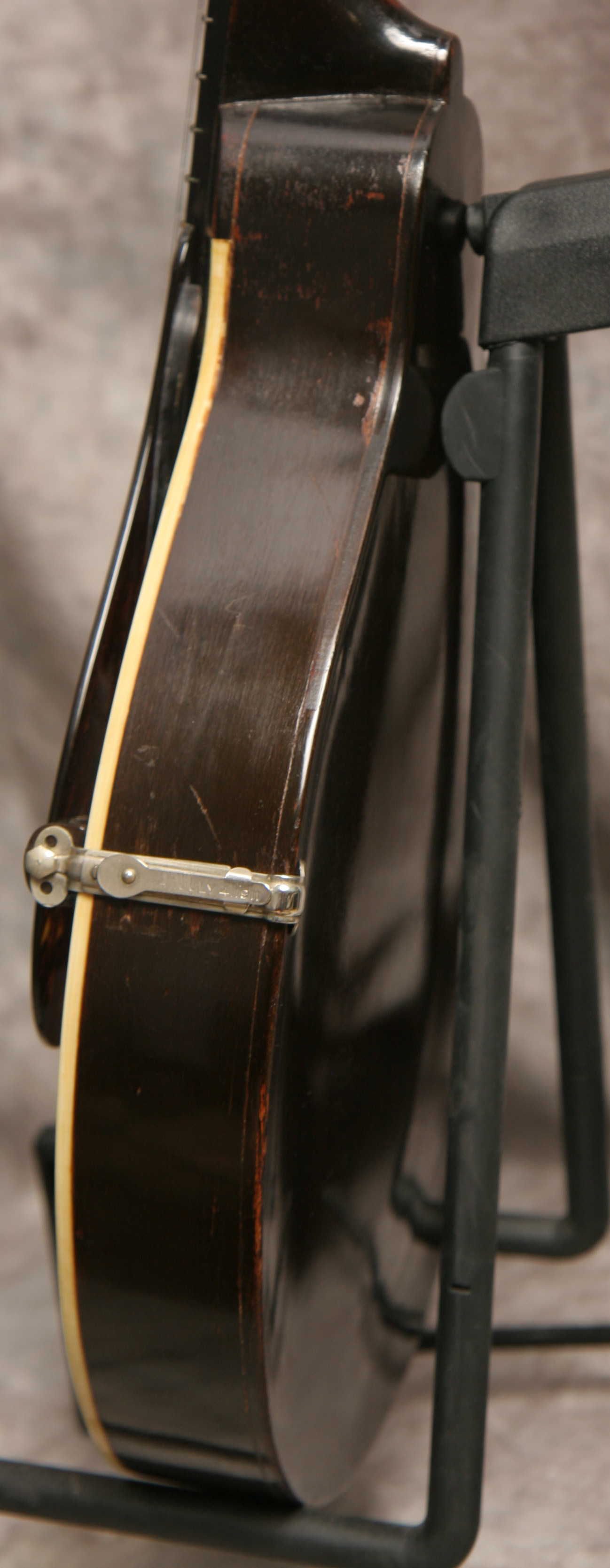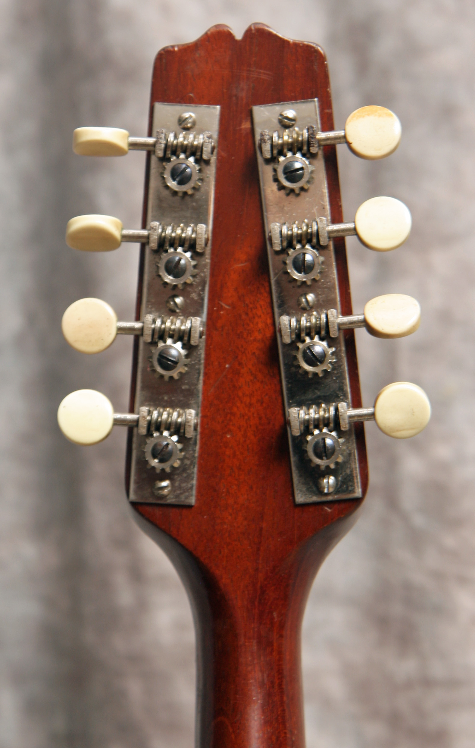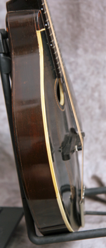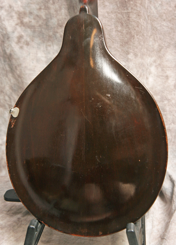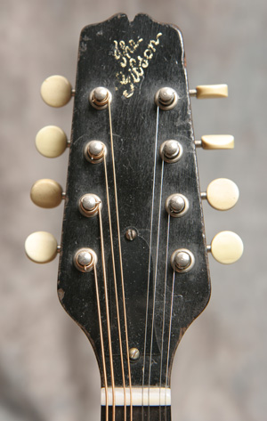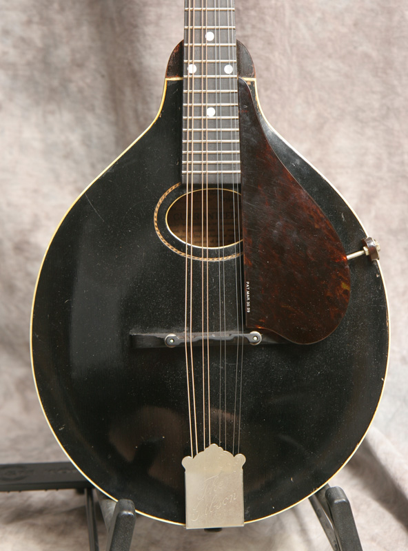 (Serial # 79131) Excellent condition. Snakeheads are considered the best sounding of Gibson oval hole mandolins, as they ring out and punch well. Black top finish and a brownish back and sides. Original Gibson label inside. This is the "A1" model with a silver painted logo, top bound only. Finish is original as is all hardware. Its a nice loud mandolin in excellent condition, with excellent tone. Plays easy with a nice low action. Shows a little picking and case wear. Excellent for Celtic, old time and jazz. Comes with the original hardshell case.