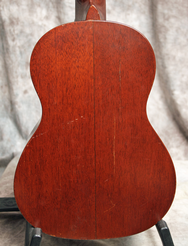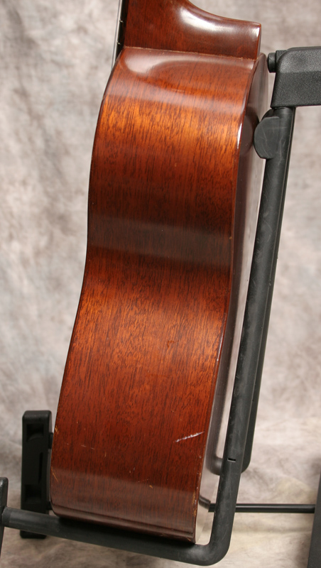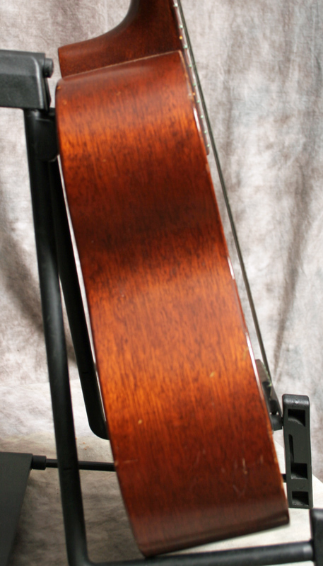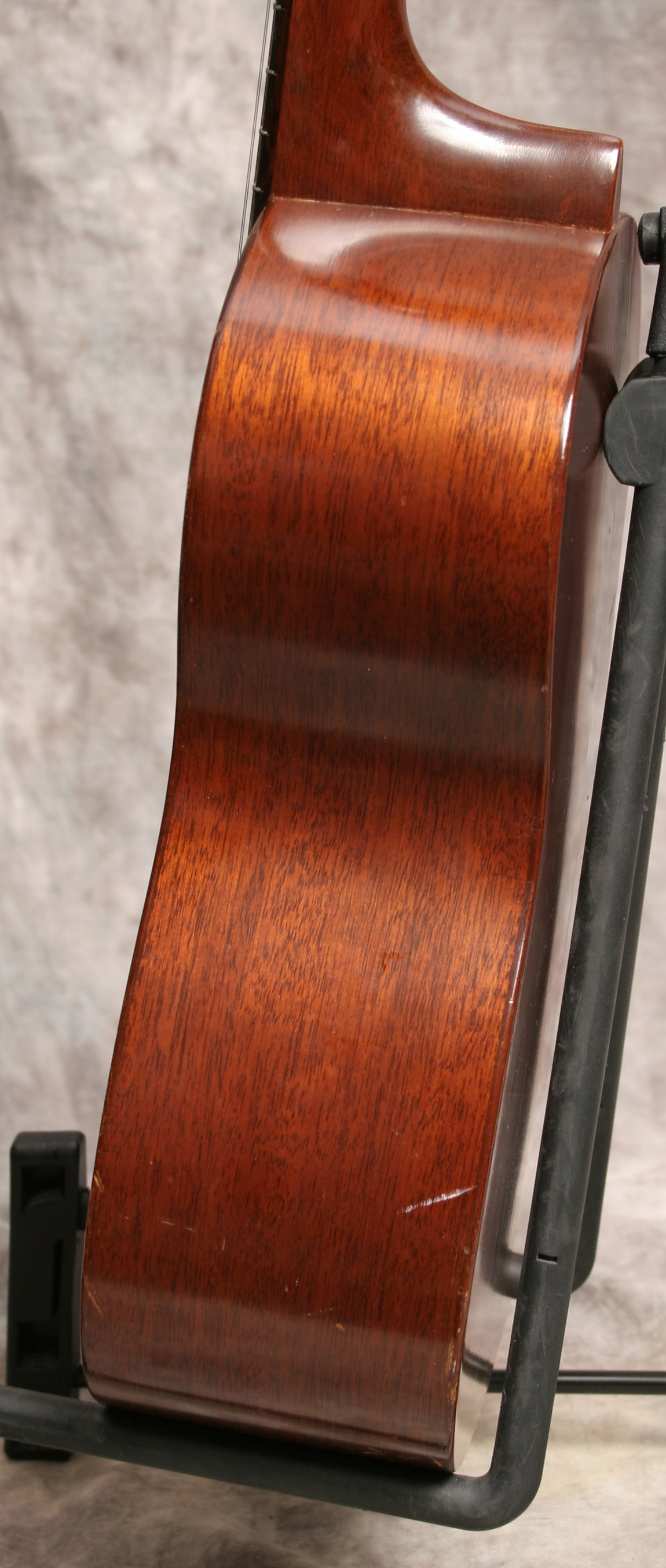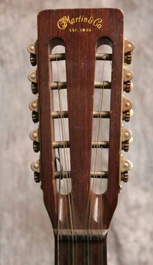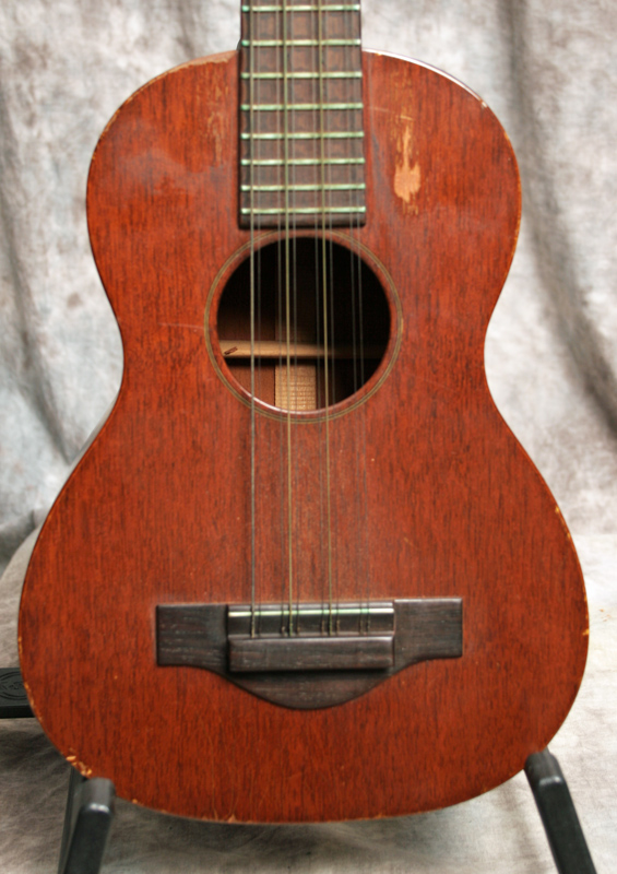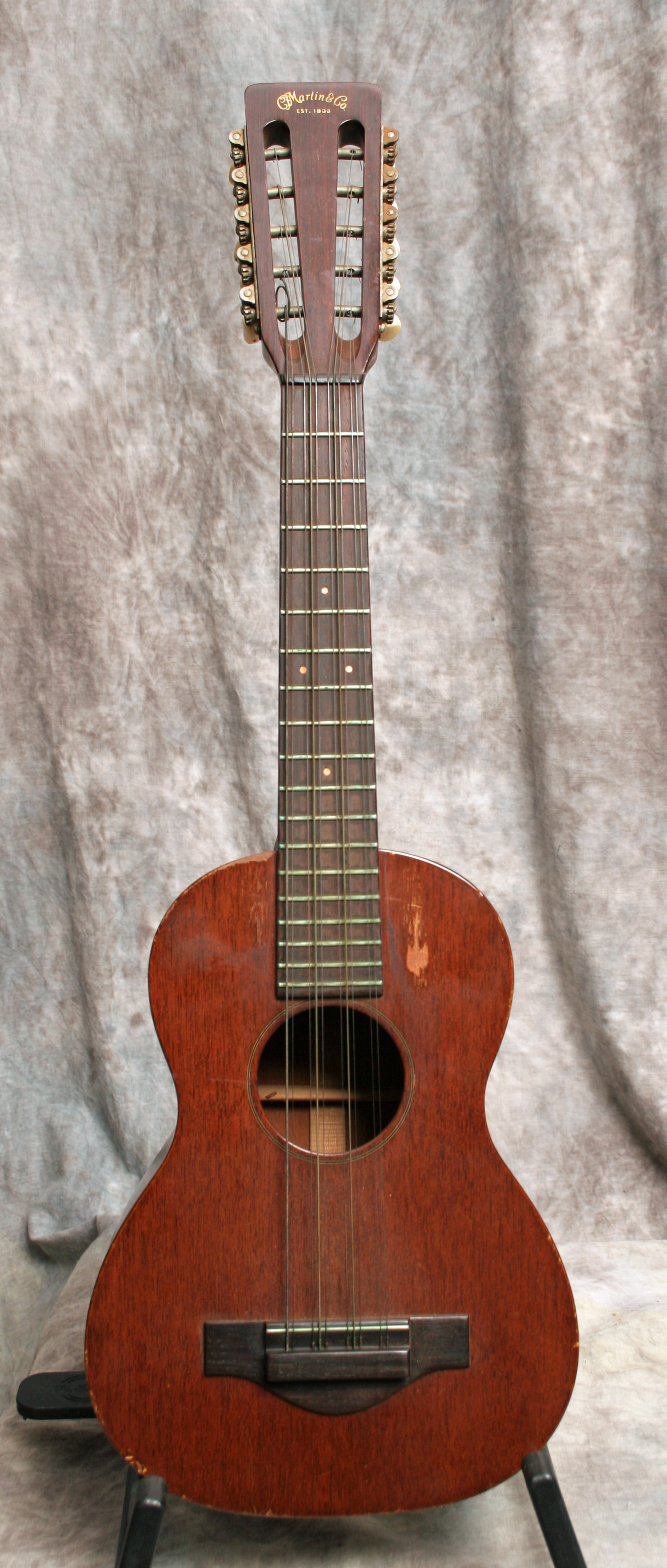 (Serial #175315) Excellent condition with one repair. If you have been curious about playing a tiple, here is one that is priced right and it plays and sounds fantastic. The instrument set up by luthier Marty Beeson. The neck is straight, the frets were dressed, and as noted before it plays and sounds great. Think of a tiple as an ukelele with 10 steel strings and is tuned A-D-F#-B. The first and fourth strings are double, like a mandolin, while the second and third are triple with the center string tuned an octave below the outer strings in each group. The firsts are tuned in unison. In this standard tuning you can play harmonies to everybody else’s guitar and make a major contribution to the ensemble. If you have never heard swing jazz on a tiple you are missing a treat! Natural lacquer finish, all mahogany body and neck, rosewood fingerboard and bridge, and original ebony nut. Finish and hardware are original. There is one repaired back crack. It has the Martin decal on the peghead as well as stamped inside. While not well remembered now, numerous small African-American string-swing ensembles of the 1930's and '40's made extensive use of these small but loud instruments for fast melody work and rhythmic strumming. Two of the best known were the Spirits Of Rhythm (featuring guitarist Teddy Bunn) and Cats and the Fiddle, where Tiny Grimes got his professional start. Overall length is 27 1/2 inches, and the nut is 1 1/2 inches. Has the cool jangly sound you are looking for. Comes with a recent hard shell tenor uke case that fits well.