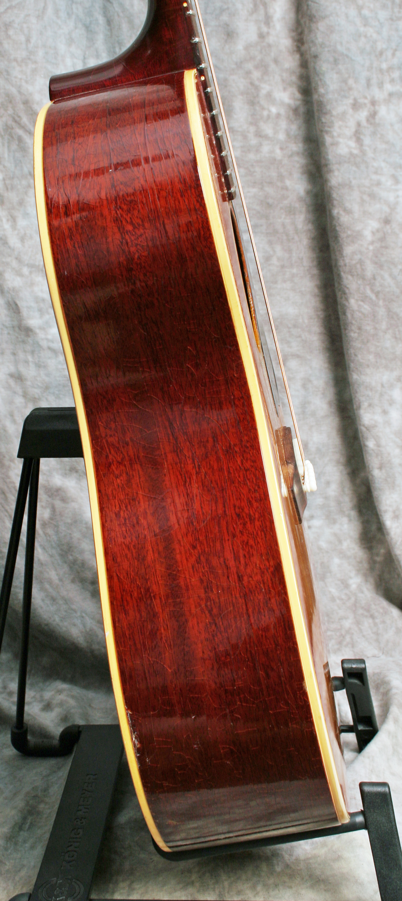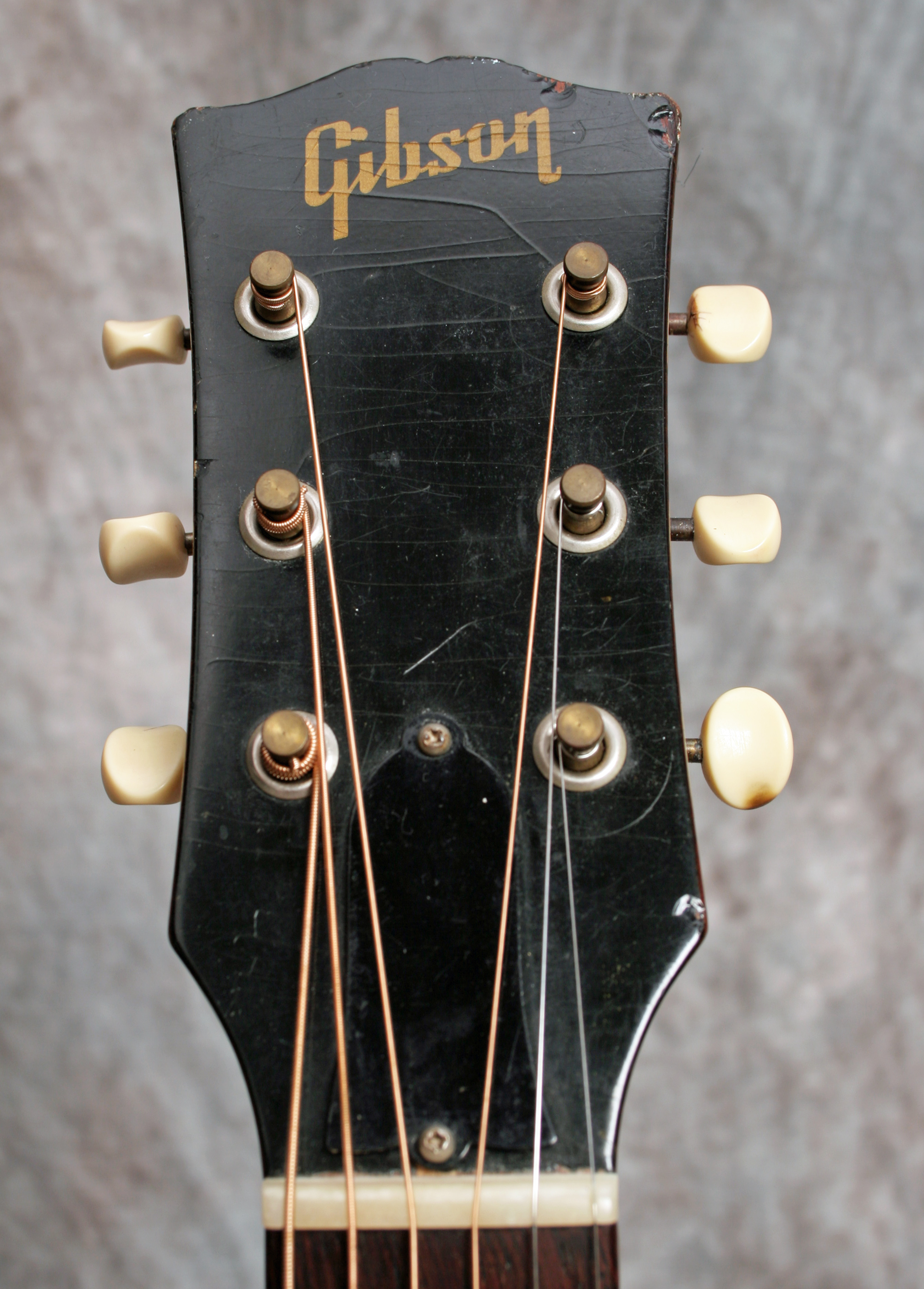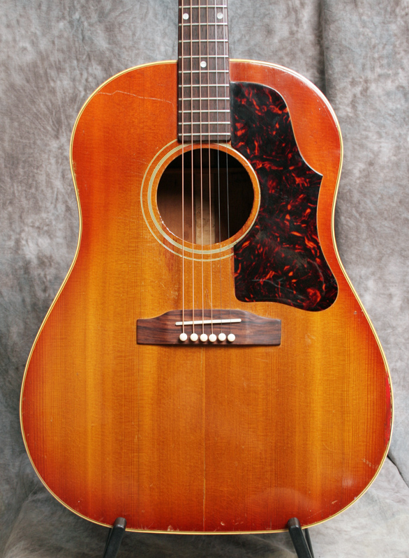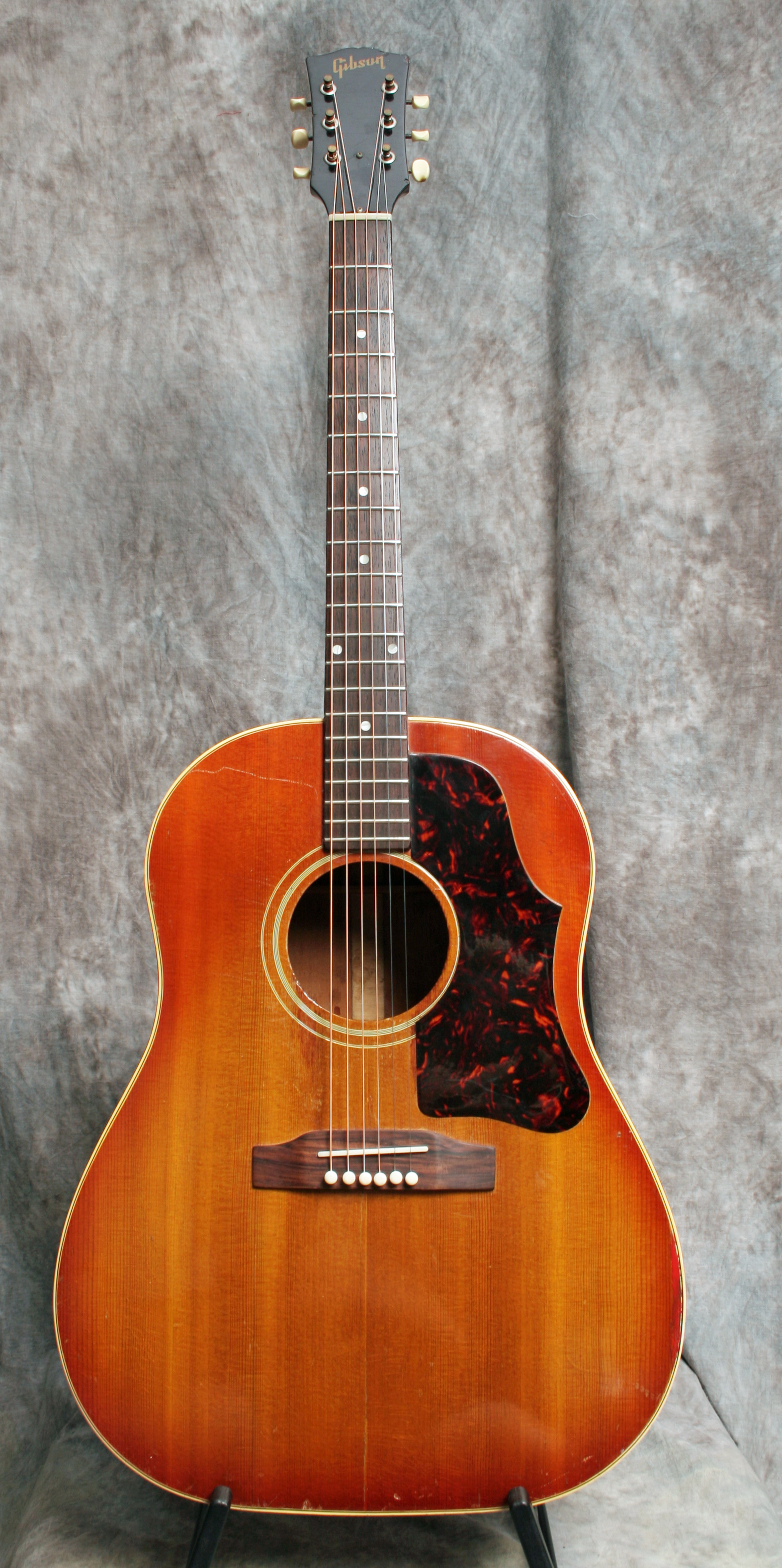 (Serial No. 142771) Excellent minus condition showing some typical playing wear. I think the slope shoulder Gibsons are about the best around for backing up fiddle tunes. I guess others think so too, as they are hard to find and hard to keep in stock. Desirable slope shouldered body style, spruce top with a classic muted cherry sunburst top finish that has faded out like a Les Paul burst, natural finish mahogany back and sides, exact repro Kluson single line tuners, a thin tortoise guard, and probably a replacement Brazilian rosewood bridge. Most Gibson acoustics in 1963 came with a plastic bridge and adjustable saddle - not one of Gibsons better ideas - and the plastic bridge would soon warp or crack from the string tension. An exact replacement Brazilian rosewood bridge with a fixed saddle is considered to be an upgrade to the original, and certainly improves it tonally. No repairs noted and none are needed. Classic wide/flat neck with a Brazilian rosewood fretboard and standard 1-11/16 inch nut, frets are fine with a few minor fingerboard divots in the first three frets, neck is straight and has the steeper pre-65 headstock pitch and the tall thin braces like the Hummingbird, which seems to give better tone. There is a repaired back crack that is cleated and should not pose a problem in the future. Plays nicely as it was just set up by my luthier. It sounds more like a 50s guitar than a 60s. Comes with a newer hardshell case.