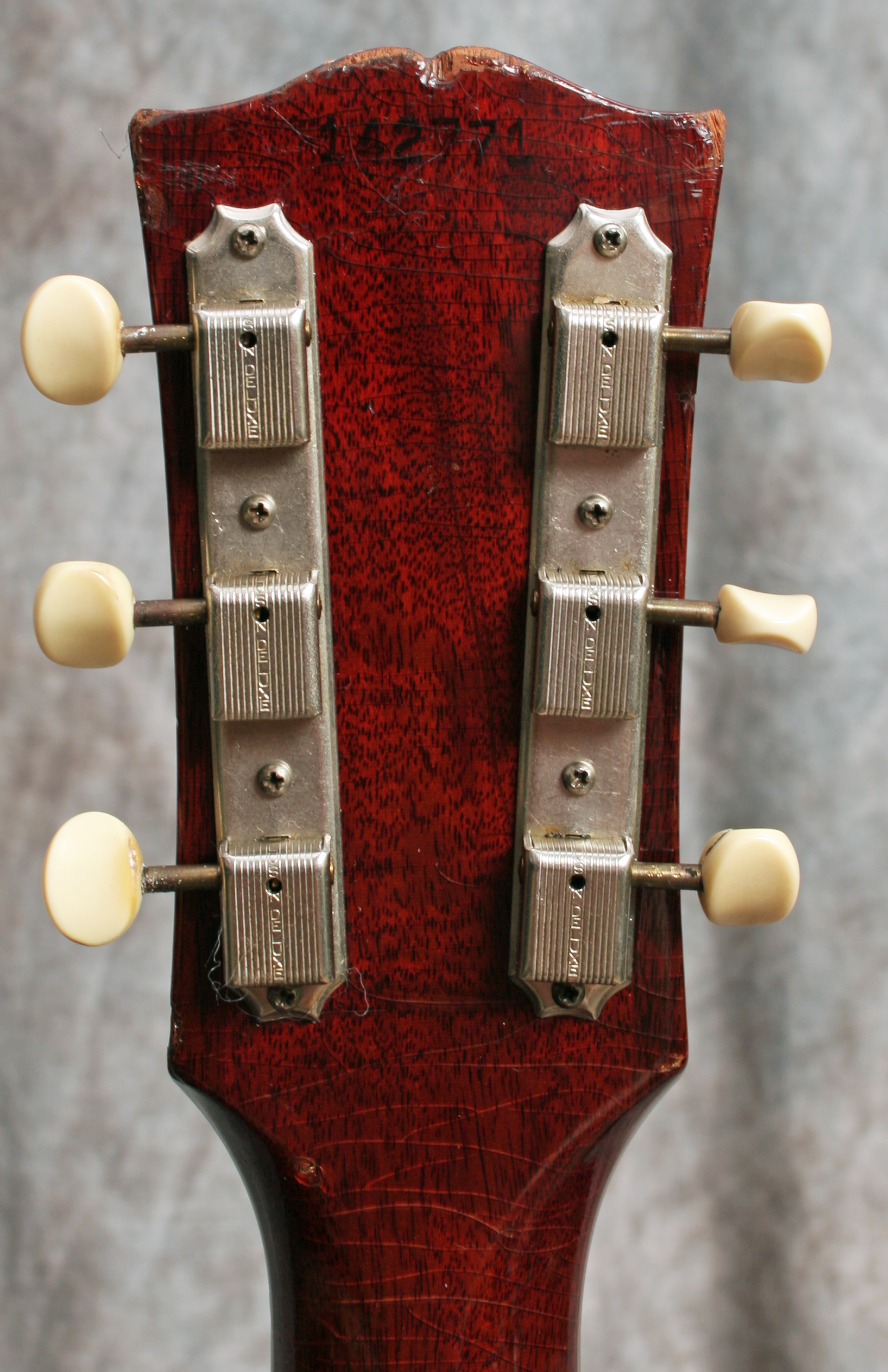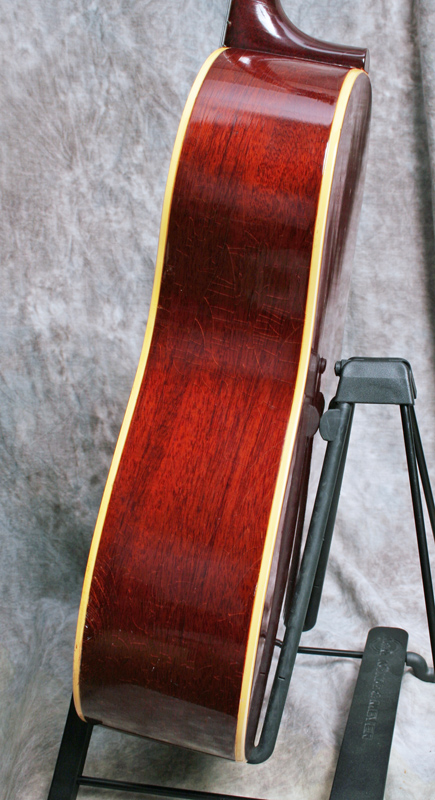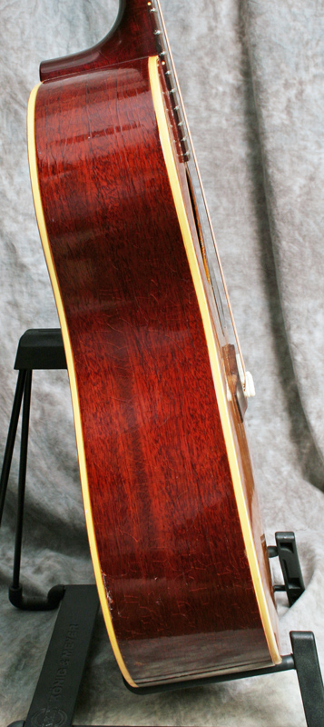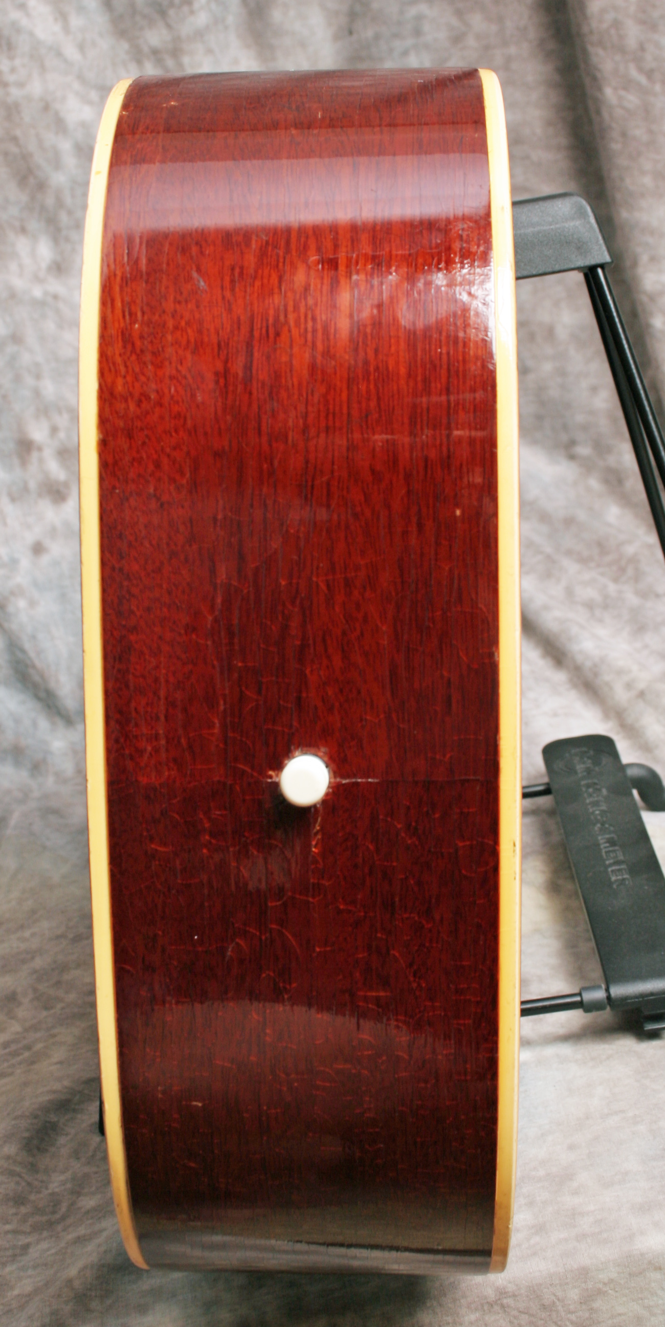 (Serial No. 142771) Excellent minus condition showing some typical playing wear. I think the slope shoulder Gibsons are about the best around for backing up fiddle tunes. I guess others think so too, as they are hard to find and hard to keep in stock. Desirable slope shouldered body style, spruce top with a classic muted cherry sunburst top finish that has faded out like a Les Paul burst, natural finish mahogany back and sides, exact repro Kluson single line tuners, a thin tortoise guard, and probably a replacement Brazilian rosewood bridge. Most Gibson acoustics in 1963 came with a plastic bridge and adjustable saddle - not one of Gibsons better ideas - and the plastic bridge would soon warp or crack from the string tension. An exact replacement Brazilian rosewood bridge with a fixed saddle is considered to be an upgrade to the original, and certainly improves it tonally. No repairs noted and none are needed. Classic wide/flat neck with a Brazilian rosewood fretboard and standard 1-11/16 inch nut, frets are fine with a few minor fingerboard divots in the first three frets, neck is straight and has the steeper pre-65 headstock pitch and the tall thin braces like the Hummingbird, which seems to give better tone. There is a repaired back crack that is cleated and should not pose a problem in the future. Plays nicely as it was just set up by my luthier. It sounds more like a 50s guitar than a 60s. Comes with a newer hardshell case.