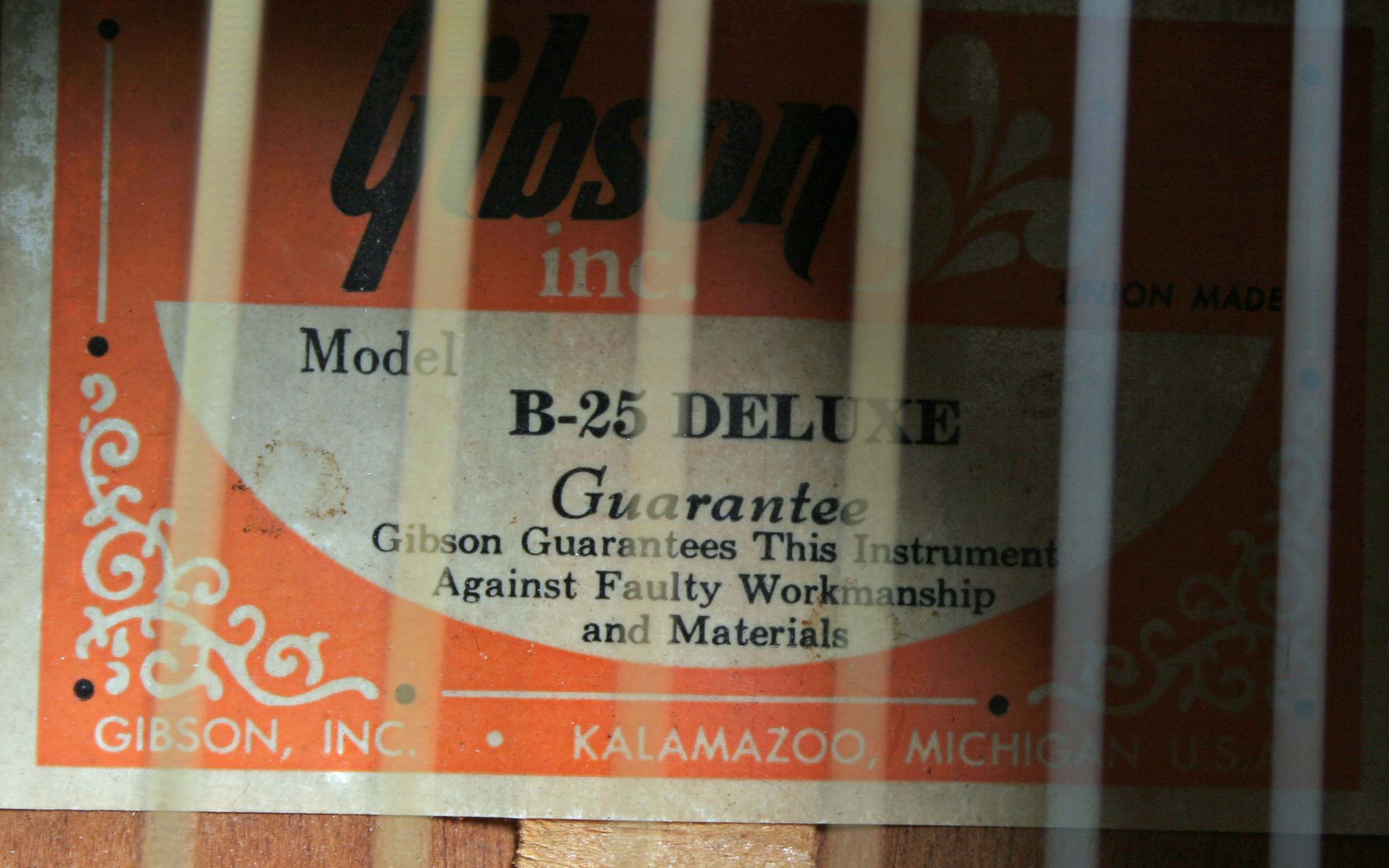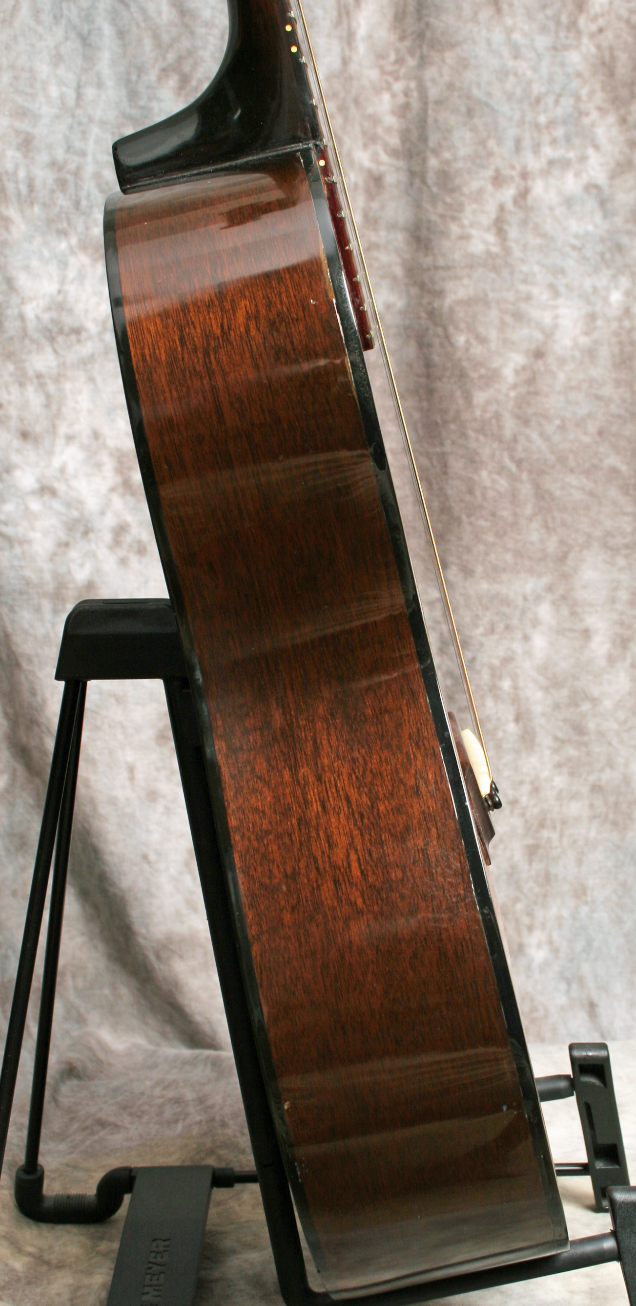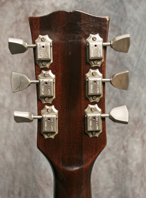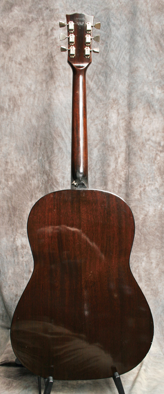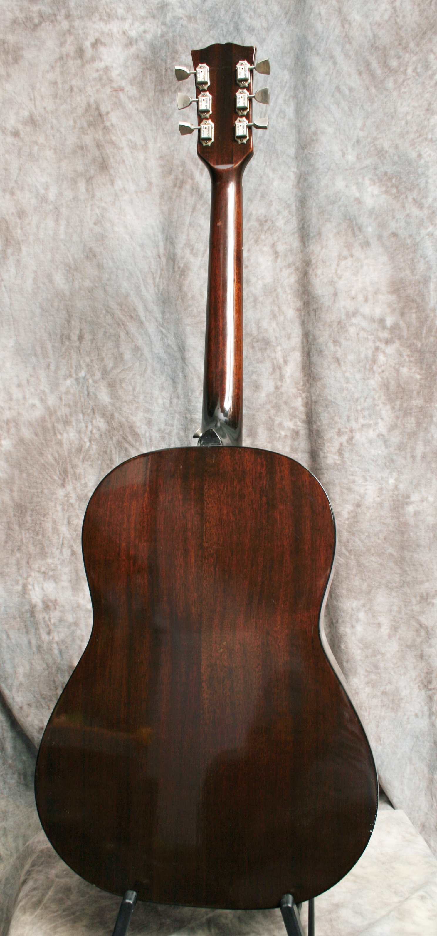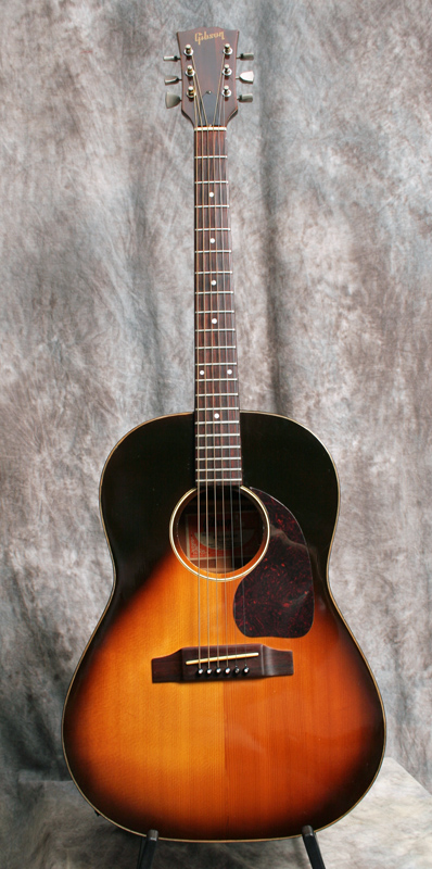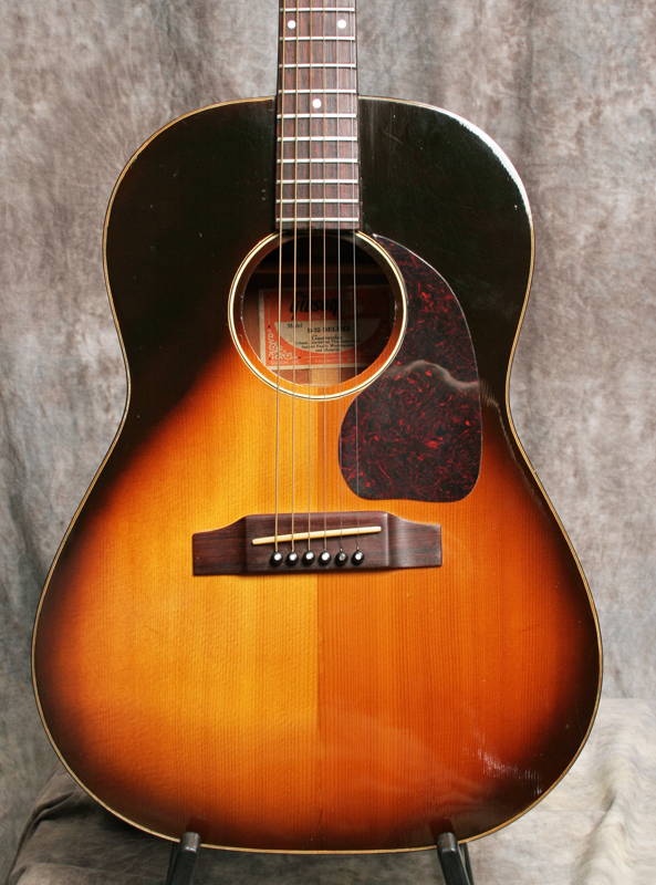 (Serial No. 689019) Excellent condition with a sunburst lacquer finish. Great sounding guitar with a Sitka spruce top, mahogany back and sides, and a rosewood fretboard and bridge. Frets are good, bridges and braces are tight, and the neck set is good. It is loud, very responsive and open sounding. It really nails the slope shoulder Gibson midrangy dreadnaught sound. Has an 1 9-16 inch nut, 24 3/4 inch scale length, Brazilian rosewood fretboard with dot inlays, and original Brazilian bridge with adjustable saddle. The original double line Kluson tuners work well. This guitar has spent its time in the banjo wars and it shows in the pick wear and handling wear. This guitar has had the sound played into it. Plays nice and easy - its as comfortable as an old pair of boots. The sound just rolls out of this guitar. Tonally the guitar is very midrange-forward, and this boxy-sounding strummer has distinctive punch and snap. Comes with a nice hardshell case.