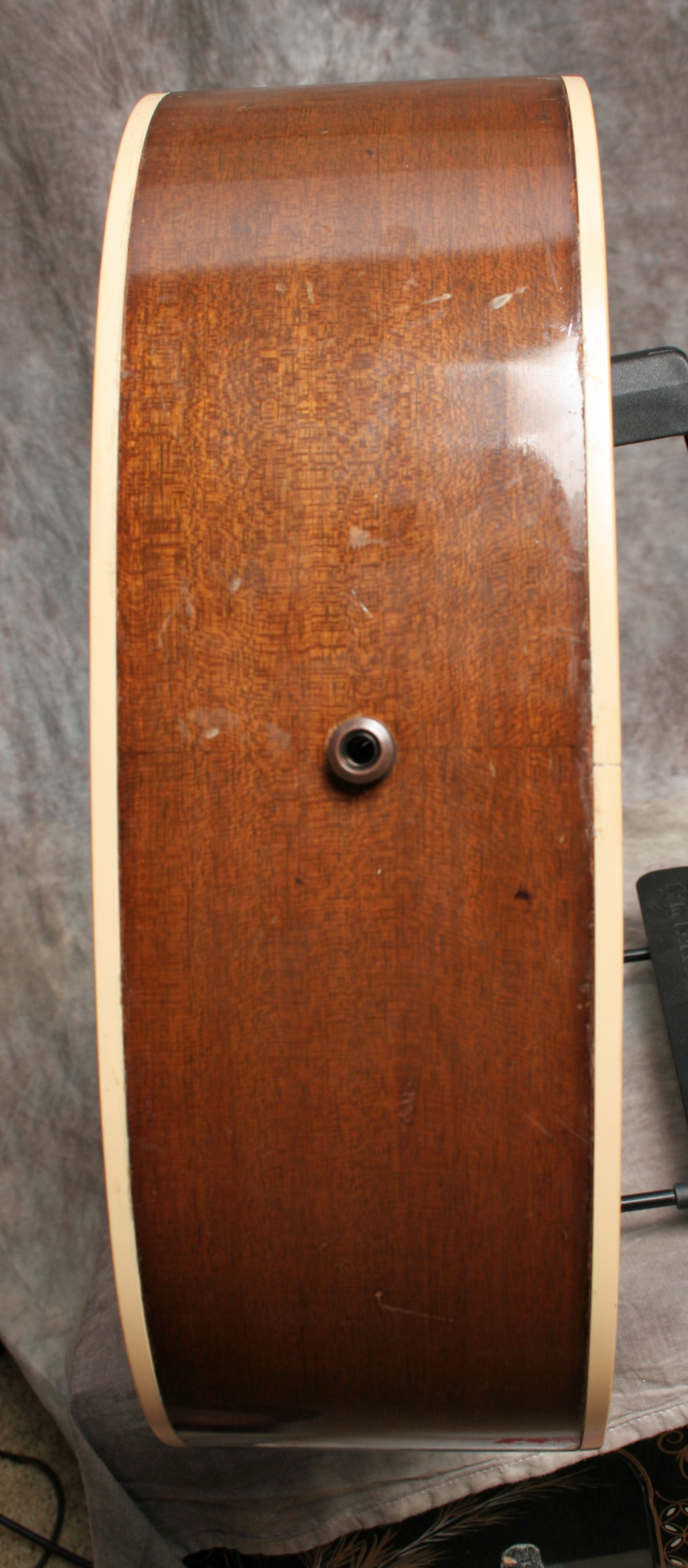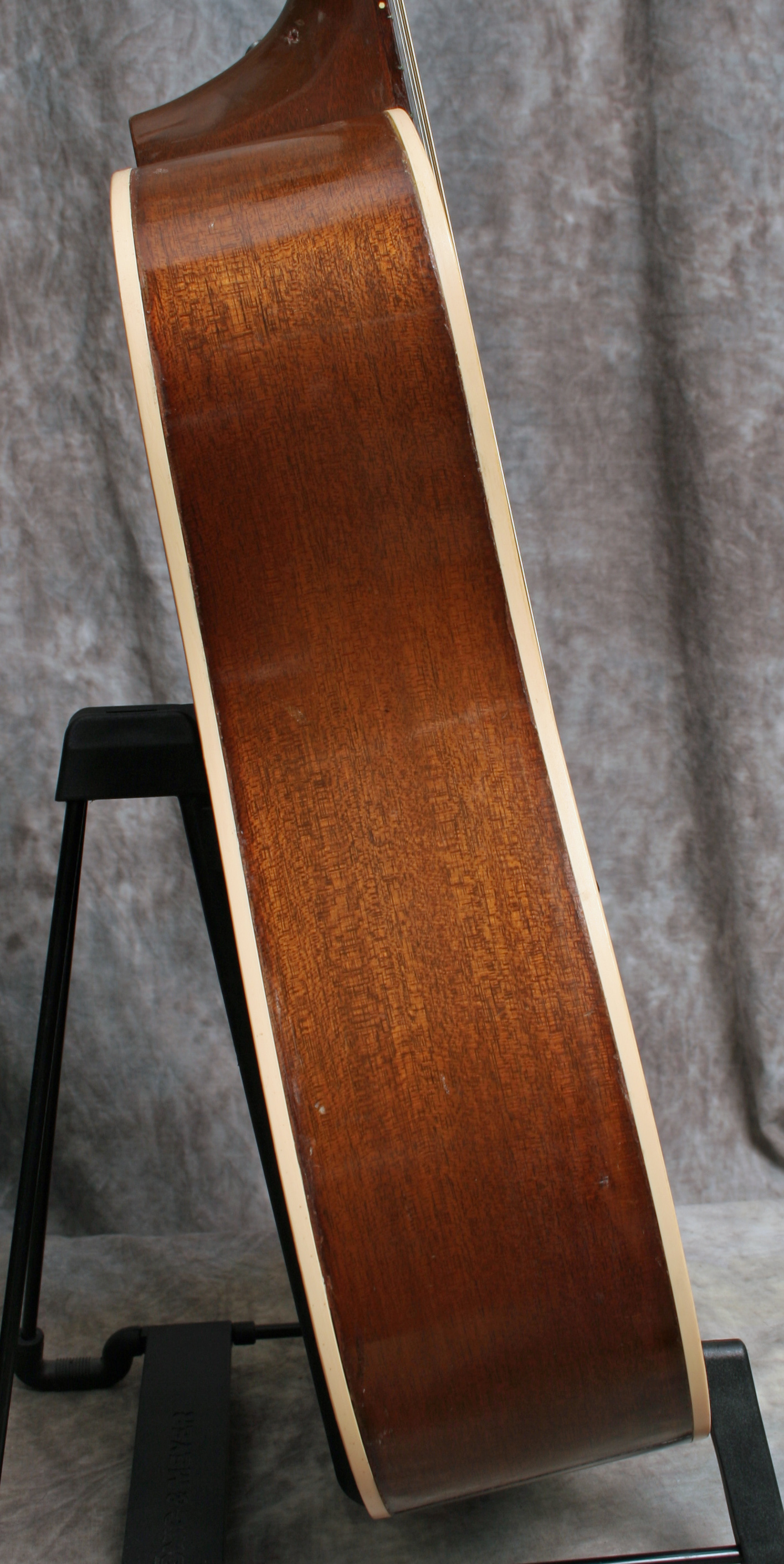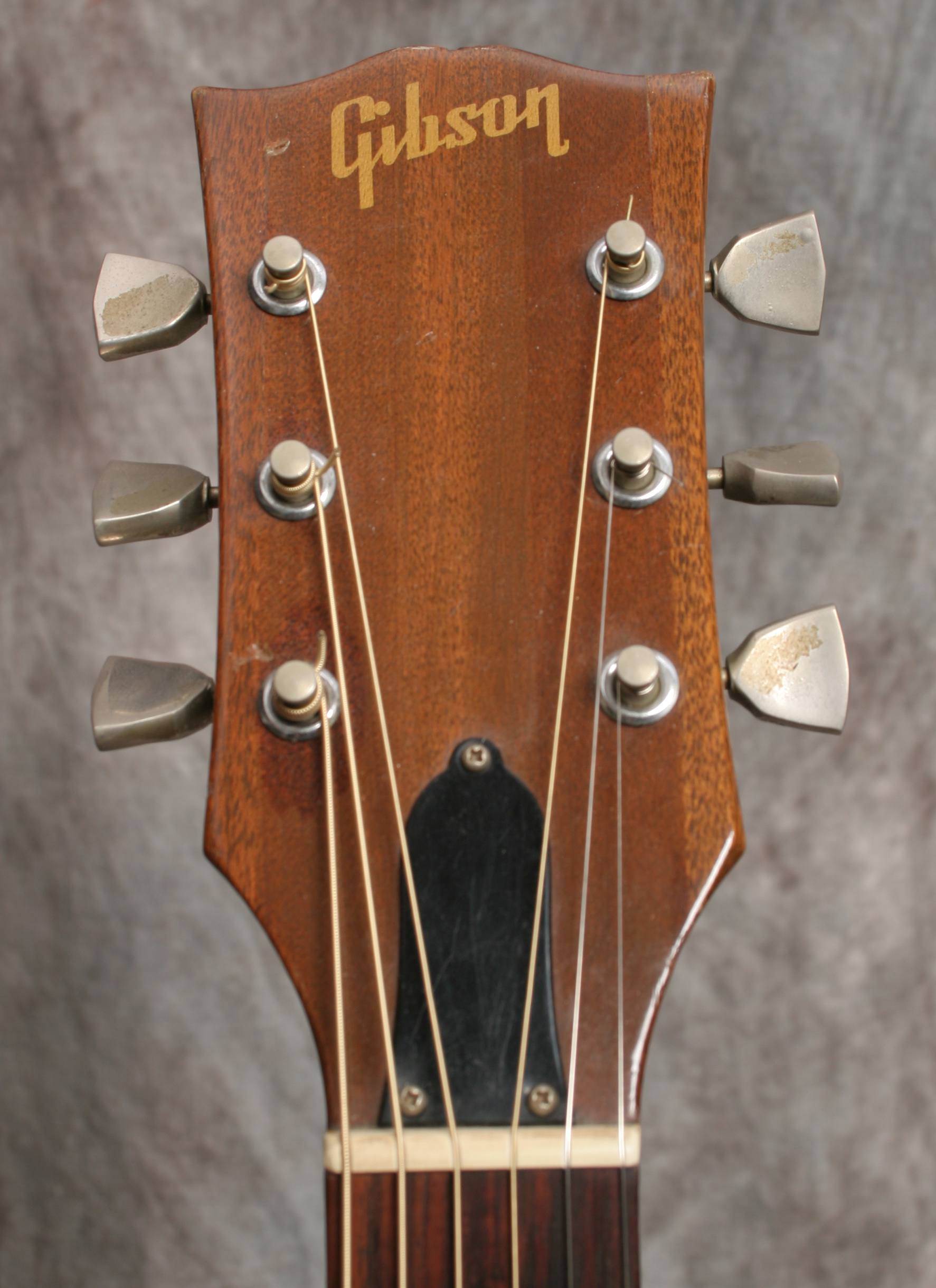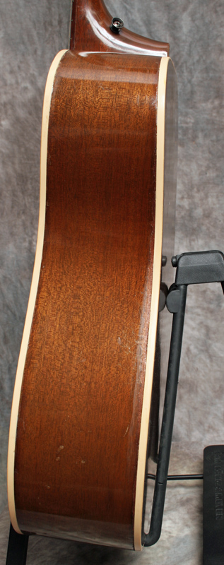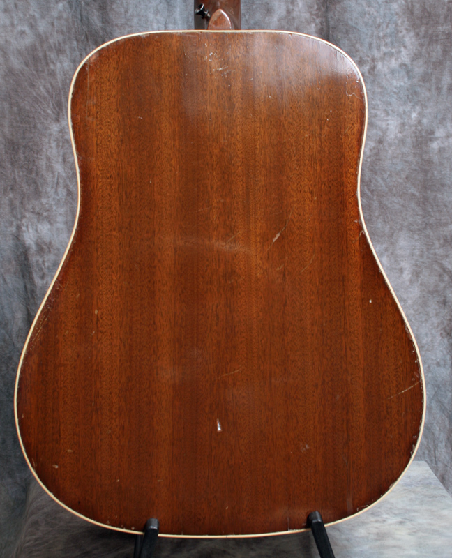 (Serial No. A248027) Very good condition. This is one of the rarest guitars on the page - a mid 1970's Gibson deadnaught that sounds great! Most of these are complete dogs with no sound. This has has good tone and volume. Gibson made thousands of guitars during their "Dark Age" in the mid 1970s - it stands to reason that at least some of them were good guitars. Its not a prewar AJ but it will do the job. Note that the usually crumbling tortoise binding has been replaced, both top and back, with Gibson style white binding. This is a lot of expensive work - few luthiers will take on this job. Fitted with an undersaddle pickup, soundhole controls and an endpin jack. Someone loved this guitar, took care of it, and made it their own. Mahogany back and sides, Sitka spruce top, 1 11/16 nut, original Kluson tuners, one piece neck, and a sunburst top finish. Plays great with a nice easy low action. Its not just a "good guitar for a 70s Gibson" - its a good guitar, period. Comes with the original hardshell case.