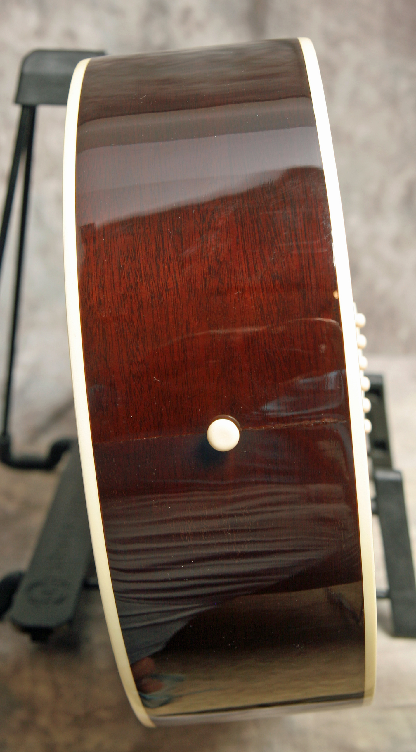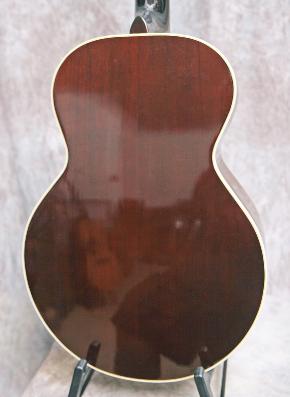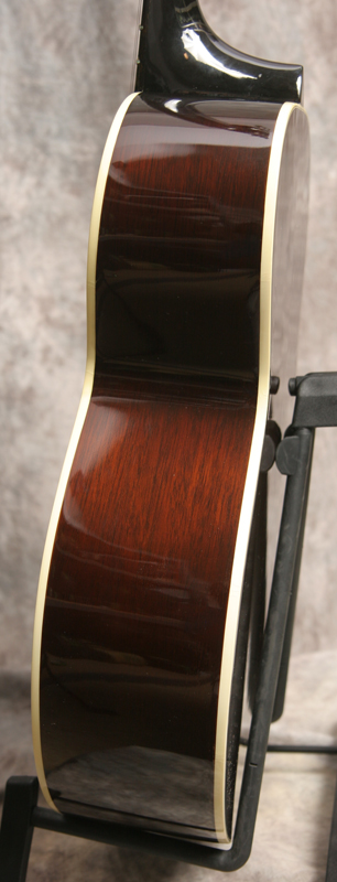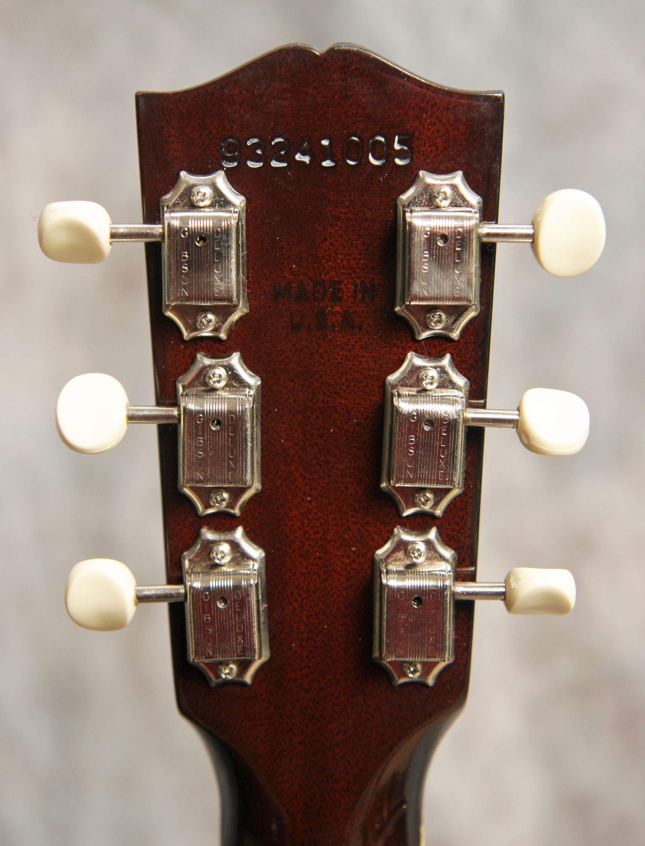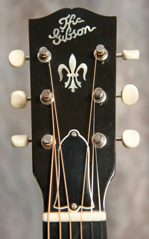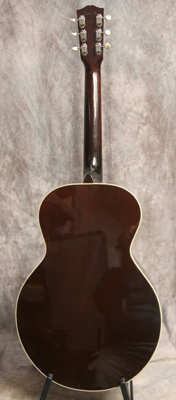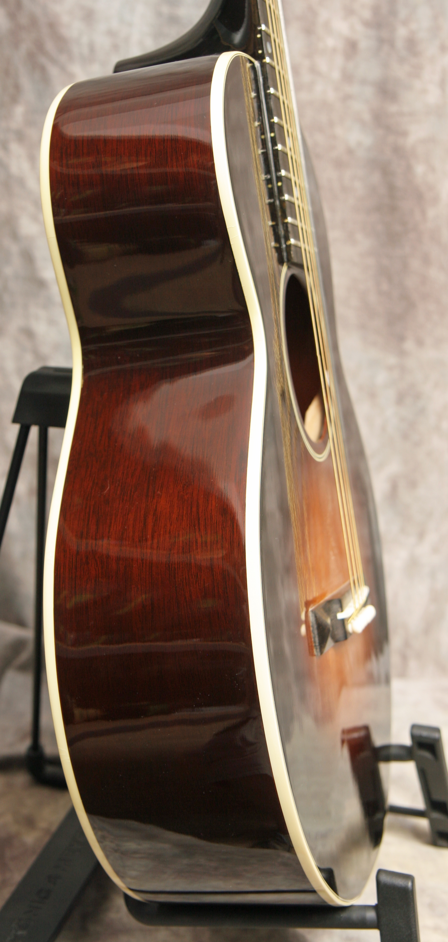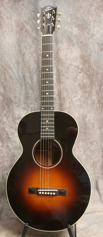 (Serial No. 93241005) Here is your chance to obtain a modern version of a Gibson L-1 guitar (the guitar model Robert Johnson played), built by Gibsons top luthier. Mint condition. I bought this guitar at auction and I think it must have been owned by a collector who bought it new and put it under the bed in 1991. There is simply NO wear - its a 23 year old new guitar, hand-built by Ren Ferguson, one of Gibsons better known builders. Ren signed the label. All hardware and finish is original. This is the guitar Gibson should have built back in the 1930s. Outstanding sunburst top finish, X-braced Sitka spruce top, mahogany back and sides, 1 11-16 inch nut, Brazilian rosewood fretboard with dot inlays and original Brazilian bridge with fixed saddle. The frets are in excellent shape, and the neck is straight. Its been set up so it plays easy and smooth, with a nice low action. It would be perfect for a fingerstyle blues player. Click here for a video clip of this guitar as played by Nathan Beaumont of the Remedy Tree Band in Brandon FL. Comes with the original brown hard shell case with the pink blanket, also mint.