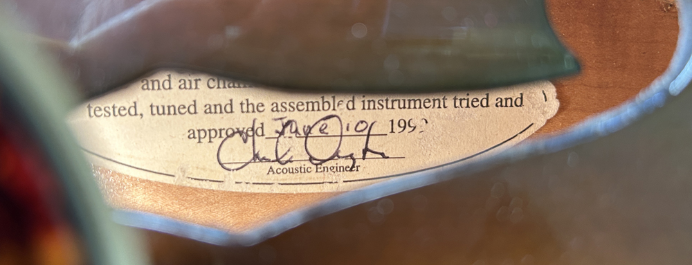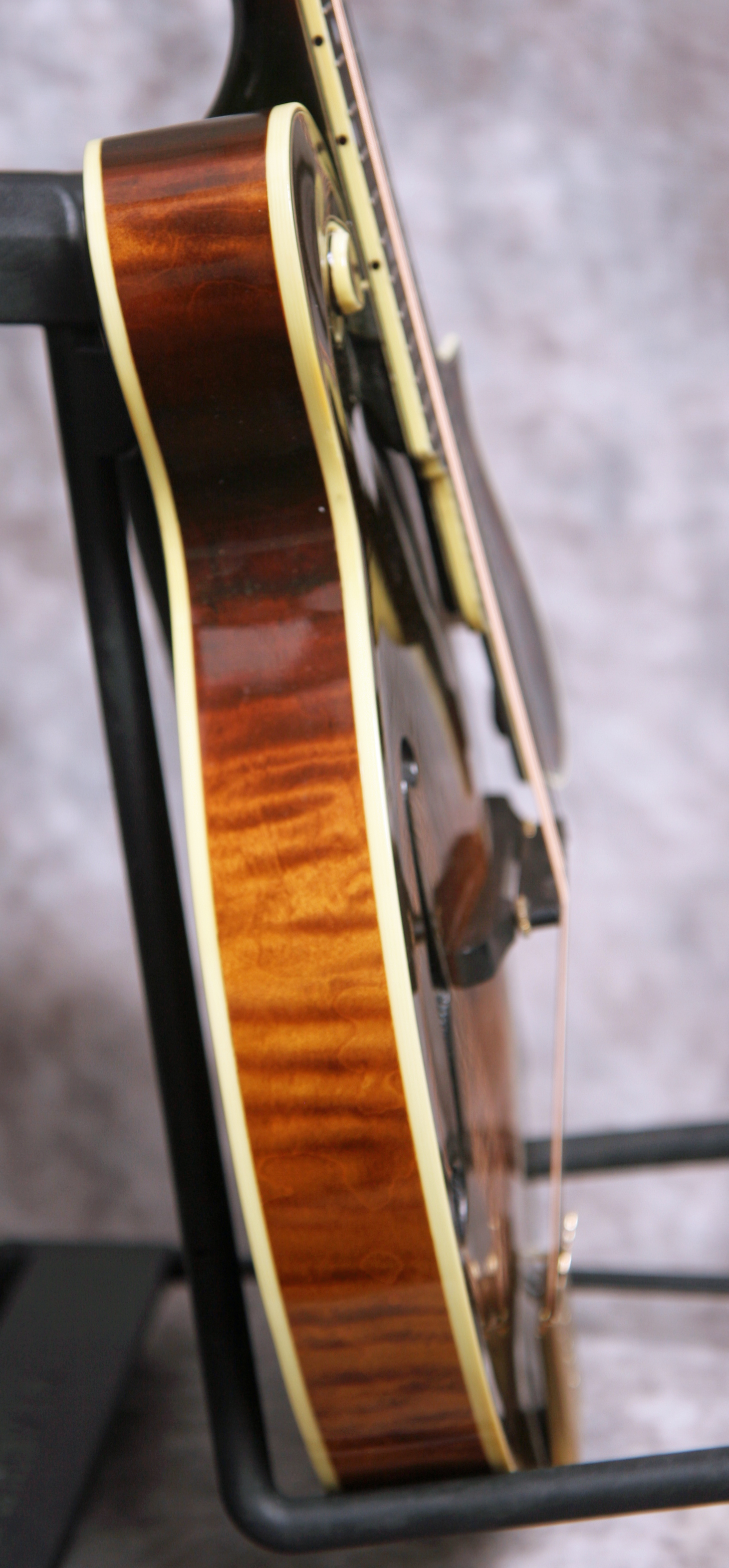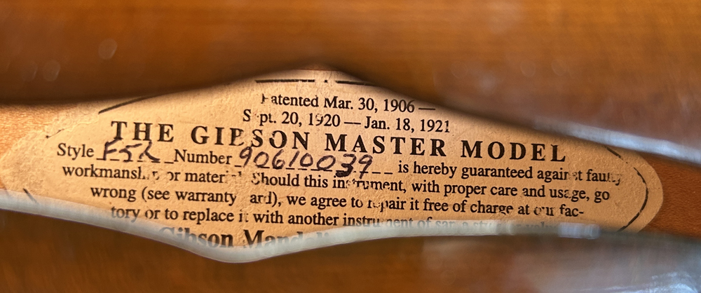 (Serial No. 90610039) Excellent plus condition, traditional dark brown tabacco sunburst finish, completely original. This is the classic Gibson scroll mandolin - long neck, f-holes, elevated fretboard, flamed maple back and sides, solid spruce top, bound ebony fingerboard, and the classic Fern peghead inlay. It has the original gold plated Schaller tuners with pearl buttons. If you look hard enough, you might find a mark or two, as the mandolin was been used in a bluegrass band, but there are no cracks, breaks, refinish, or bad dings. This was probably made in the Bozeman, Montana plant, but it has a Nashville label. It was signed by luthier Charlie Derrington on June 10, 1999. Action is great - easy and low. This mandolin sounds great with a strong chop and bark. Here is a short video clip of this instrument, again played by Nathan Beaumont. Comes in the original rectangular hardshell case