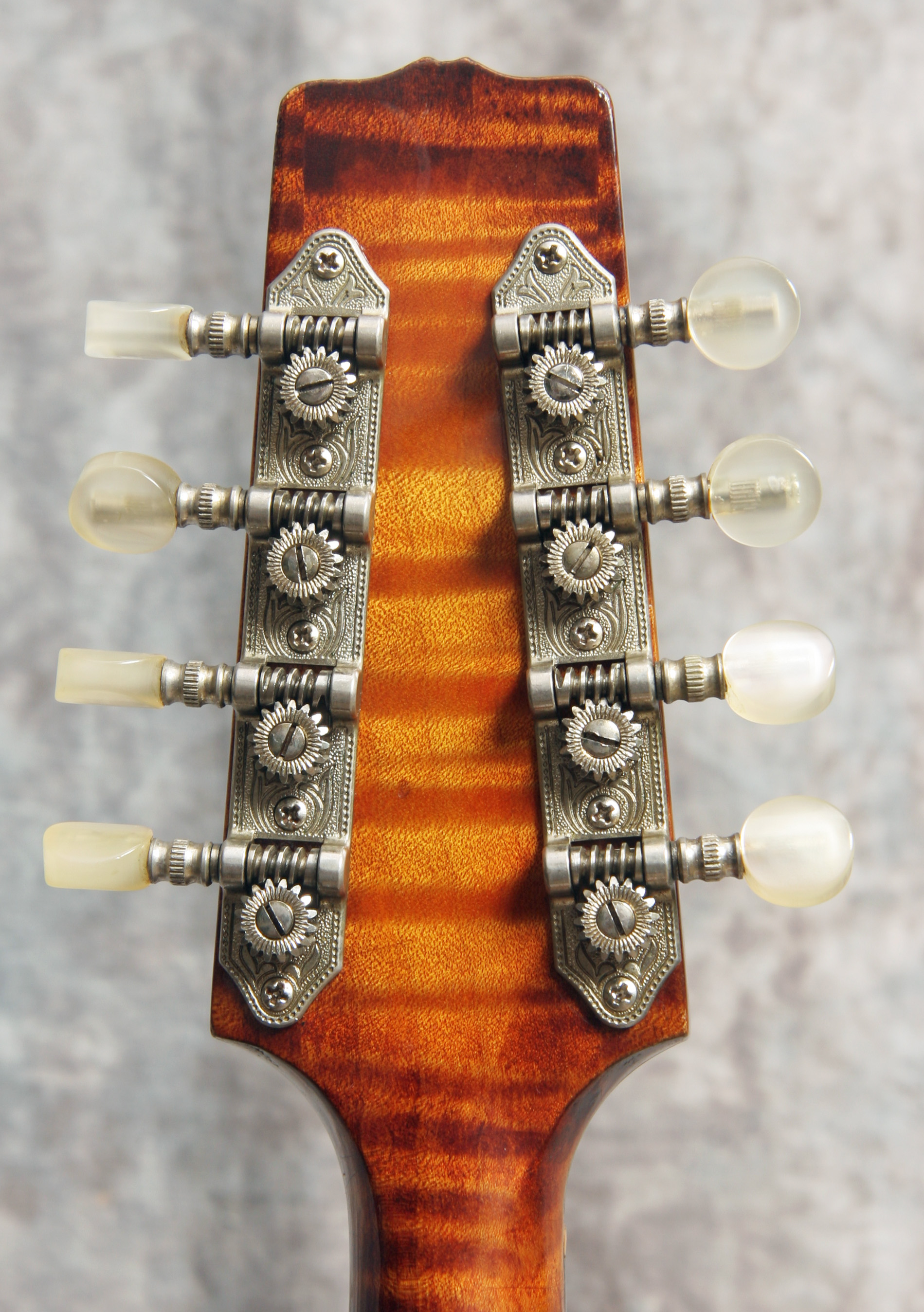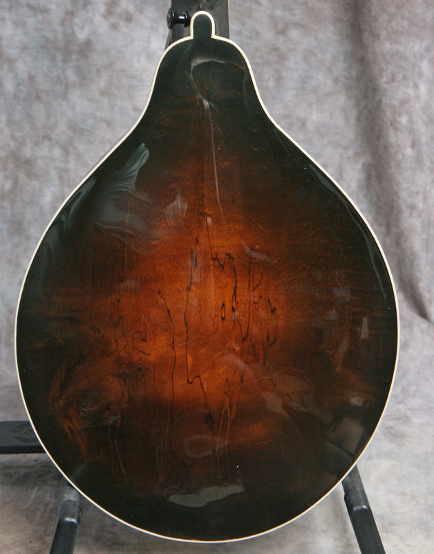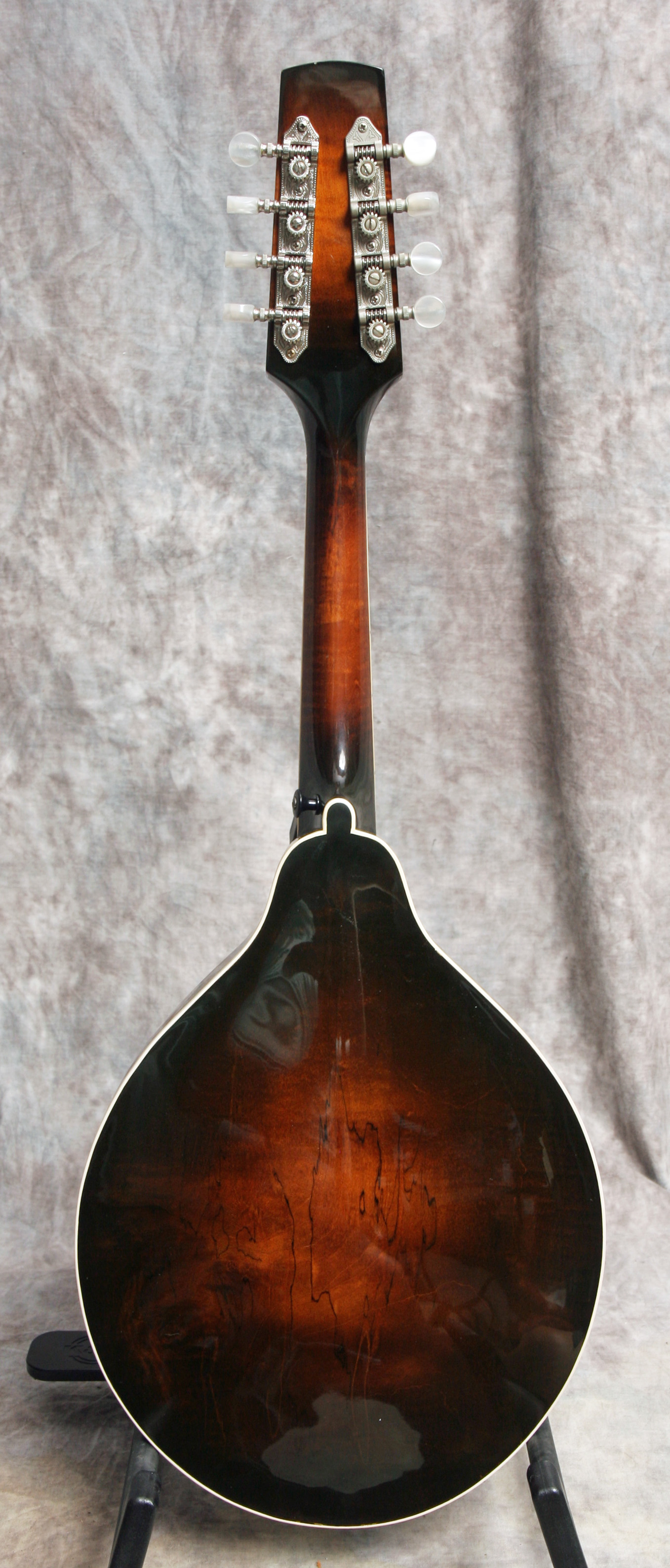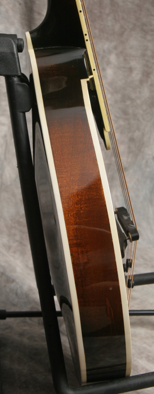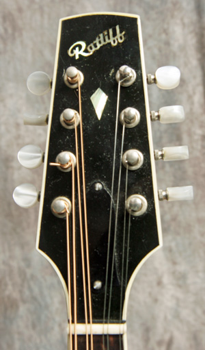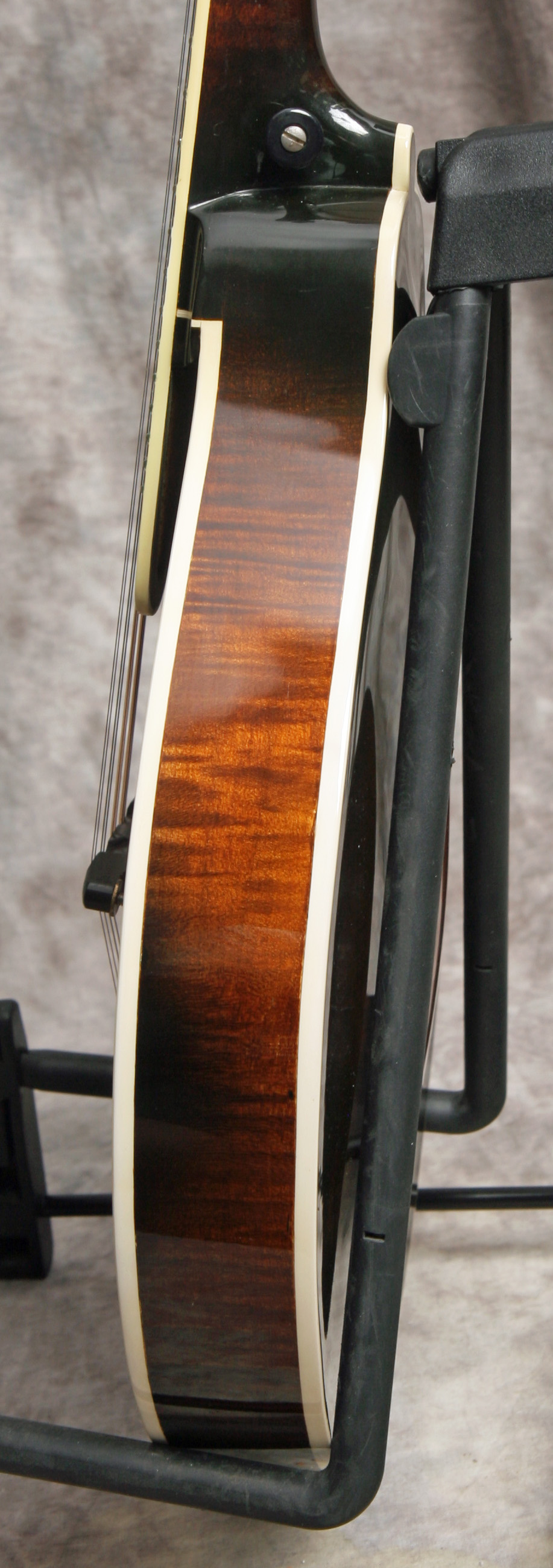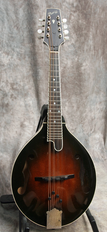 (Serial No. 1274) Excellent plus condition, medium red brown sunburst finish. Ratliff builds a fine looking and fine sounding mandolin. Build quality is top notch, as good as it gets. The mandolin has a gloss finish, with a single bound top and unbound back and headstock. It has all the design features that give Ratliffs their tone and power. This is the classic A5 style mandolin with the long neck, f holes, and the elevated ebony fretboard with dot inlays. Nut width is 1 1/8 inch. It features a beautiful flamed maple back and sides, and a maple neck. It also features a hand carved Adirondack red spruce top. Tradional flat fretboard thats slightly shortened to eliminate pick click in the sweet spot. Pearl logo. Fit and finish is as good as the big builders, and the sound is there. I think the original owner did not play mandolin. This instrument shows almost no pick wear. To my ears, it still sounds a bit green. However, it still has that woody bluegrass bark and the excellent volume and tone that is typical of these mandolins. Comes with a shaped hardshell case.