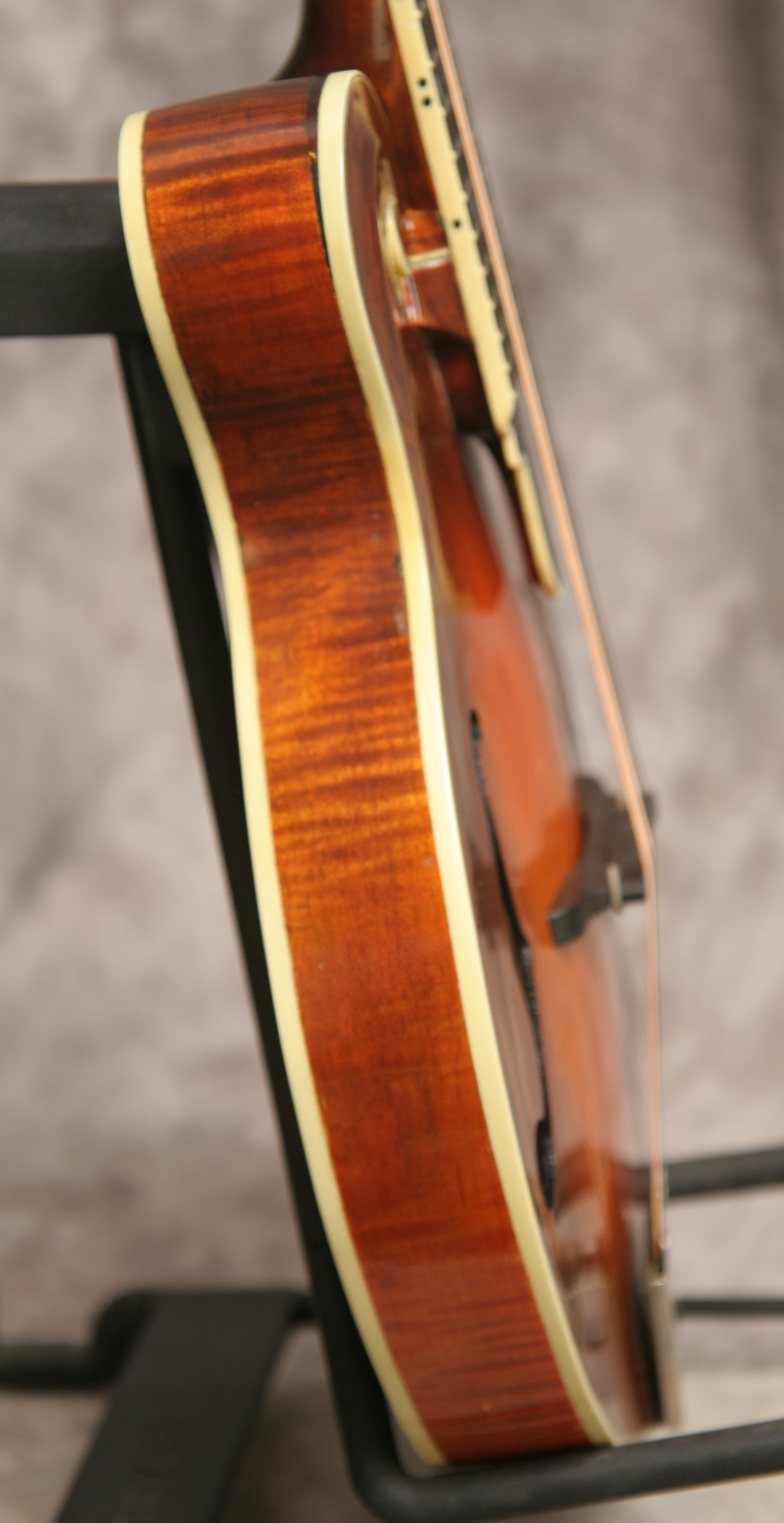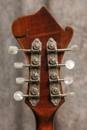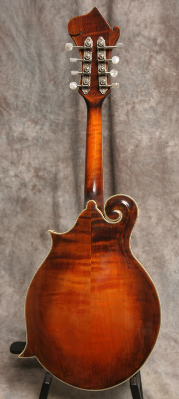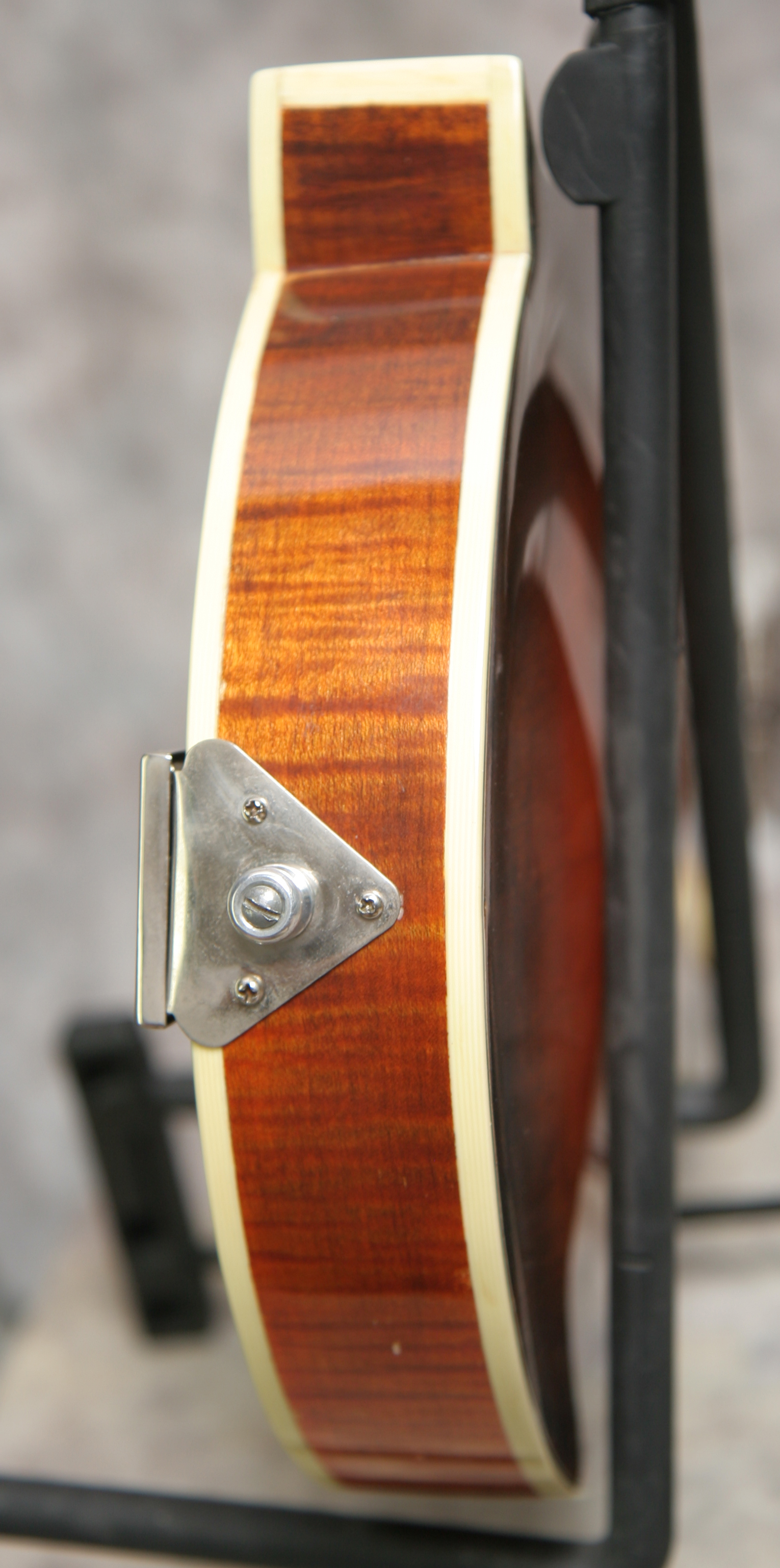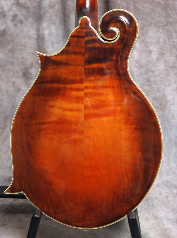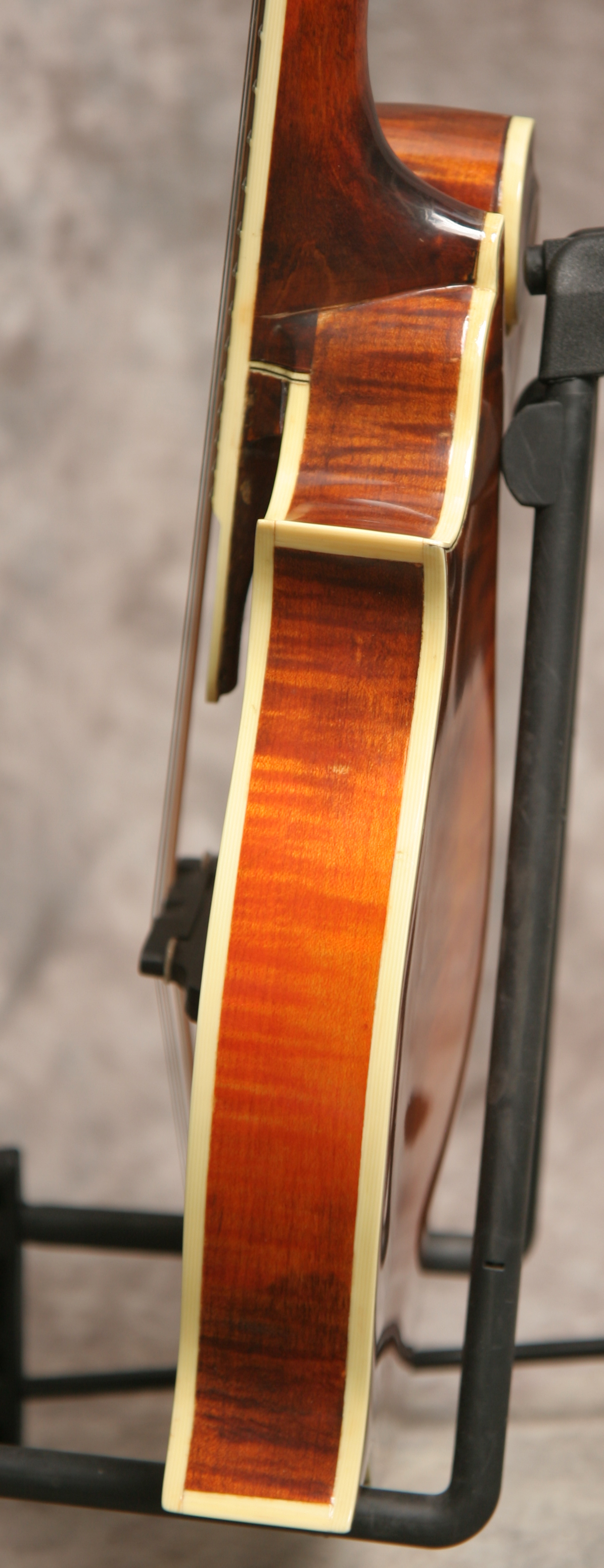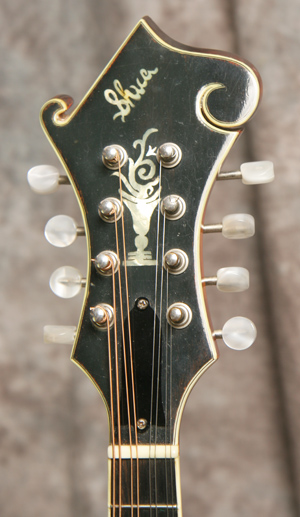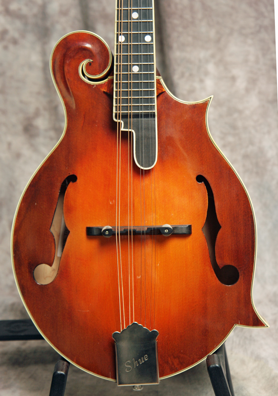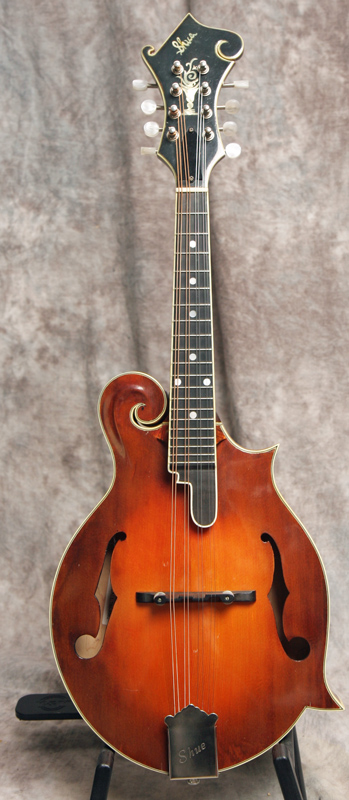 (Serial No. 3) Excellent condition. Bob Shue was a well regarded luthier in North Carolina, known best for his mandolins. You still see a lot of Shue mandolins at jams in North Carolina. This one was bought from the original owner, who bought it directly from Bob. This one was built with all the good stuff - light sunburst finish, flamed maple back and sides, red spruce top, maple neck, ebony fretboard and bridge, and pearl logo and peghead inlay. It is fully bound top, back, fretboard and peghead. No pickguard as made. Has a flat ebony fretboard with a 1 3/16 inch nut, and ebony bridge. The fretboard has been scooped to eliminate pick click. It is fitted with nickle Schaller tuners with pearl button and an engraved tailpiece cover. Shows very minor playing wear. Very good sounding mandolin with good response all across the strings and up and down the neck. Just set up by my local luthier so the mandolin plays like silk and has an excellent bluegrass chop. Click here for a video clip of this mandolin as played by Nathan Beaumont of Brandon FL. Comes with a nice hard shell case.