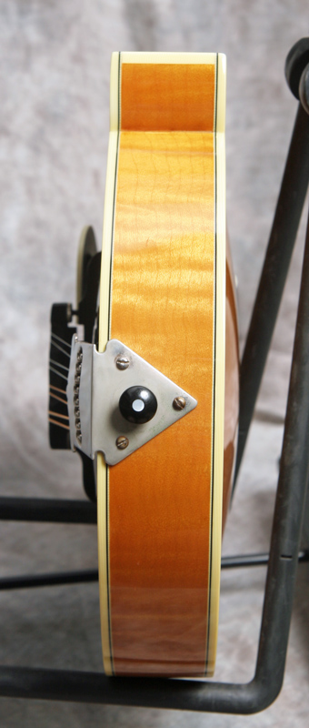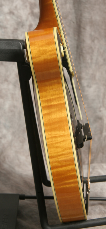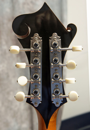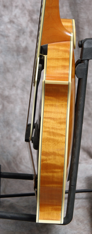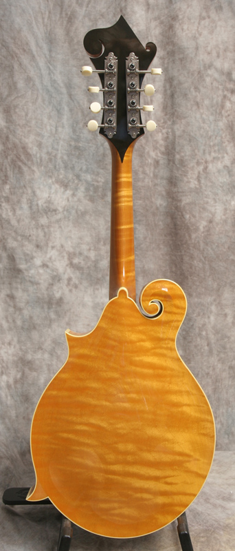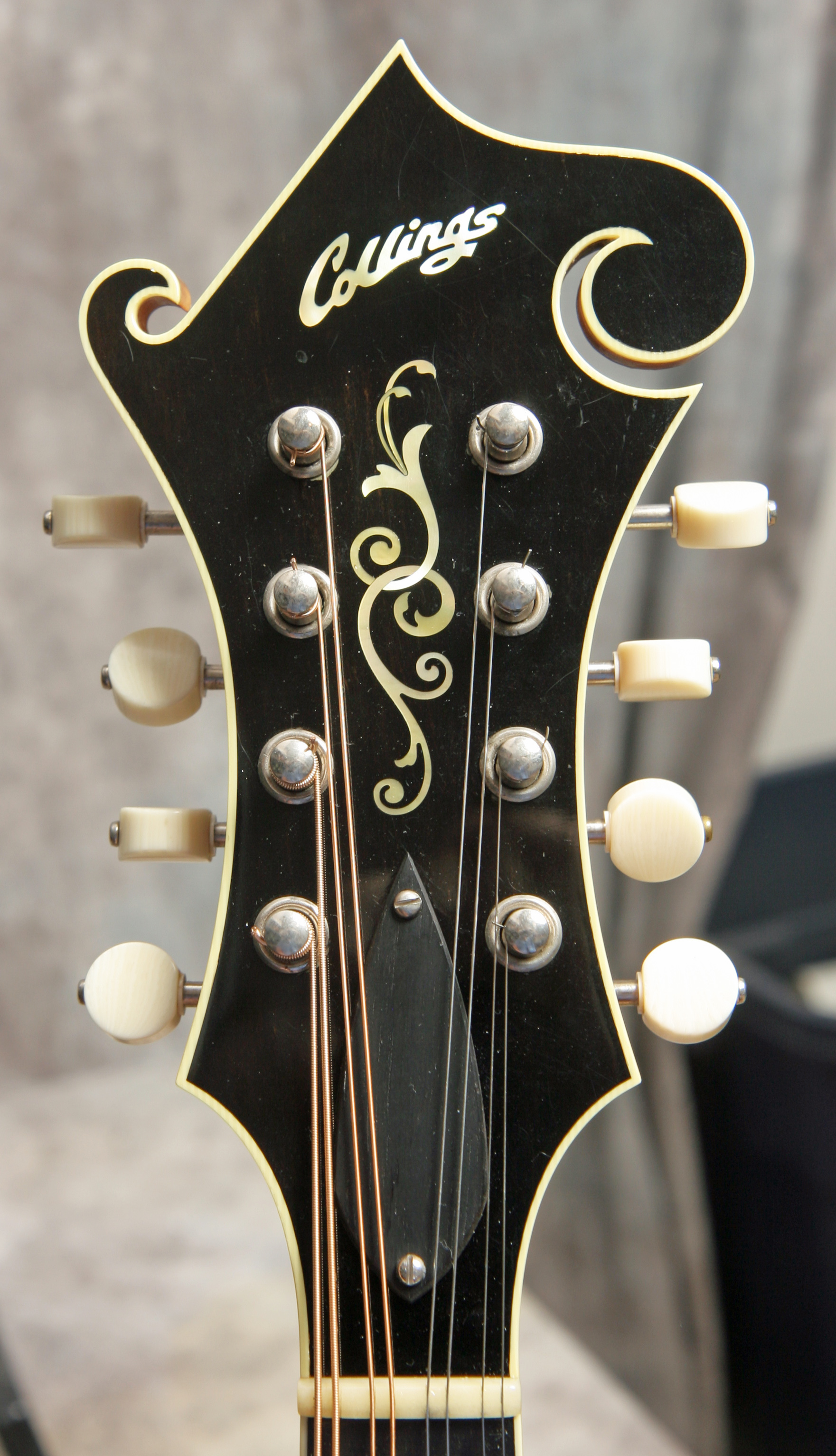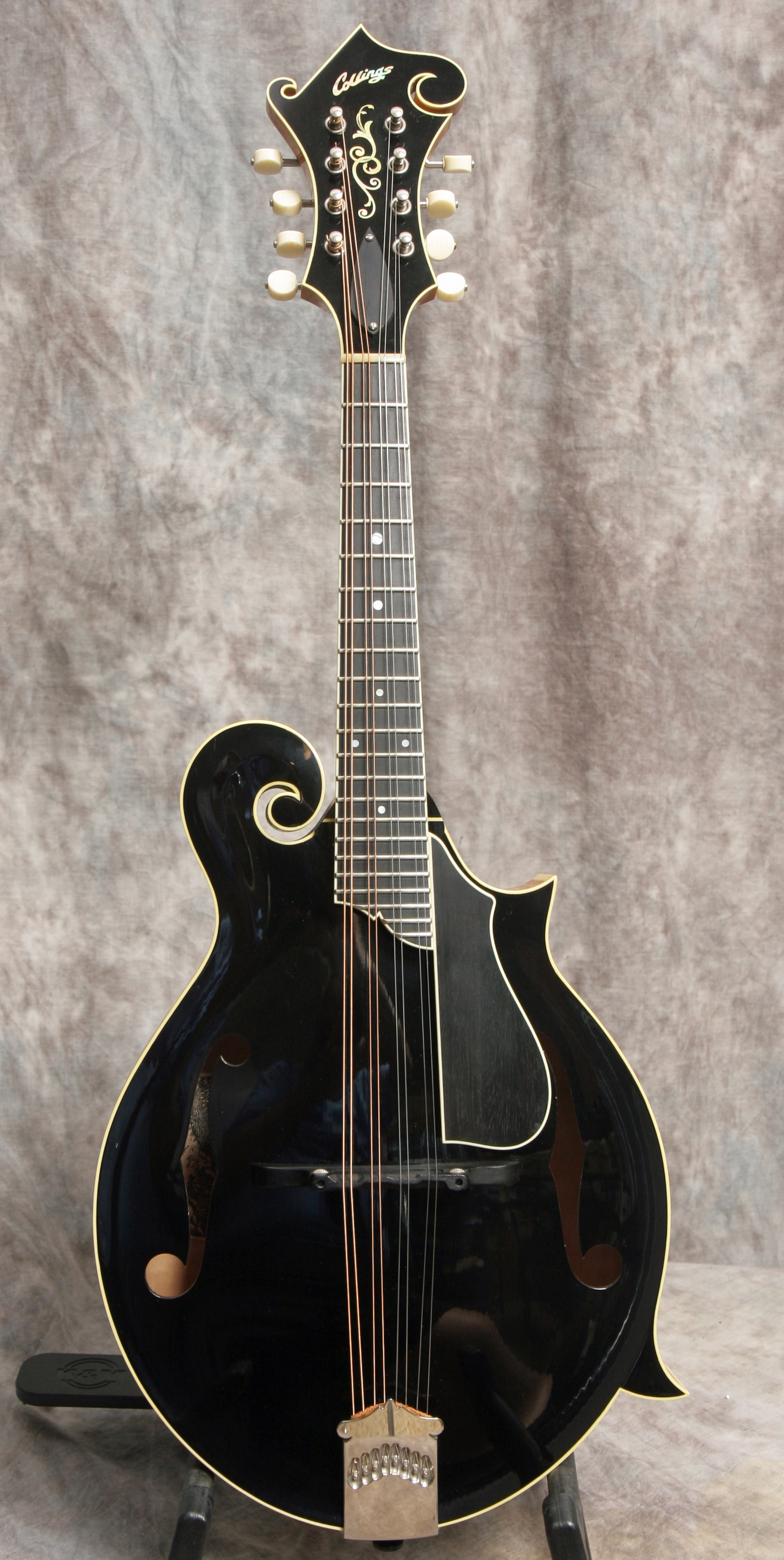 (Serial No. 308) Near mint condition, black top finish with natural finish back and sides. Collings mandolins are made to the same high standard as their guitars. This is the workhorse of Collings F5s - because it sounds great at a reasonable price. Soundwise this one cuts right through - it will run your local banjos out of town. Click here for a video clip of this mandolin as played by Nathan Beaumont of the Remedy Tree Band, Brandon FL. Very powerful mandolin - you will be heard in a jam. Excellent tone with a good woody chop. It has a fully carved Andirondack red spruce top and beautifully quilted one-piece back and nicely flamed sides and neck. Has an 1 1/8 inch nut on the radiused ebony fingerboard, along with the larger frets used by Collings. Ebony bridge. Side bound like Monroes with grained ivoroid binding. Has a pearl Collings peghead logo and inlay and the one-piece Collings tailpiece. Action is low and easy - it plays like silk. Original shaped TKL hardshell case included
