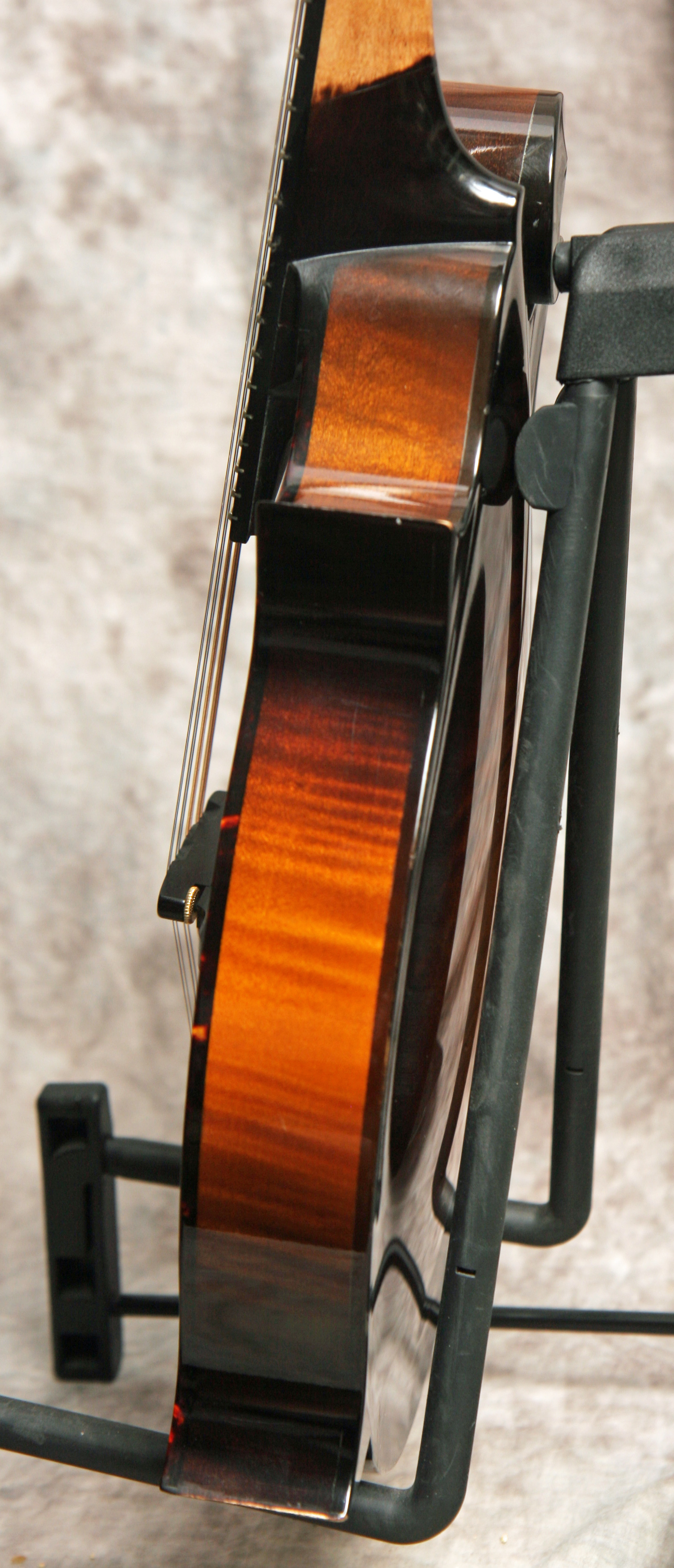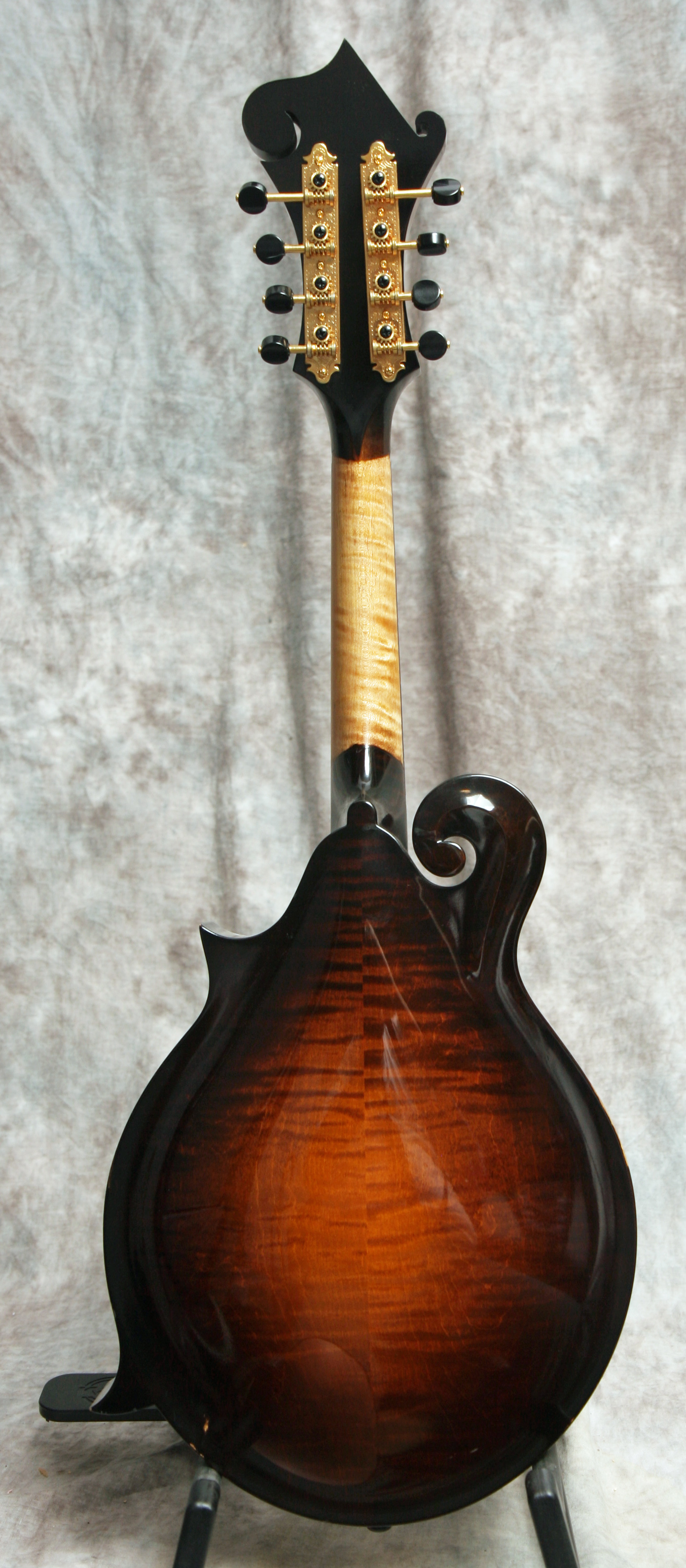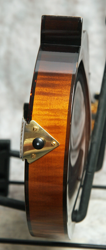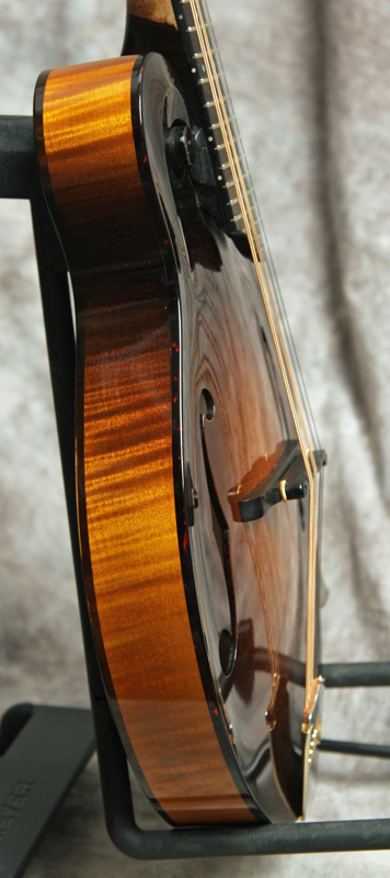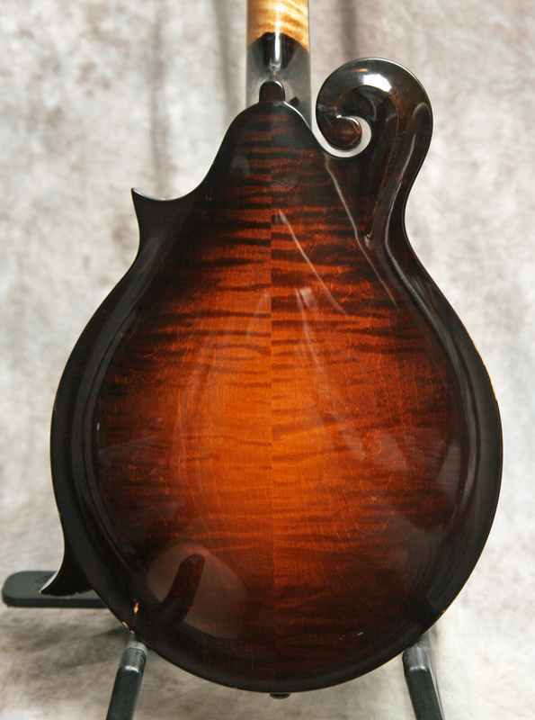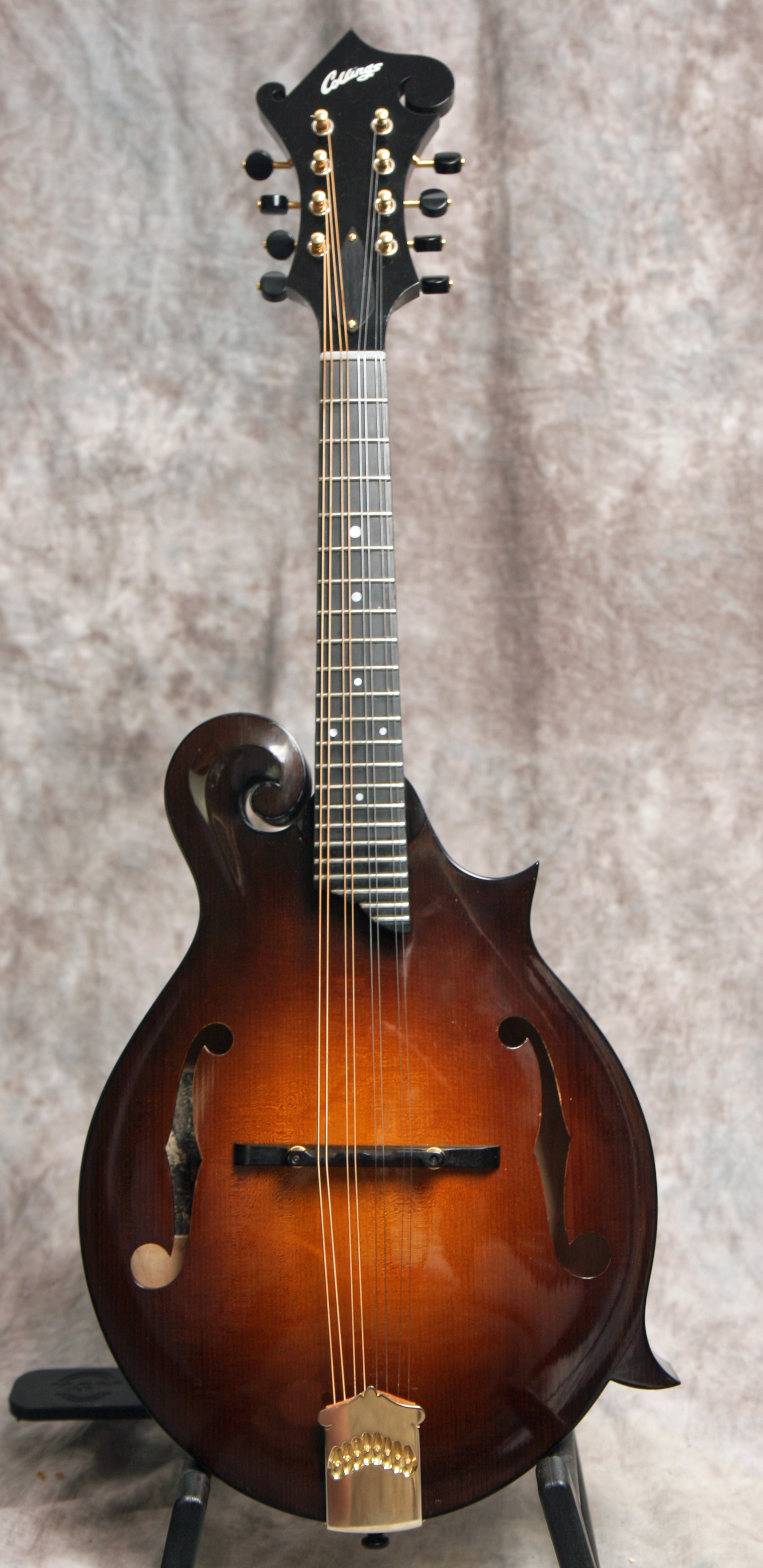 (Serial No. 934) Excellent plus/near mint condition, sunburst satin lacquer finish, built in Austin,Texas. Collings mandolins are built to the same high quality standards as their guitars. Plays nice with good low action and sounds pretty good, too. This mandolin has a big, rich voice with great projection and a powerful chop - everything you'd expect from a Collings. Nice clean mandolin with an Adirondack spruce top and heavily flamed Eastern maple back and sides. Gold Gotah original tuners and one-piece Collings tailpiece. Top is bound in tortoise. Has a 1 3/16 inch nut and jumbo frets on the radiused ebony fretboard, which is shortened by Collings to eliminate pick click. Has a soft V profile neck which has the finish removed from the back of the neck. This is called a speed neck, common in the South, where the finish is removed and the neck oiled to allow your hand to slide easily up and down the neck in the hot humid Southern summers. It works well in cooler climates, too. Fitted with the Collings one piece tailpiece. No repairs or other issues noted. Comes with a Collings shaped hardshell case.