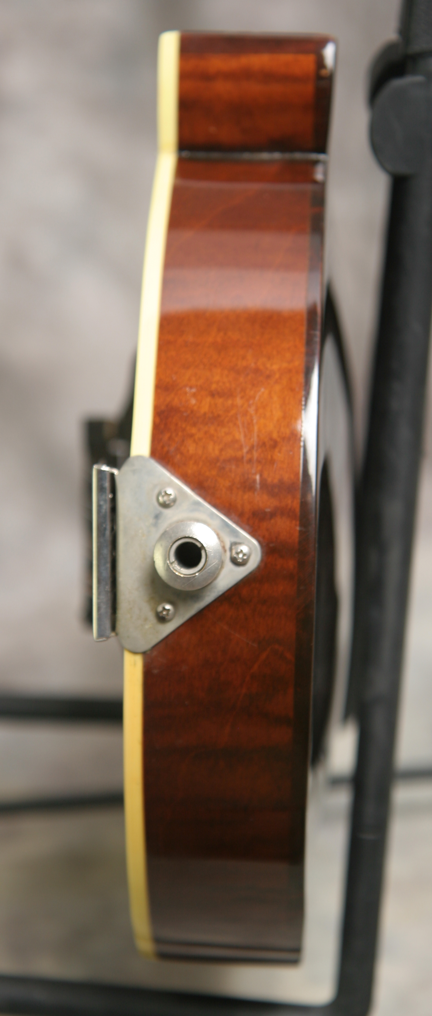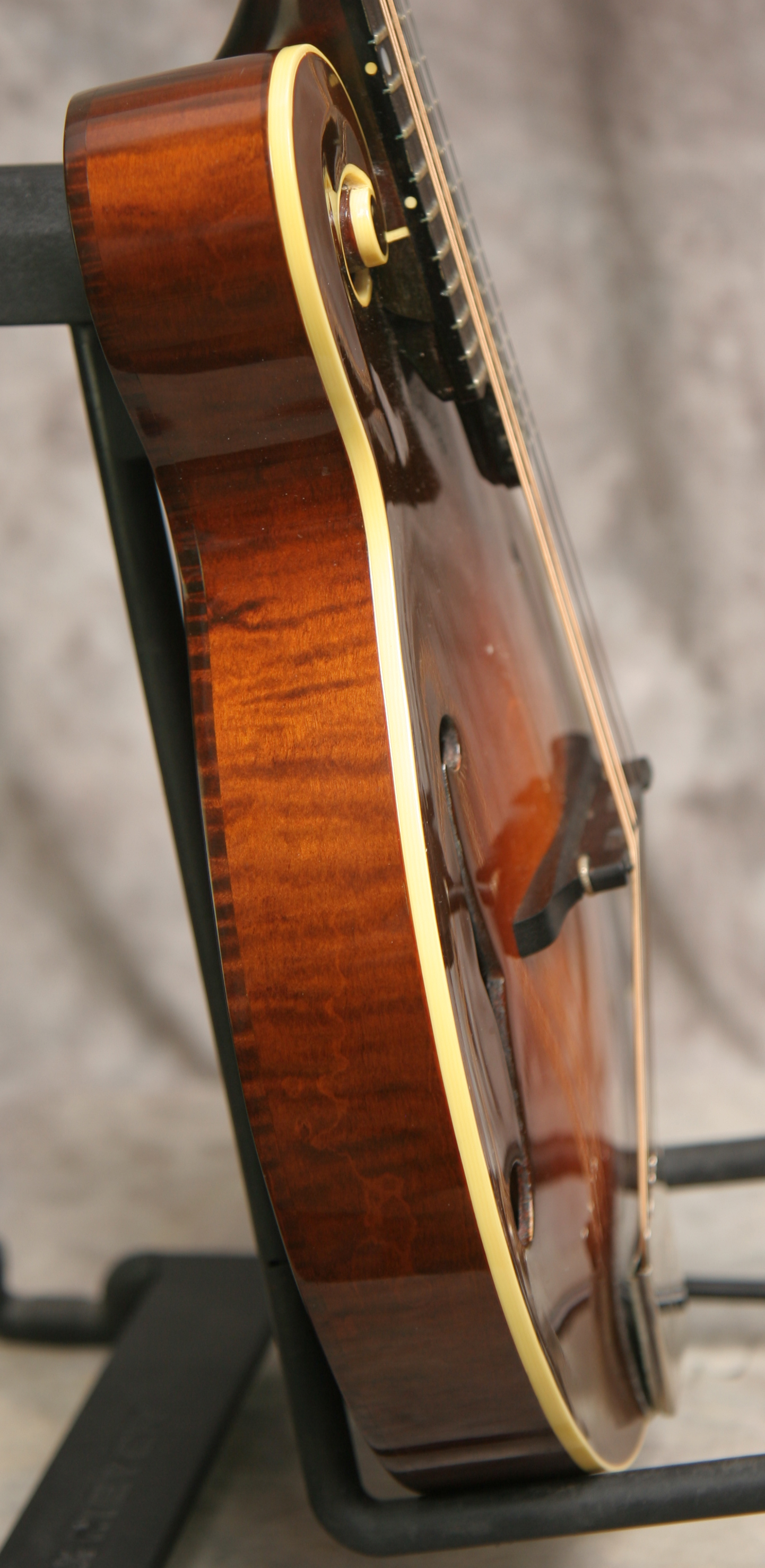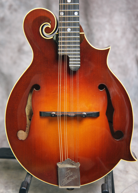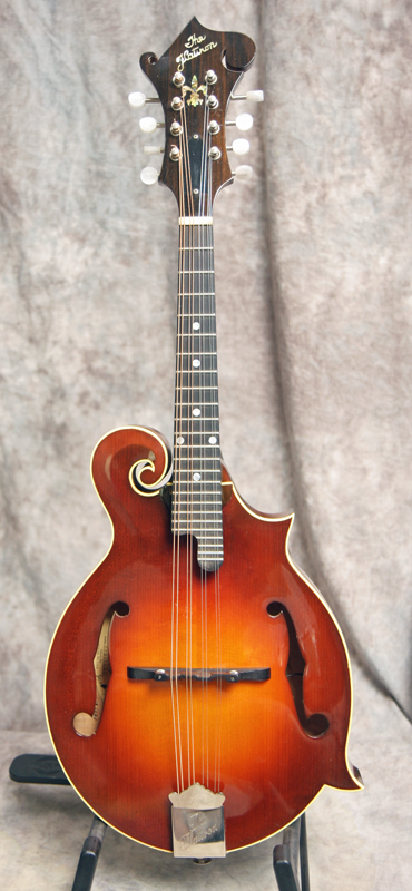 (Serial #11217020) Excellent condition, dark sunburst lacquer finish. Want the sound and playability of a Gibson F5 at a more affordable price? This is the classic Flatiron mandolin. It has the long neck, f-holes, bound top, back, fingerboard and peghead, elevated flat ebony fingerboard with extension, pearl headstock inlay and logo, solid heavily flamed maple back, sides and neck, fully bound, solid Sitka spruce top, and gold hardware with pearl buttons on the tuners. This mandolin has a Nashville label. Tone bar bracing, 1 1/8 inch nut. This one has the good bluegrass chop for sure. This mandolin has nice low action and has strong tone and good volume. No issues and no repairs. Here is a video clip of this mandolin as played by Nathan Beaumont. Just set up by luthier Marty Beeson. No structural repairs noted. Comes with the original shaped TKL hardshell case