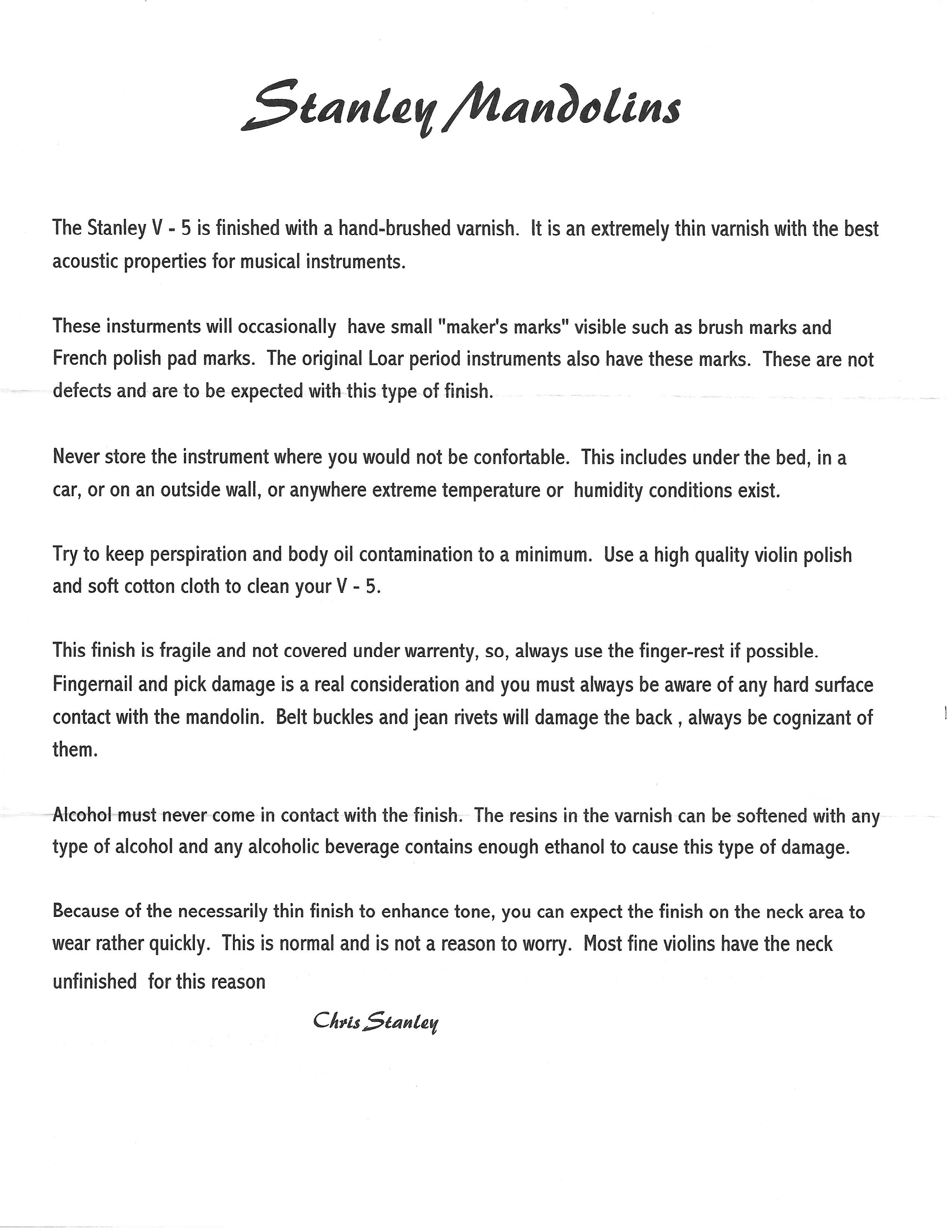 While the Stanley is a well made mandolin, Chris' priority is more about getting the Loar tone (he's owned 3) than obsessing over perfect looks. His mandolins have been very consistent since about #30. Mine is #62. It took some 3 years for the bottom 4 notes on the G strings to come into their own, and now they're just right with not too much low to get lost with other instruments. I've played some good sounding Ellis, Red Diamond, and Heiden mandolins, and I am more than satisfied with this Stanley.