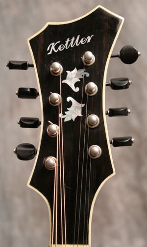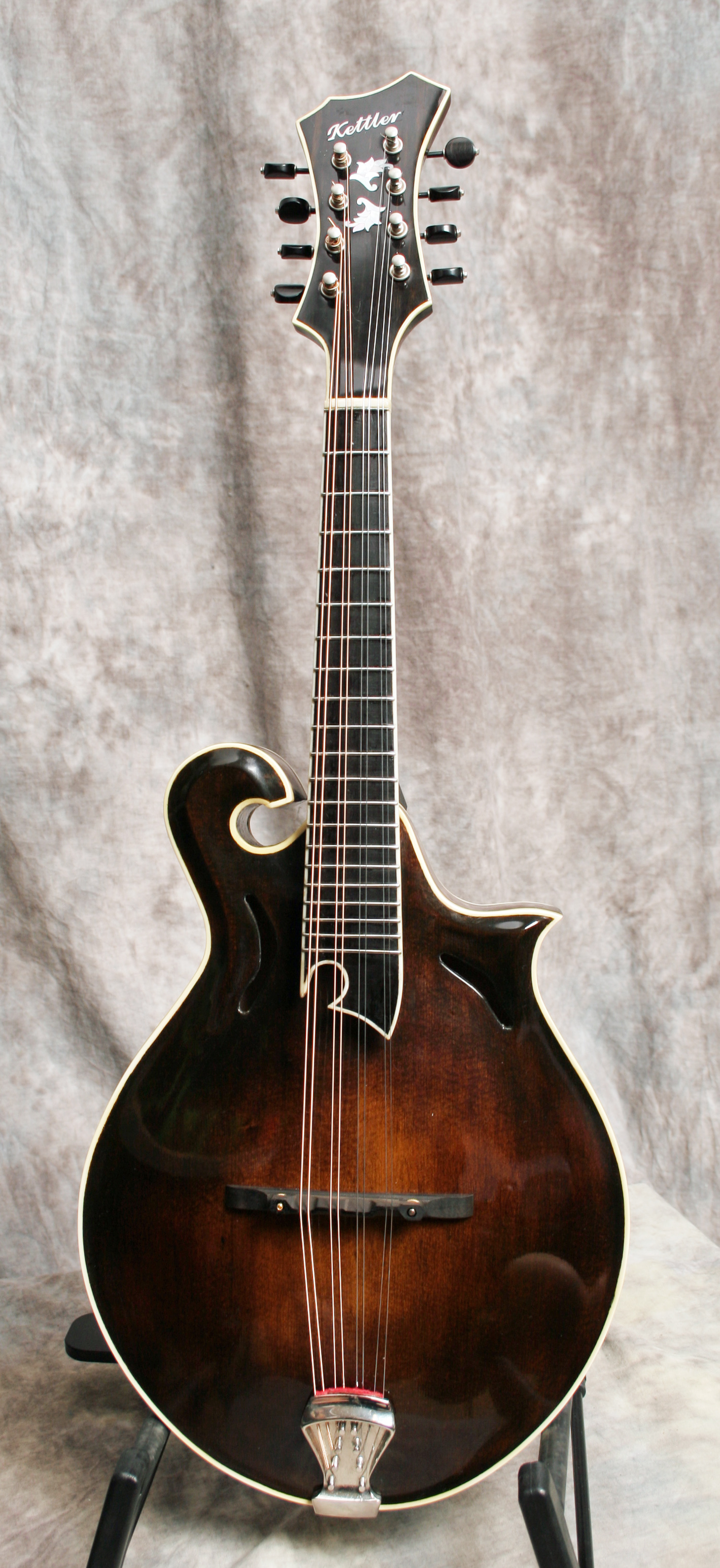 (Serial Number 186) I have owned several Kettler mandolins over the years, and they were all excellent instruments. Near mint condition showing only the slightest signs that it has indeed been played. Original lacquer finish with a Adirondack spruce top, mahogany back and sides, rosewood fingerboard and bridge, one piece tailpiece, 13 7/8 inch scale, and tortoise shell binding. The mandolin is an unusual build, with soundholes in the upper bout and sound ports on the bass side to allow the player to hear the mandolin. Everett Kettler said it is intended to let the entire soundboard vibrate as one pice. I dont know about thatm but this is a very good sounding mandolin. Good neck and frets, plays nice with a low action but still has plenty of volume. All finish and hardware is original. No strap button installed. Comes with a nice hardshell case.