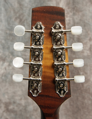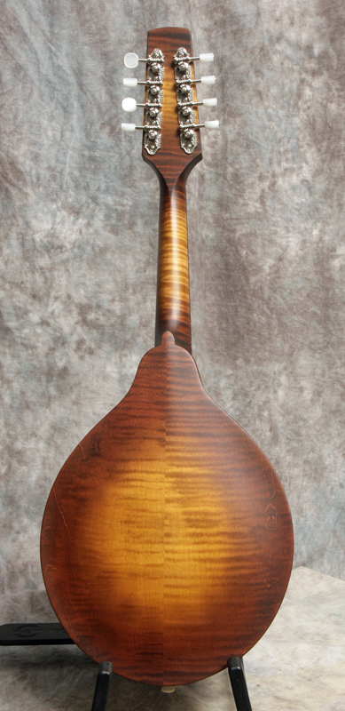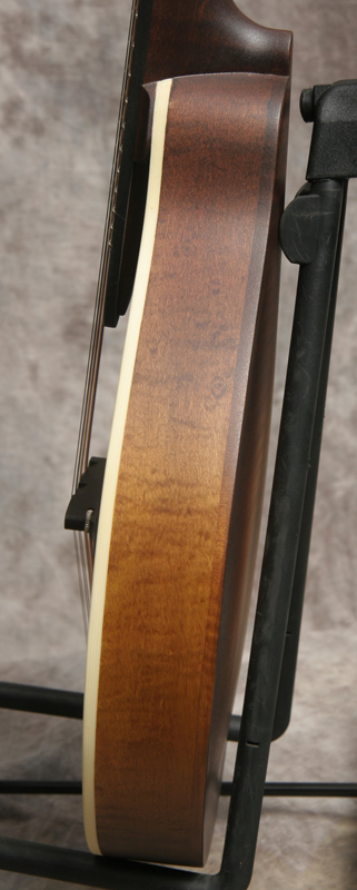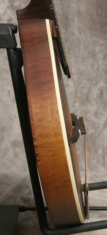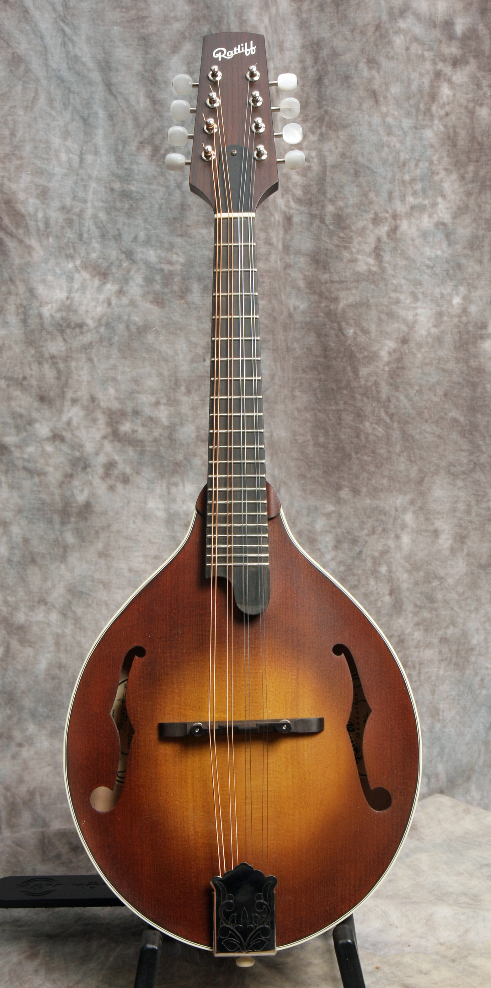 (Serial No. 1280) New with lifetime warranty to the original owner, medium red brown sunburst finish. Audey only builds about 18 mandolins a year. Getting a new one to sell is tough - every dealer out there wants one, as they are excellent mandolins at a good price. Ratliff builds a fine looking and fine sounding mandolin. Build quality is top notch, as good as it gets. This is the Country Boy model R5 from Audey. The Country Boy is built the same as the top of the line RA5 from Ratliff, with a satin finish, less trim, with a single bound top and unbound back and headstock. It still has all the design features that give Ratliffs their tone and power. This is the classic A5 style mandolin with the long neck, f holes, and the elevated ebony fretboard with dot inlays. Nut width is 1 1/8 inch. It features a beautiful flamed maple back and sides, and a flamed maple neck. It also features a hand carved Adirondack red spruce top. Tradional flat fretboard thats slightly shortened to eliminate pick click in the sweet spot. Decal logo. Fit and finish is as good as the big builders, and the sound is there. Here is a short video clip of this instrument played by Nathan Beaumont. Even though it is a new mandolin, it has that woody bluegrass bark and the excellent volume and tone that is typical of these mandolins. Comes with a new shaped hardshell case