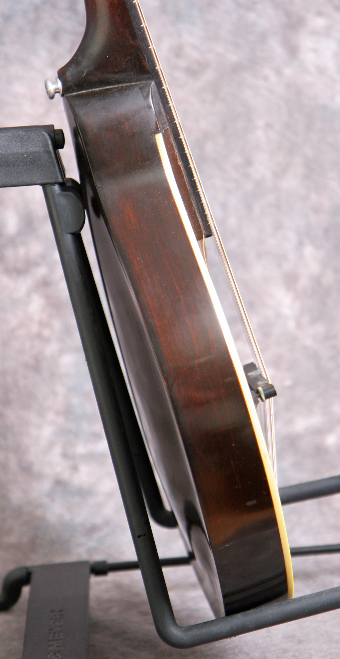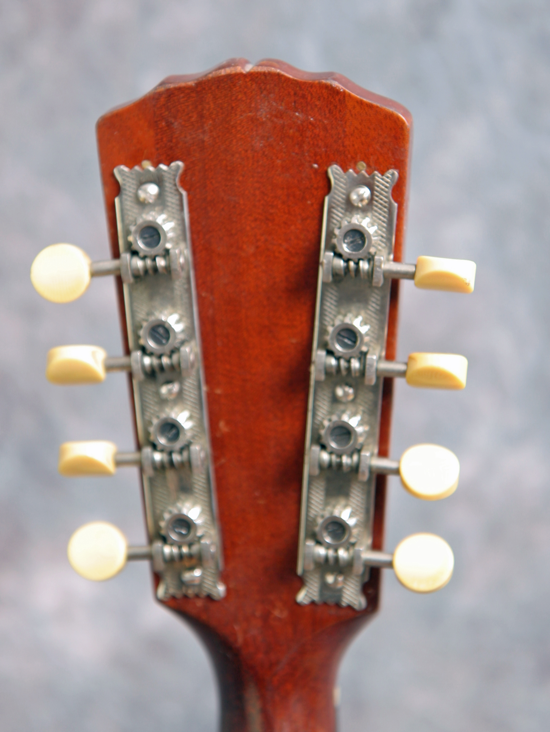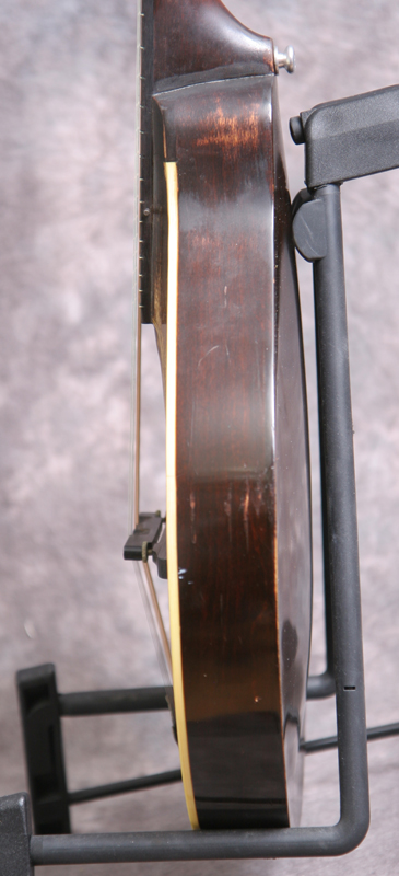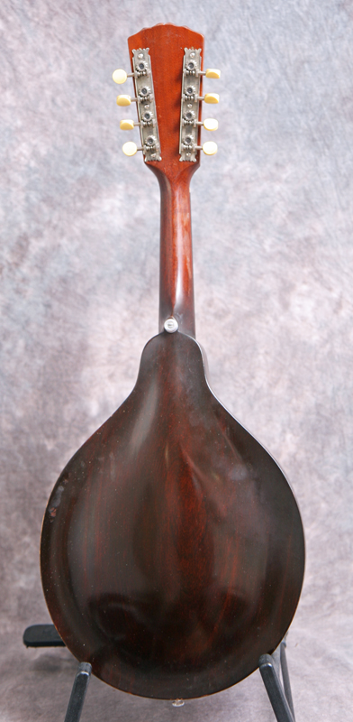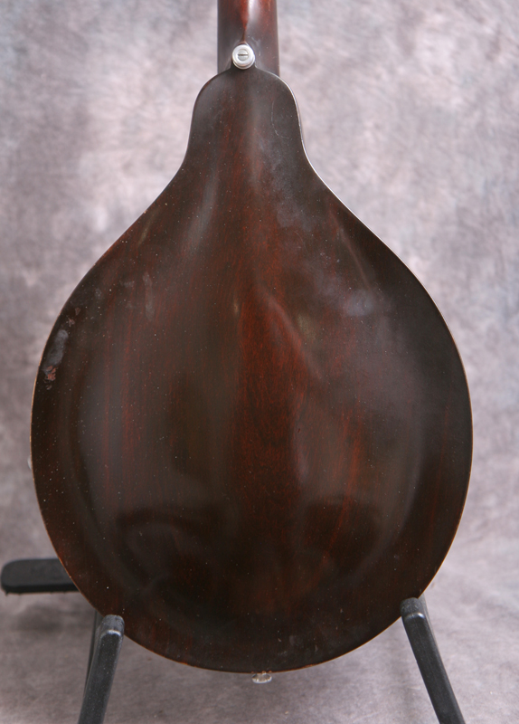 (Serial number 69310 FON 11488) Excellent minus condition showing some playing wear. Sheraton Brown top finish with dark back and sides. No logo in the peghead as built, unbound fingerboard, original Gibson label inside. All finish and hardware are original except missing the pickguard. Shows some pick wear on the top in the pickguard area and some typical minor finish checking on the back but overall a nice solid mandolin. Plays easy with the great round hole tone. Excellent for Celtic, old time and jazz. Comes withthe original hard case.