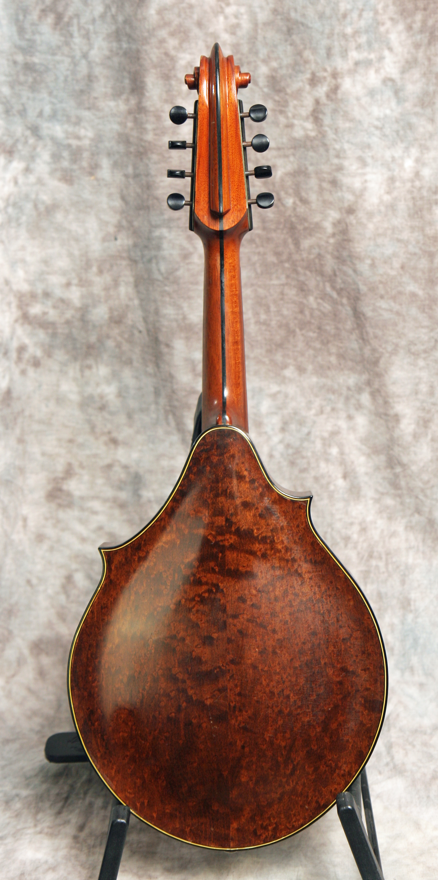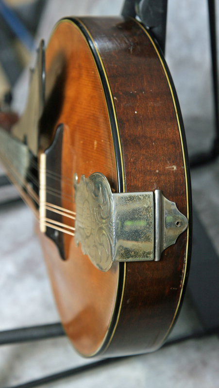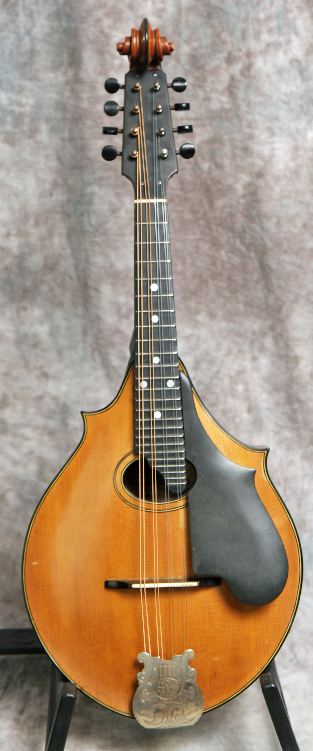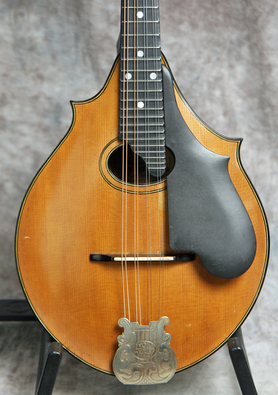 (Serial No.1864) Excellent condition. This instrument is not just gorgeous, but it also sounds it, too. If you've never played a top-flight Lyon & Healy mandolin from this period, they're simply a few evolutionary steps ahead of the competition at the time. These elaborate and beautifully made mandolins were the only really serious competition Gibson ever faced in the high-end carved top 8-string market. Using the finest materials and a thoroughly original design, Lyon & Healy created a timeless classic in the Style A. The violin scroll headstock is immediately distinctive, but the 2-point body, shaped pickguard, and clamp tailpiece cover are all signature features. The sound of these instruments is more delicate and lighter than most Gibsons, with a nicely rounded top end and less "bark". They have been considered since the 1920's to be the best instruments ever made for classical mandolin playing. I am always impressed by both the sound and craftsmanship of the Lyon & Healy mandolins, and the top of the line Style A is an extremely fine instrument worthy of any player's or collector's attention. This one was made around 1922 in Chicago and has a Chas. H. Ditson label inside which also shows it was made by Lyon and Healy. This mandolin features an assymetrical 2 point body shape, birdseye maple for the back and sides, solid Adirondack spruce top, a 13 inch scale, radiused fretboard, clamp tailpiece with the most amazing cover ever, a vulcanized rubber headstock faceplate and removable floating pickguard, and the most beautiful violin style carved headstock. Frets are good, neck set is good, finish and parts are original. I took this in trade from a famous Nashville musician, who used this instrument in concert for many years. There are NO repairs or cracks. Comes with the original hard shell case.