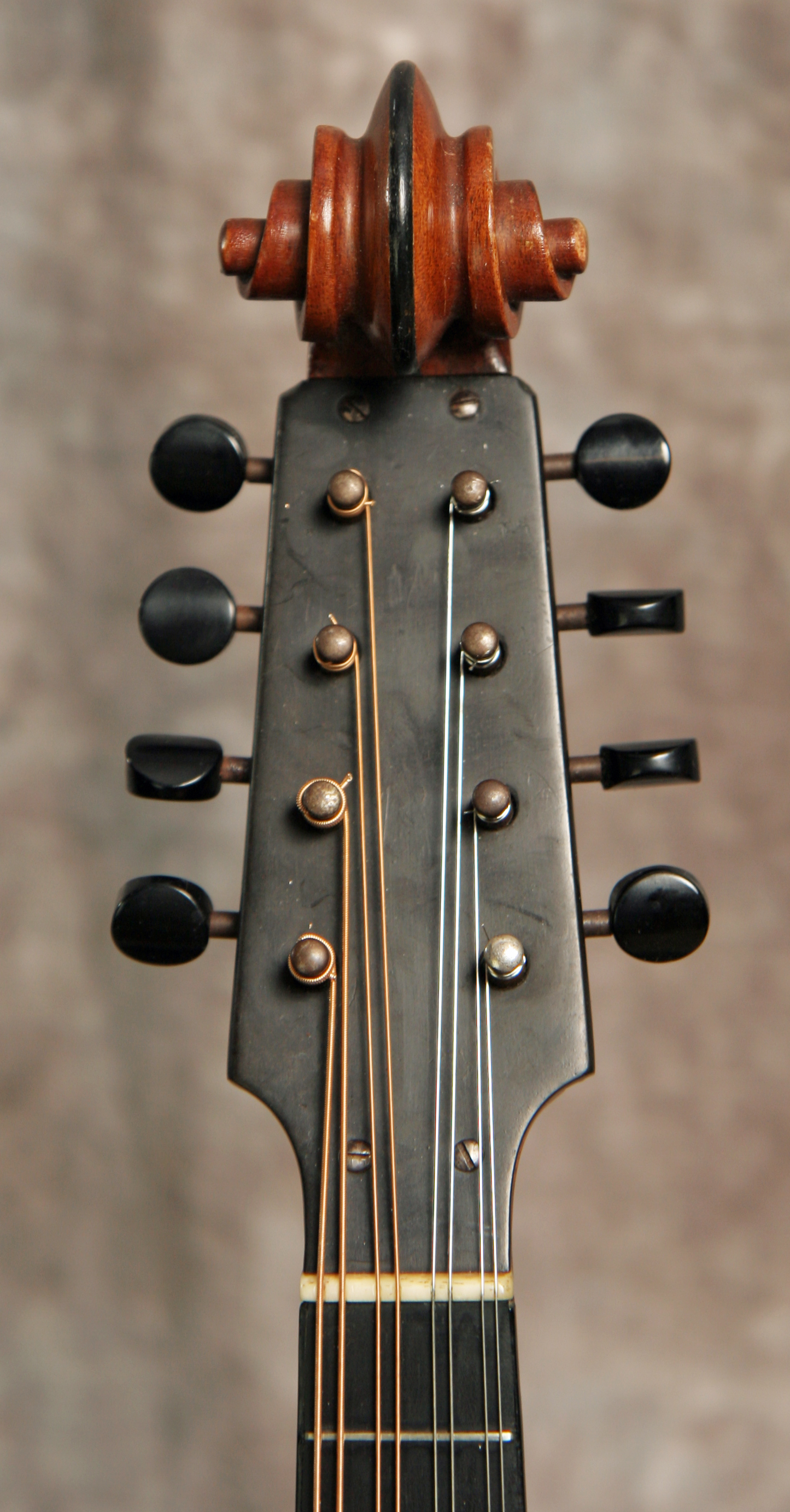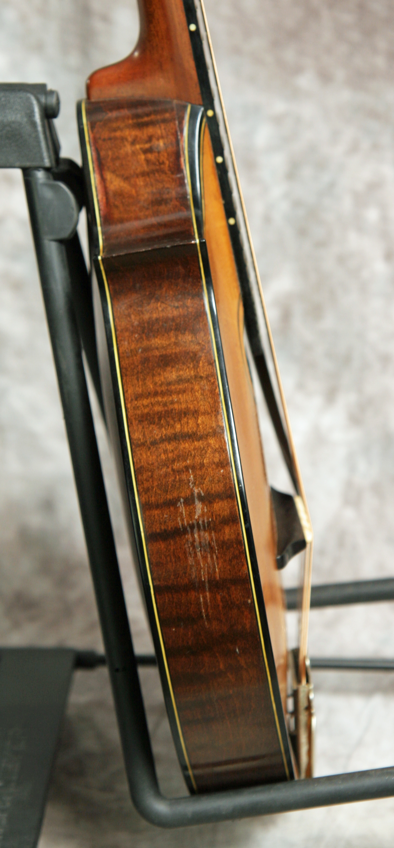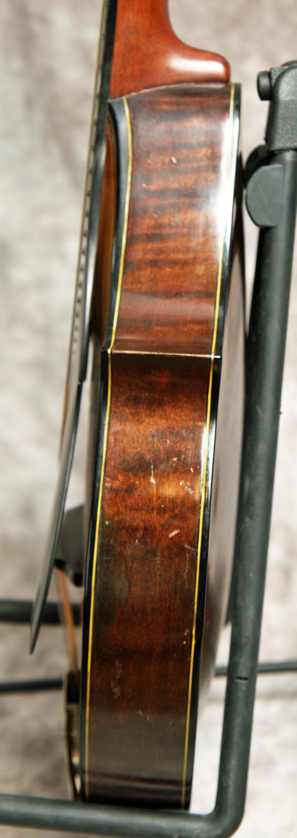 (Serial No.1864) Excellent condition. This instrument is not just gorgeous, but it also sounds it, too. If you've never played a top-flight Lyon & Healy mandolin from this period, they're simply a few evolutionary steps ahead of the competition at the time. These elaborate and beautifully made mandolins were the only really serious competition Gibson ever faced in the high-end carved top 8-string market. Using the finest materials and a thoroughly original design, Lyon & Healy created a timeless classic in the Style A. The violin scroll headstock is immediately distinctive, but the 2-point body, shaped pickguard, and clamp tailpiece cover are all signature features. The sound of these instruments is more delicate and lighter than most Gibsons, with a nicely rounded top end and less "bark". They have been considered since the 1920's to be the best instruments ever made for classical mandolin playing. I am always impressed by both the sound and craftsmanship of the Lyon & Healy mandolins, and the top of the line Style A is an extremely fine instrument worthy of any player's or collector's attention. This one was made around 1922 in Chicago and has a Chas. H. Ditson label inside which also shows it was made by Lyon and Healy. This mandolin features an assymetrical 2 point body shape, birdseye maple for the back and sides, solid Adirondack spruce top, a 13 inch scale, radiused fretboard, clamp tailpiece with the most amazing cover ever, a vulcanized rubber headstock faceplate and removable floating pickguard, and the most beautiful violin style carved headstock. Frets are good, neck set is good, finish and parts are original. I took this in trade from a famous Nashville musician, who used this instrument in concert for many years. There are NO repairs or cracks. Comes with the original hard shell case.