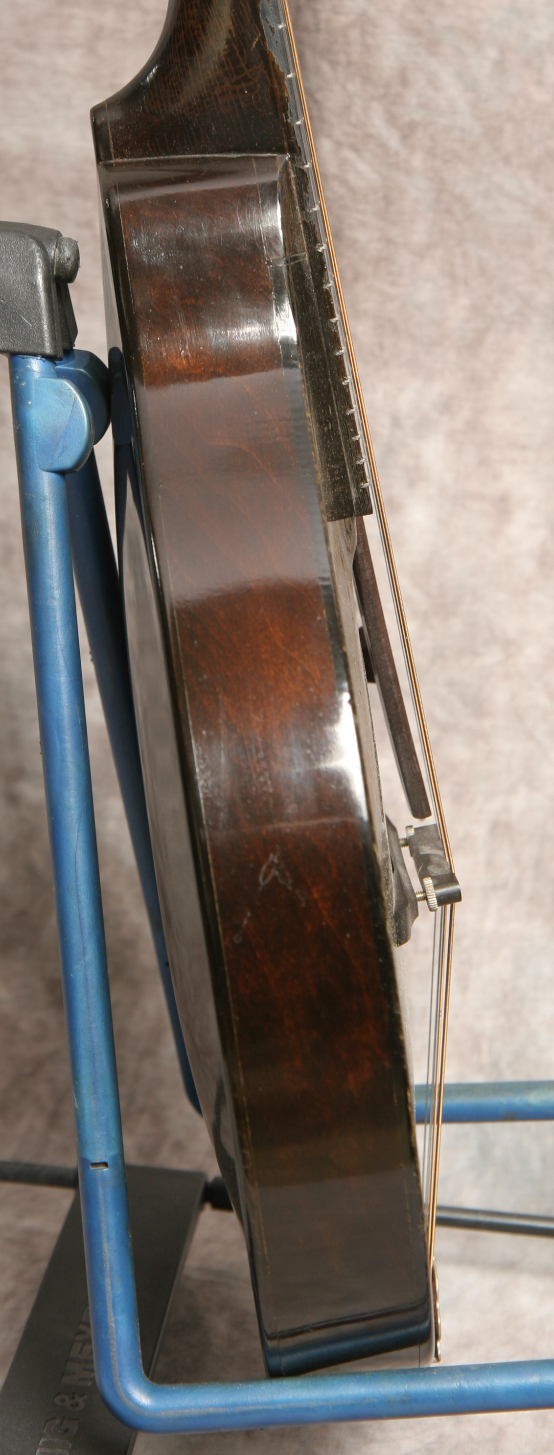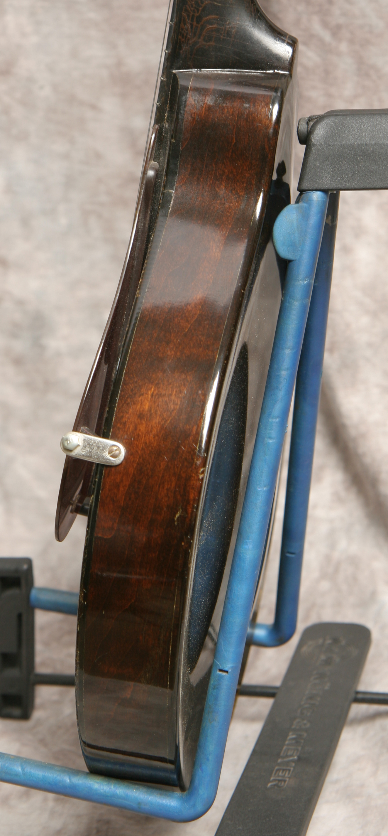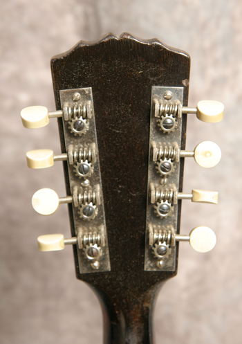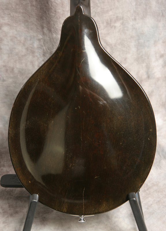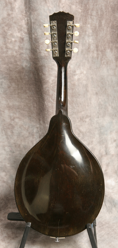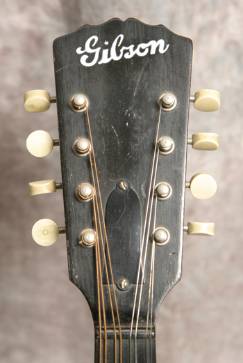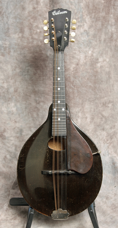 (Serial No. 87742) Excellent condition. Original Sheraton Brown finish and hardware, Adirondack spruce top with an oval hole, carved back, dark stained mahogany back, sides and neck, truss rod, original pickguard, white script silkscreened "Gibson" peghead logo, clamshell tailpiece cover, original ebony nut. Strap button added at the tailpiece screw. Nice playing and sounding instrument with no issues. Shows a little playing wear as expected. All finish and hardware is original. Frets are fine, neck set is good, nice loud mandolin - excellent volume. Comes with a nice case.
