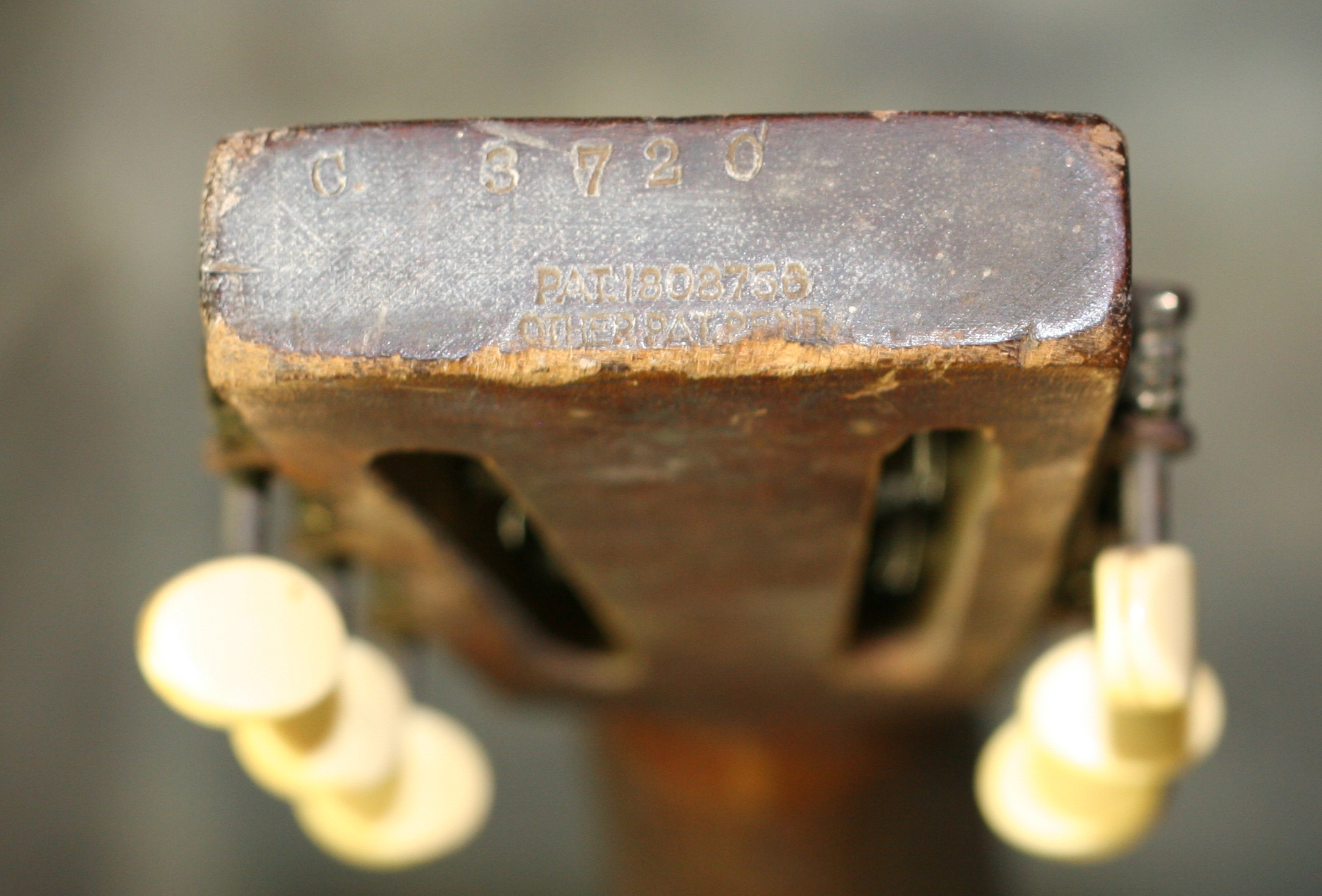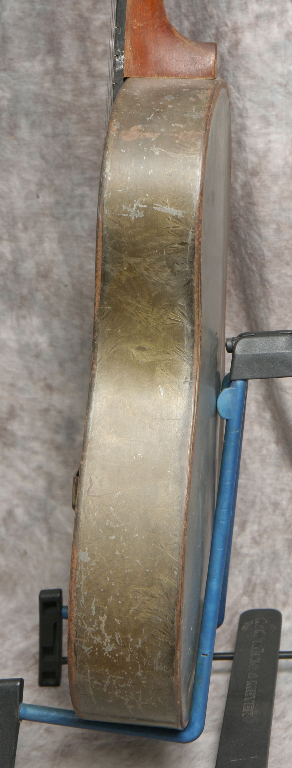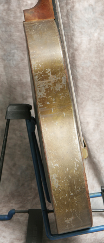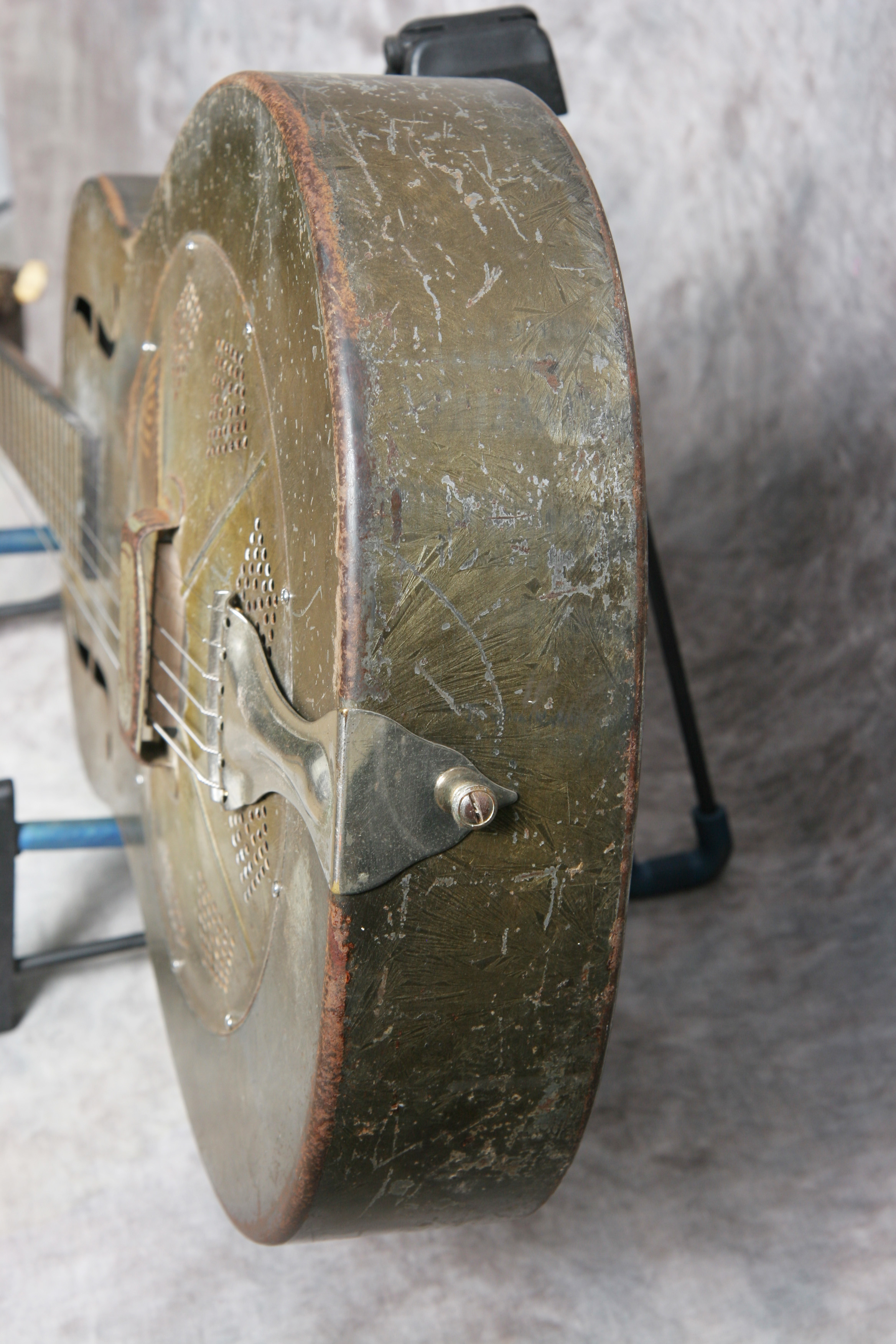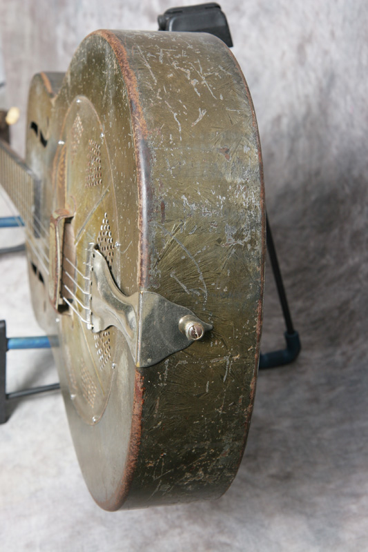 (Serial No. C3720 pat pending) Blues approved! Excellent condition. Its hard to date Nationals exactly. This one is in the 1930-1933 time frame due to the features. Has the original cool grey/green Duco crystal finish on the top and sides, and the back has been painted grey to match the undercoat on the top. Has the 12 fret body, original neck, slot peghead and the pre-1933 flat f-holes. The tuners are modern Stewart-Macdonald reproductions (I think), which work fine; the rest of the hardware is original. The fretboard is in good condition. Its been refretted and the neck was reset at that time. The cone looks original - please see the pic below. The front of the peghead is stamped National Duolian and the serial number stamp and the words Pat Pending is on the top edge of the peghead. No structual repairs noted. Strap button added at the heel. Neck is straight, neck set is excellent, and the guitar has the sound you are looking for in a metal body. It plays very nicely - it was set up by my luthier. Here is a video clip of this guitar as played by Ed Wright of Brandon, FL. Comes with a newer hard shell case.