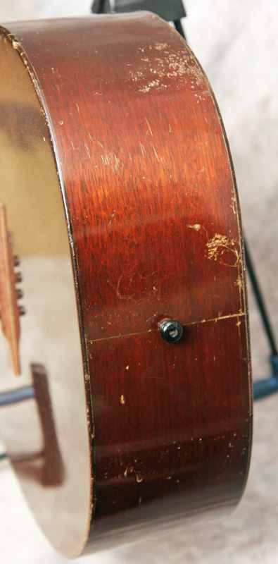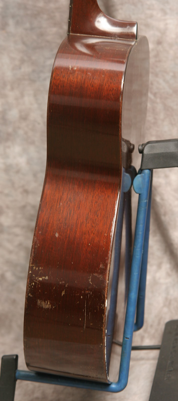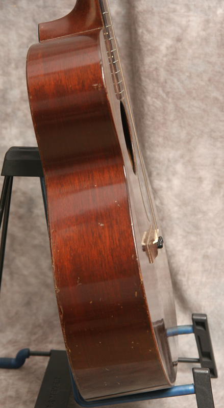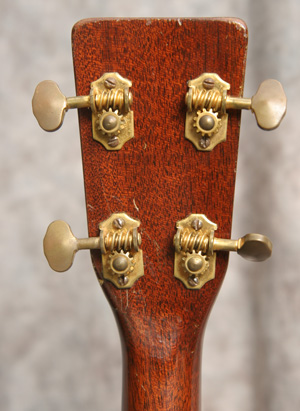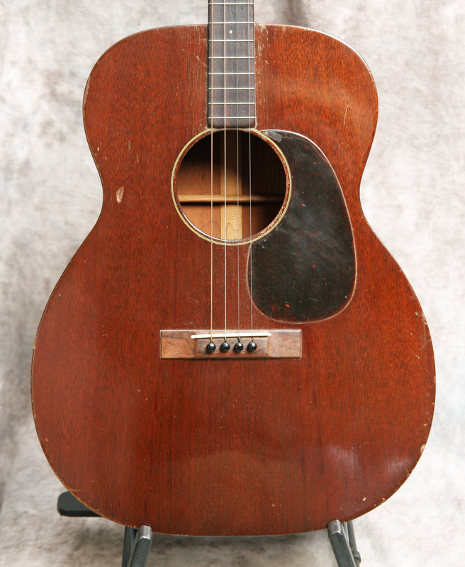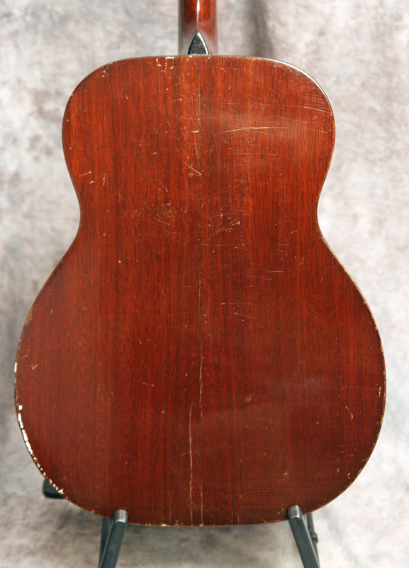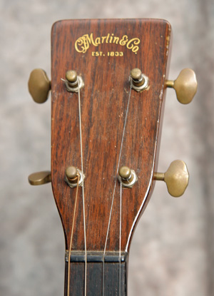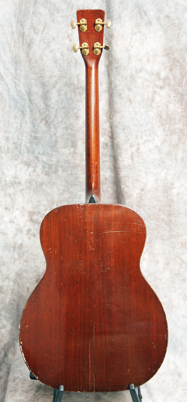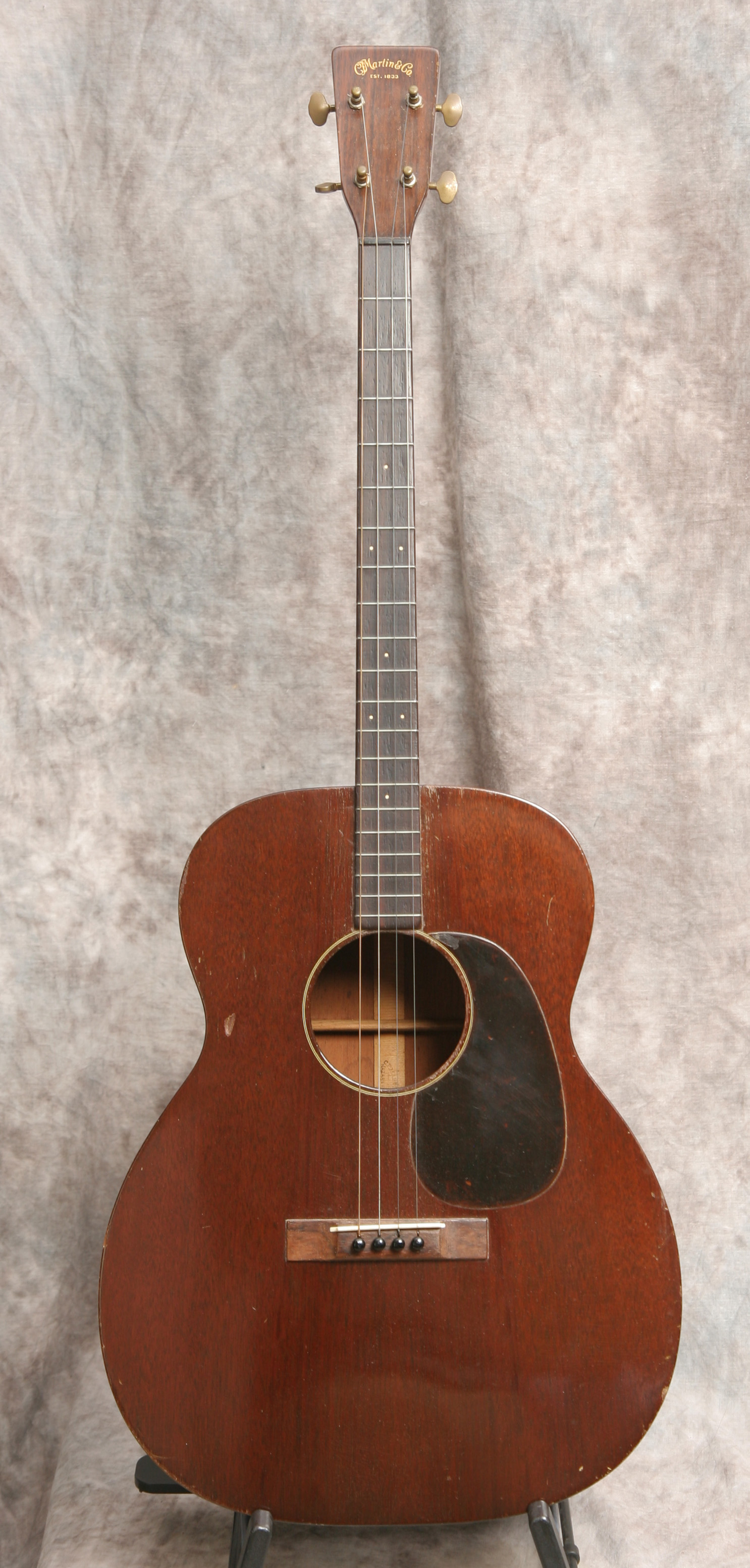 (Serial No. 60218) The early 30s were something of a magical time for the instruments being constructed in Nazareth. It seems that Martin and Co. had really hit their stride in building steel-string guitars; and to many, the instruments built in the early 30s represent the apex in all things acoustic guitar. This is a delightful 30s tenor guitar. All hardware and finish is original. The tenor guitar was initially developed in the mid to late 1920s. Tenor guitars enabled players of the four-string tenor banjo to double on guitar without having to learn the six string guitar. The tenor guitar can be considered to be a transition instrument between Dixieland banjo and the six string swing guitar, particularly as it started to outpace the tenor banjo in popularity towards the end of the 1920s. The usual tenor tuning is CGDA, but I tune tenor guitars to octave mandolin tuning (GDAE), which brings out more of the warmth, low end, and overtones the instrument has to offer. This guitar has a clean fundamental, excellent upper mid-range presence, and a beautiful sustain. It has a throaty mid-range when hit hard, and pretties up under a lighter attack. The guitar is in excellent minus condition showing some minor playing wear. These small body all mahogany Martins are great for blues, with that warm sound only a mahogany top will give. Has the scalloped bracing and the larger neck of the 1930s guitars with a 23 inch scale, bar frets, and a 1 1/8 inch nut. There is one minor back crack on the lower bout that was repaired and a ding on the top near the sound hole but thats about it. It does have the usual nicks and dings of a guitar used to play music for decades. Neck has the typically slightly beefier profile that is the hallmark of the best 30s 14-fret Martins. Has the original ebony nut and the original clip point tuners. Plays great with a nice low action and has a huge sound all out of proportion to the small size. This guitar has a full and deep dry voice with enough of a push in the midrange to keep any ragtime picker happy, but plenty of warmth and openness across the strings to satisfy a melodic single note picker. It offers that thunderous response in the bass-end, and a sweet and well-rounded treble. Comes in the original soft case!