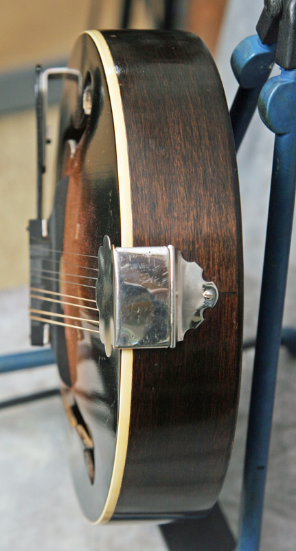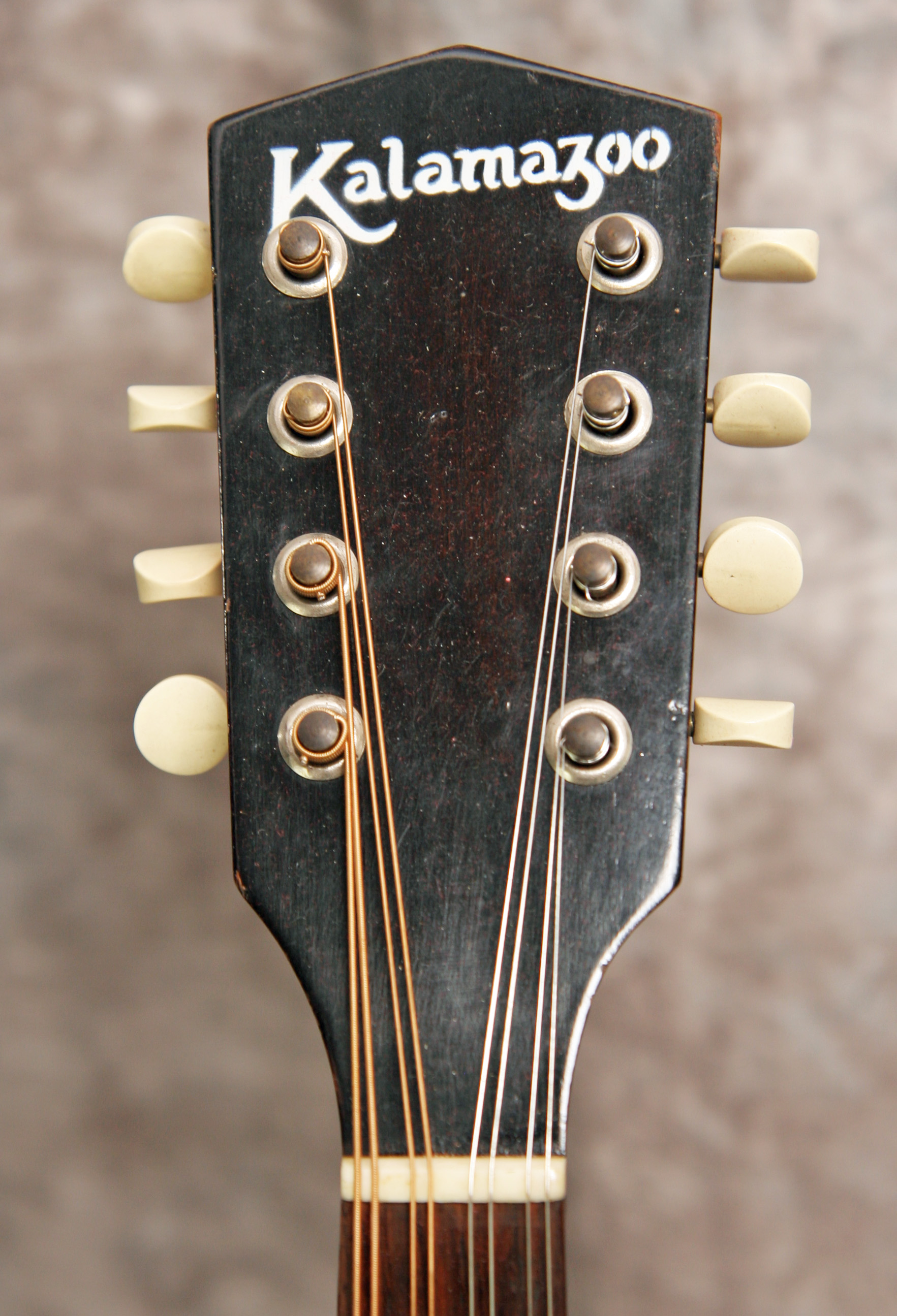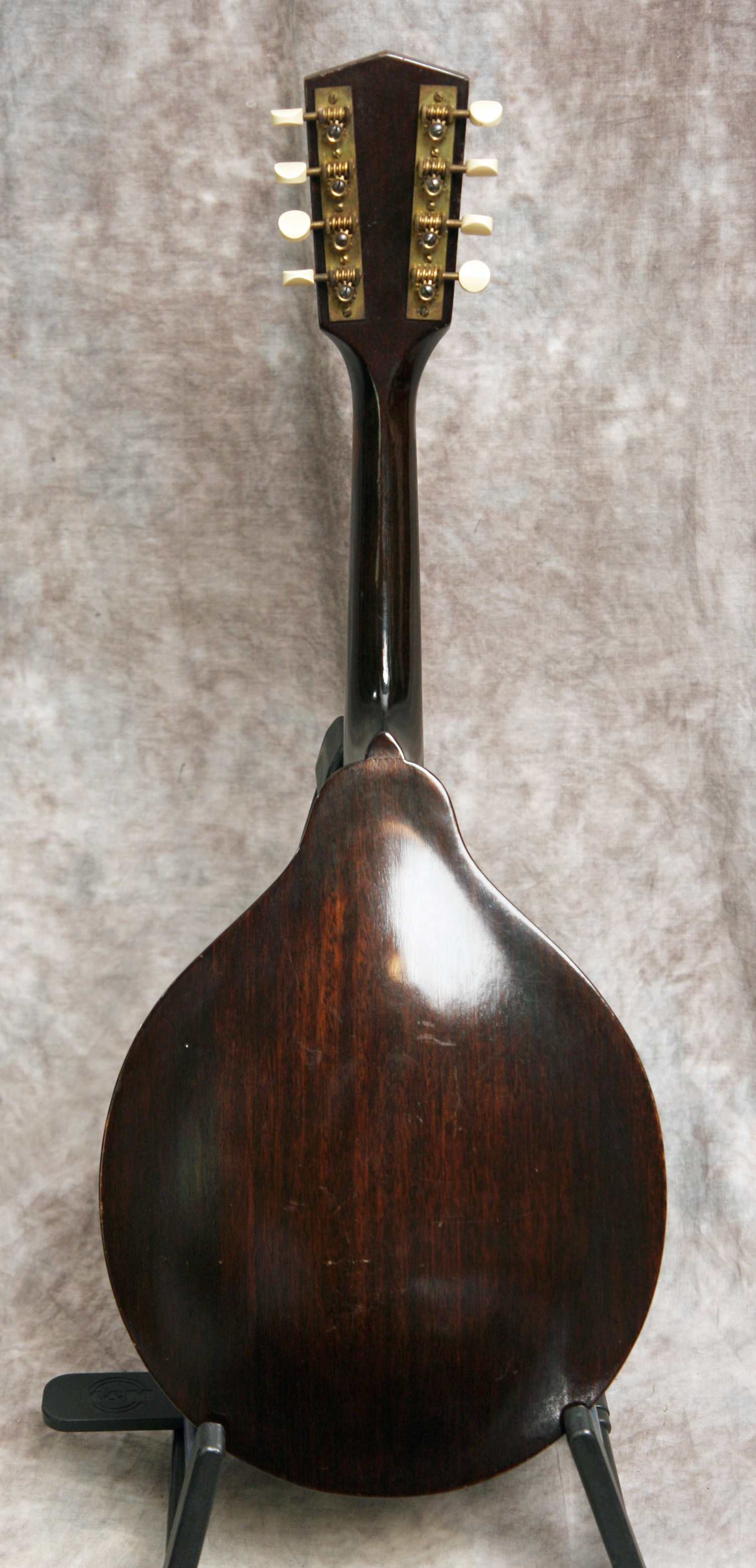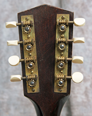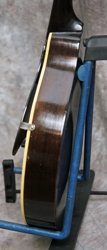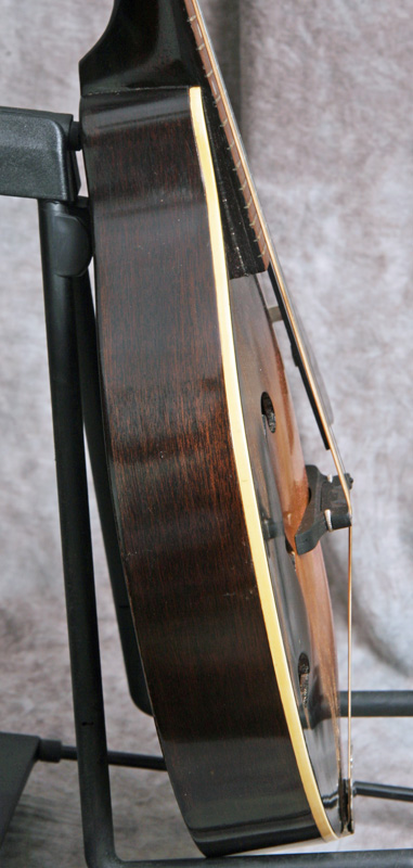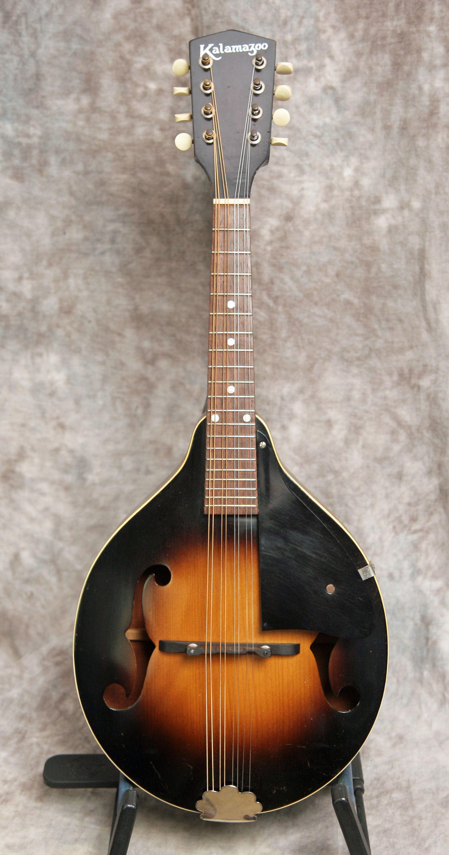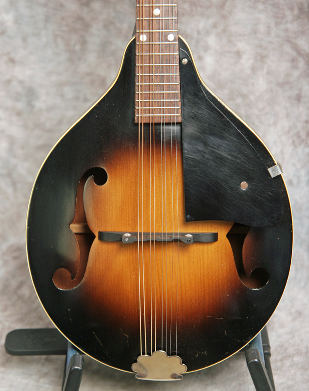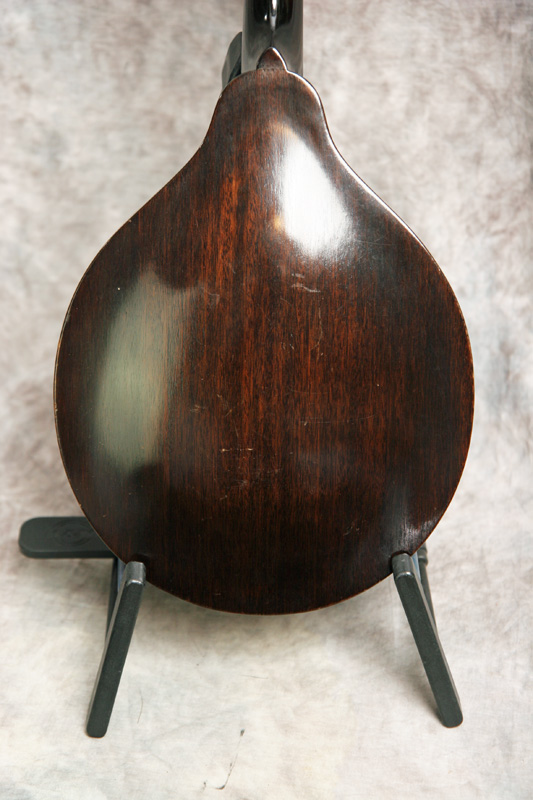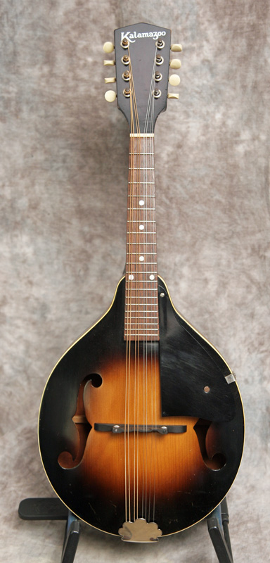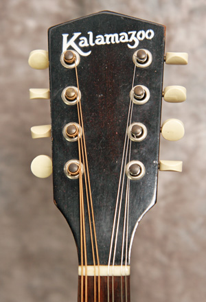 (Serial number: none) Excellent condition. Kalamazoo was the budget or student line for Gibson. Note that the instruments were made by Gibson in house. This mandolin has mahogany back and sides, an Adirondack (red) spruce top, and a flat rosewood fretboard with a 1 1/8 inch nut and a 13 7/8 inch scale. The neck is straight and in set, and the frets were just dressed and still have plenty of life left. Top bound only. It has a woody and punchy tone with strength through the upper midrange and fat treble string response. Rounded V neck profile, completely original, including finish, frets, nut, tuners, bridge, pickguard, and tailpiece. Click here for a video clip of this mandolin as played by Nathan Beaumont and here for another video clip of this mandolin as played by Joe Donahue. Comes with a case.