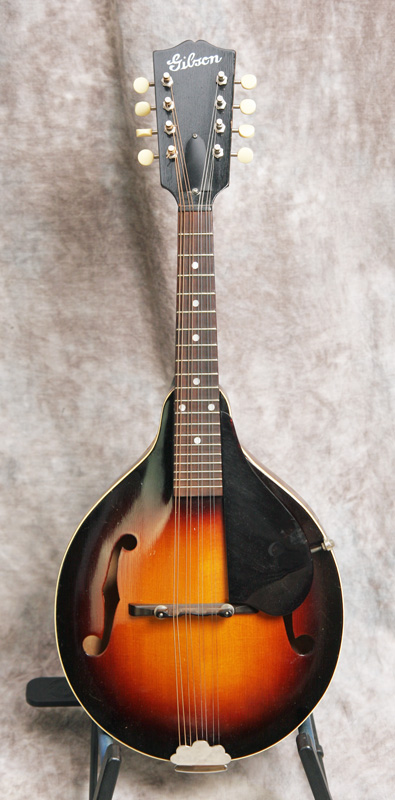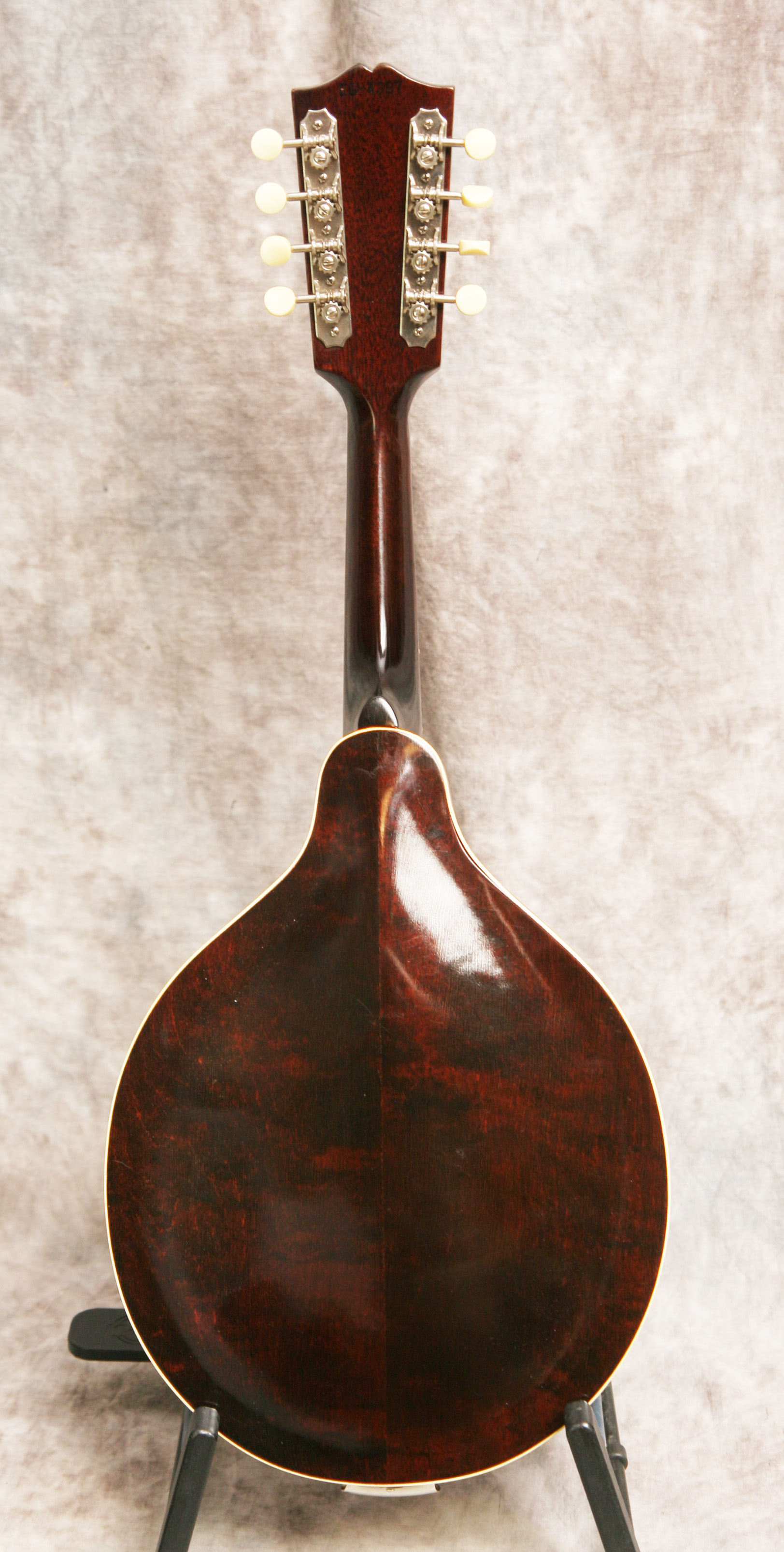 spruce top with F holes, dark stained nicely figured maple back, sides and neck, white script silkscreened "Gibson" peghead logo, clamshell tailpiece cover. Ebony bridge and tailpiece. It does not have a back brace, so according to book it is an A1. These were used a lot in bluegrass as not everyone could afford a F5.
