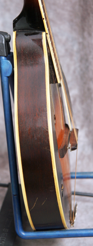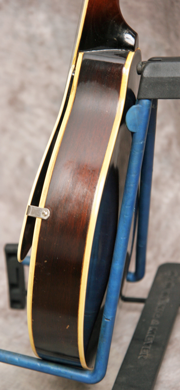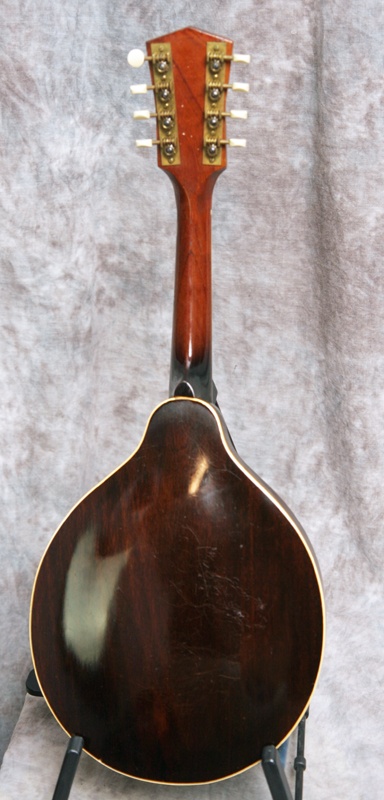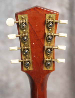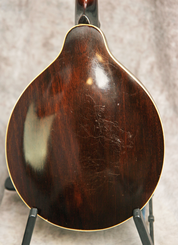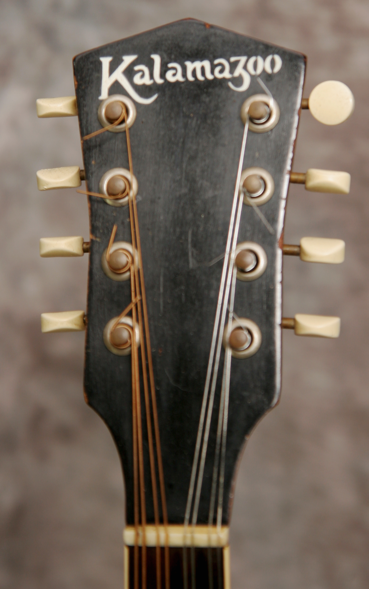 (Serial number: none) Excellent condition. Kalamazoo was the budget or student line for Gibson. Note that the instruments were made by Gibson in house. This mandolin has mahogany back and sides, an Adirondack (red) spruce top, and a flat rosewood fretboard with a 1 1/8 inch nut and a 13 7/8 inch scale. The neck is straight and in set, and the frets were just dressed and still have plenty of life left. Fully bound on the body, neck, peghead and pickguard. It has a woody and punchy tone with strength through the upper midrange and fat treble string response. Rounded V neck profile, completely original, including finish, frets, nut, tuners, bridge, and tailpiece. Comes with a case.