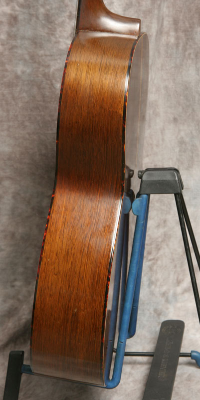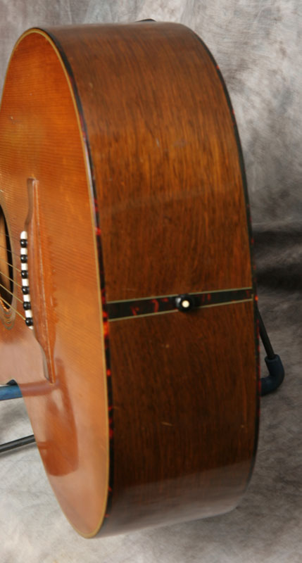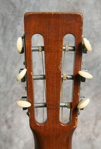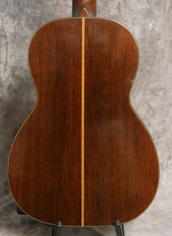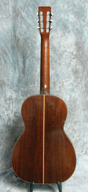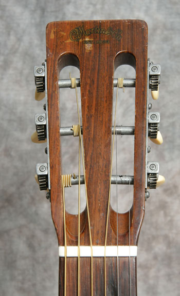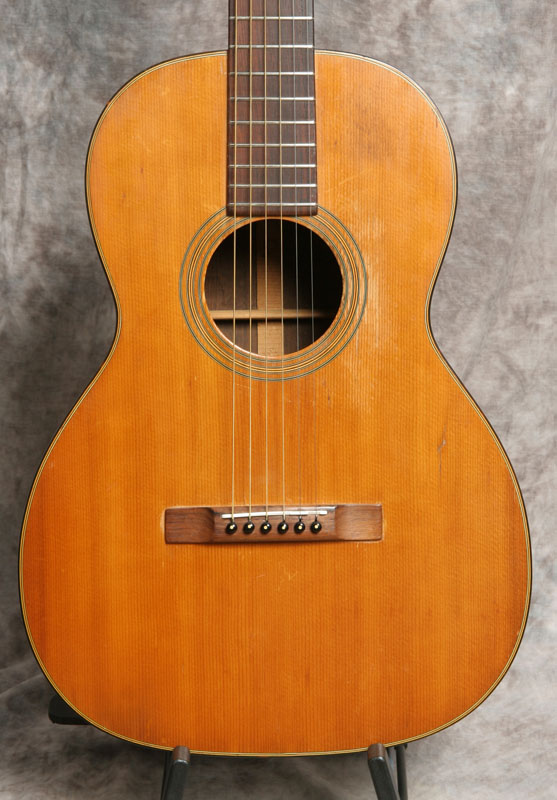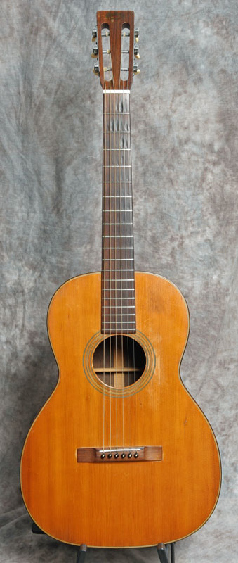 (Serial No. 203881) The Martin 00-21NY is as close as the 1960's Martin company got to making a 1920's guitar. The "folk boom" of the late '50's made the old-style 12-fret stotted peghead Martins fashionable among discerning traditional players, and several "New York' models were officially added to the line from 1962-1970. These were named to honor both the Martin company's original roots in that city and the strength and influence of the contemporary Greenwich Village folk scene. The blank fingerboard, satin lacquer finish, smaller rectangular bridge, and lack of a pickguard certainly gives it a more vintage vibe, but rest assured these models were intended for steel strings and work well with light gauge bronze. That doesn't mean this one wouldn't sound good with silk & steel strings, however, which would make for even easier string action, and it's very easy with the light gauge steel strings that are on it now. The tuners look like the Stew Mac exact replicas. Has a 1 7/8 inch nut. The nut, bridge (reglued) and bridge pins, and finish are all original. Nice Brazilian rosewood back and sides with a Sitka spruce top. No repairs or cracks. It does show some playing wear, with some fretboard divots in the positions near the nut and some pick wear at the edge of the soundhole. Nice low action well suited to fingerstyle playing. It has a bigger sound than is typical of a 00-21, with a lot more bass response. Comes with the original green lined hardshell case.