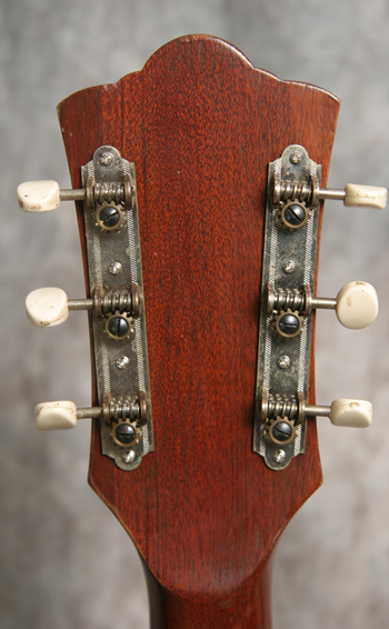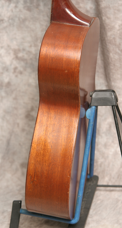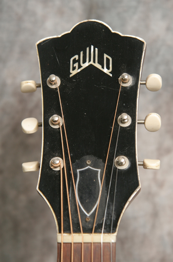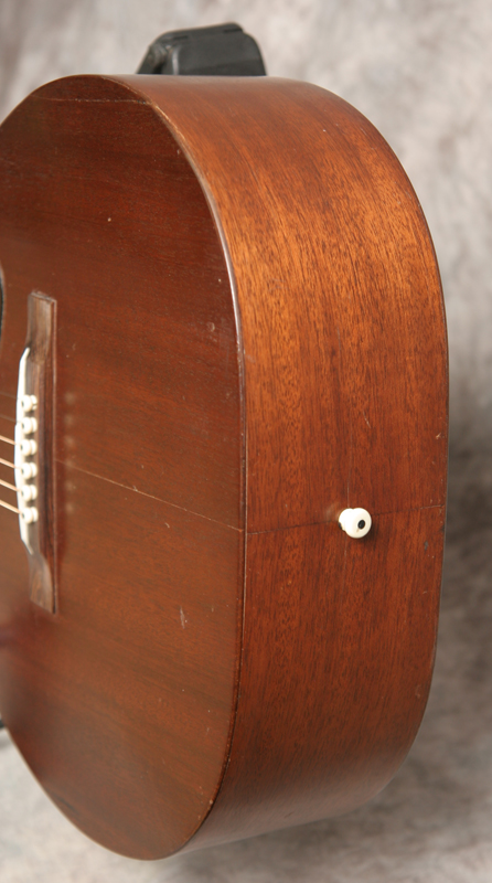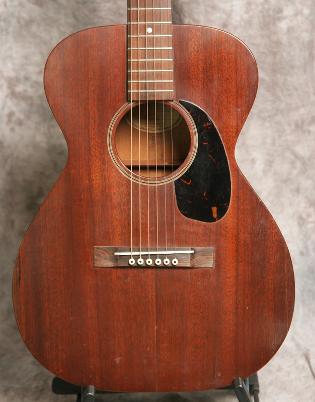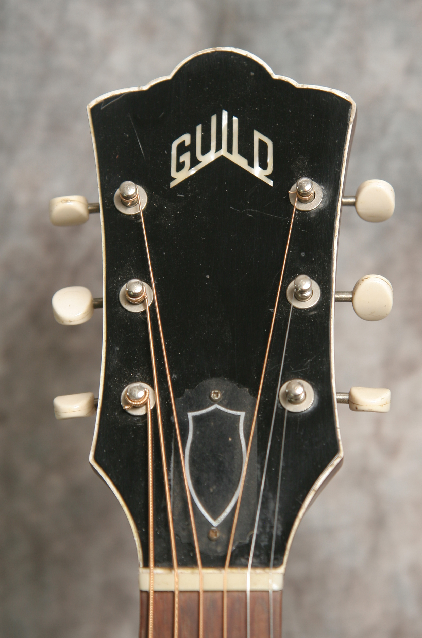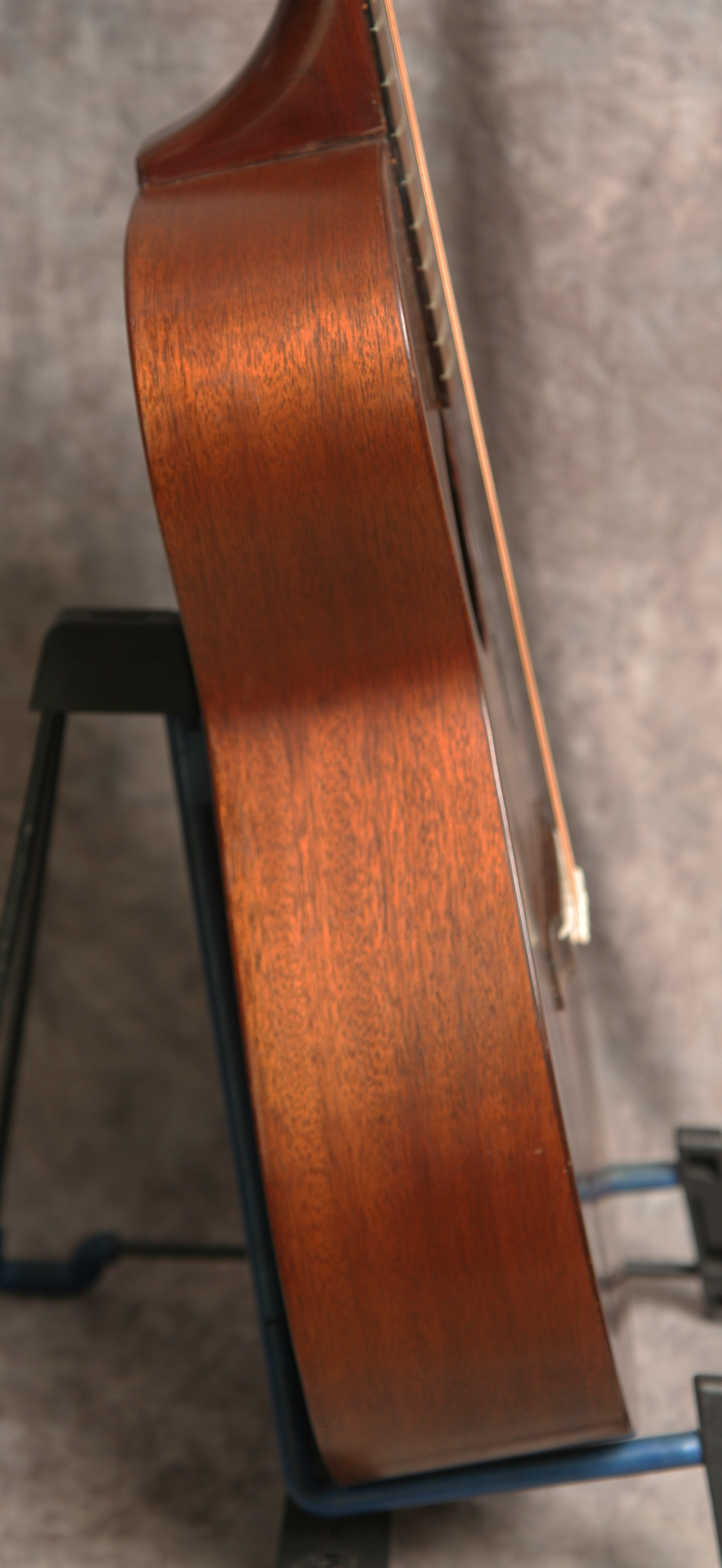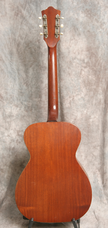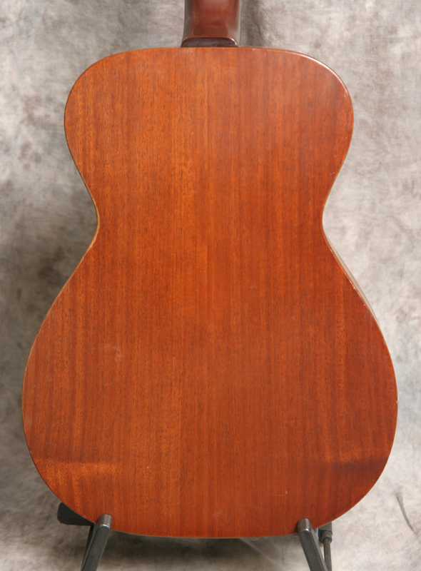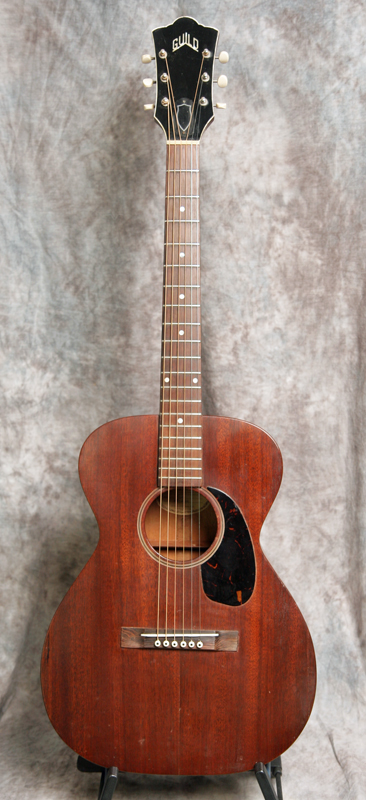 (Serial No. AH2336) Very good plus condition. Made in Hoboken, NJ. After Nick Drake appeared seated with a Guild M20 on the cover of his 1971 album, Bryter Layter, the instrument became closely associated with the singer songwriter and his particular approach to the guitar. This is fine example, a concert size guitar with a x-braced top, back, and sides constructed of solid mahogany. The compact dimensions of the M20s concert body style ensure that it's very comfortable to play and sings with a midrange-focused tone that is marvelous for strumming or fingerstyle playing. With no binding and only the plainest inlay, the M20 has a very austere look but a smooth, expansive sound for an all mahogany guitar. The body is 13 7/8 inches at the lower bout and the nut is 1 11/16 inch. The headstock is faced with the typical Guild plastic overlay, with just a bit of the usual shrinkage. This guitar has some wear overall but is a lovely little guitar with a very responsive sound. There is small top crack on the edge of the treble bout that has been repaired, and the neck was recently reset by luthier Jack Dillen. Here is a video clip of this guitar as played by by James Hurlburt of Plant City, FL. Overall a very good playing and sounding M20. Comes with a cardboard case.