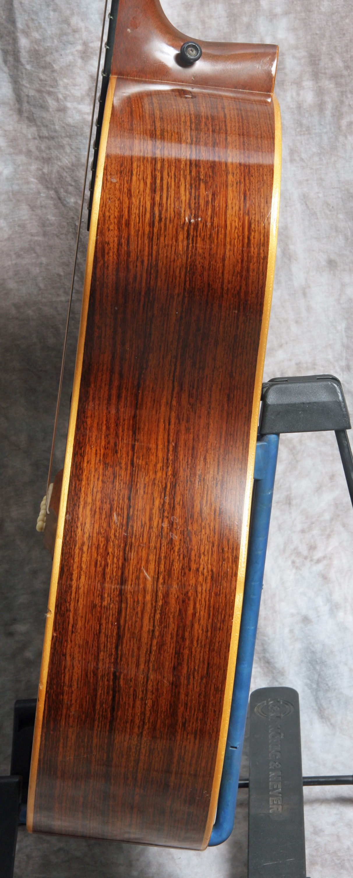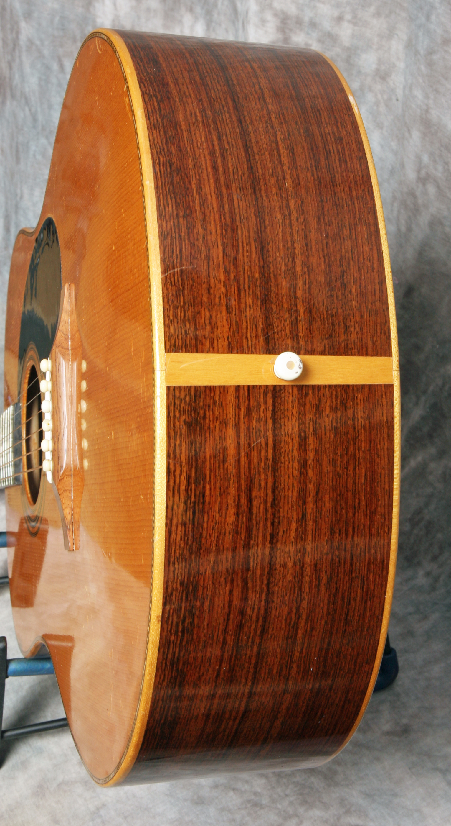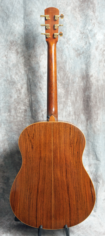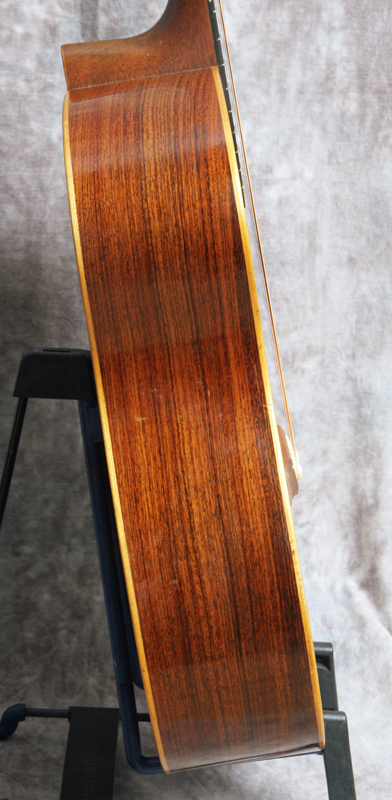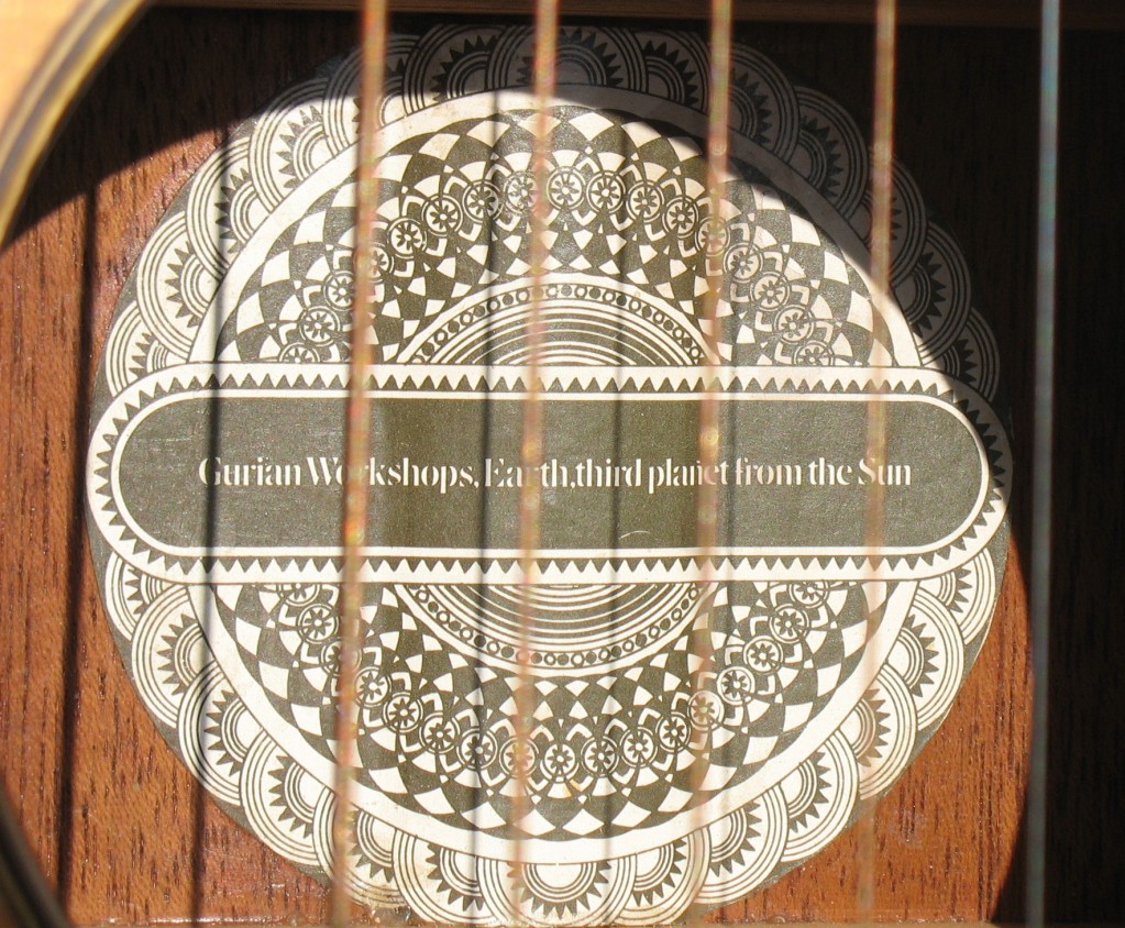 (Serial No. C1235) Excellent condition showing some typical playing wear. Here is one of American luthier Michael Gurian's J-R Jumbo Rosewood models made in the mid 1970's in Hinsdale, New Hampshire. Although he called it a jumbo, it is not as large as a Gibson J-200 but is instead more akin to a jumbo OM with the top being 15.5 inches across the lower bout. Gurian got his start building classical guitars and even though this is a steel-string guitar, it has a lot of classical elements such as the slightly rounder, less squared-off body, a plain fretboard and wooden binding. Has a Sitka spruce top and Indian rosewood back and sides. The binding is maple and a fine rope-pattern purfling borders the top. The rosette features a herringbone center and wooden outer rings. Scale length measures in a 25.6", nut width is 1-5/8", and the neck has a comfortably asymmetrical rounded profile. Gurian guitars sound really good and they play very nicely. This example was obviously well loved and played and would be perfect instrument for someone looking for a robust but well-mannered fingerpicking guitar. The guitar is clean throughout and in excellent structural and cosmetic condition with a fast playing neck typical of Gurians. The tone of the guitar is deep, warm and rosewood mature revealing the clarity of each note. Gurians are rare high quality acoustics that have been played by pros like Jackson Browne, Paul Simon, Pierre Bensusan and of course many others. As a side benefit, Gurians have the best label ever inside! It reads "Gurian Workshops, Earth, third planet from the Sun". Comes with the original blue lined hardshell case.