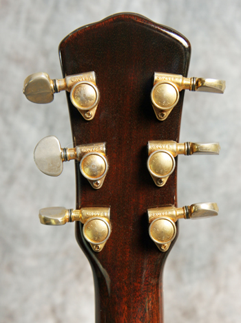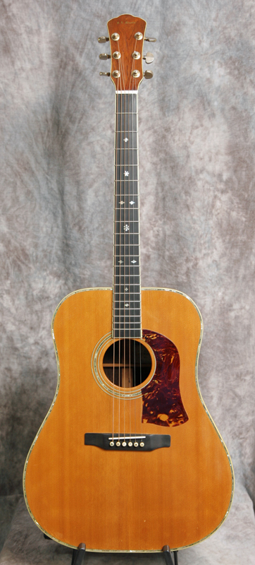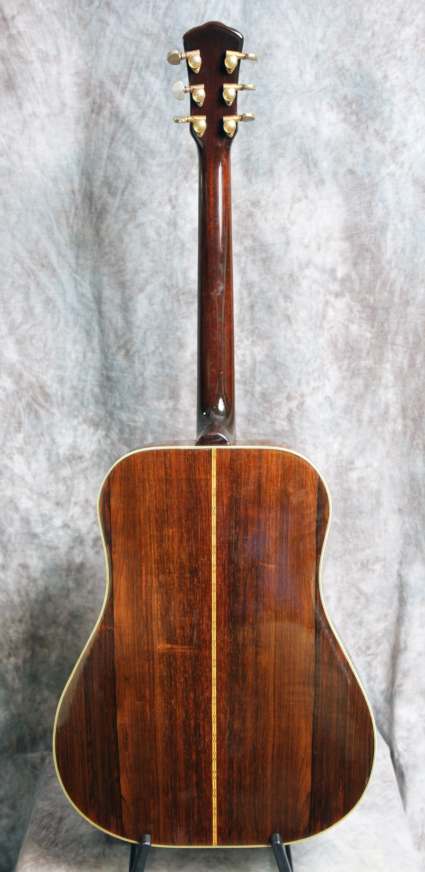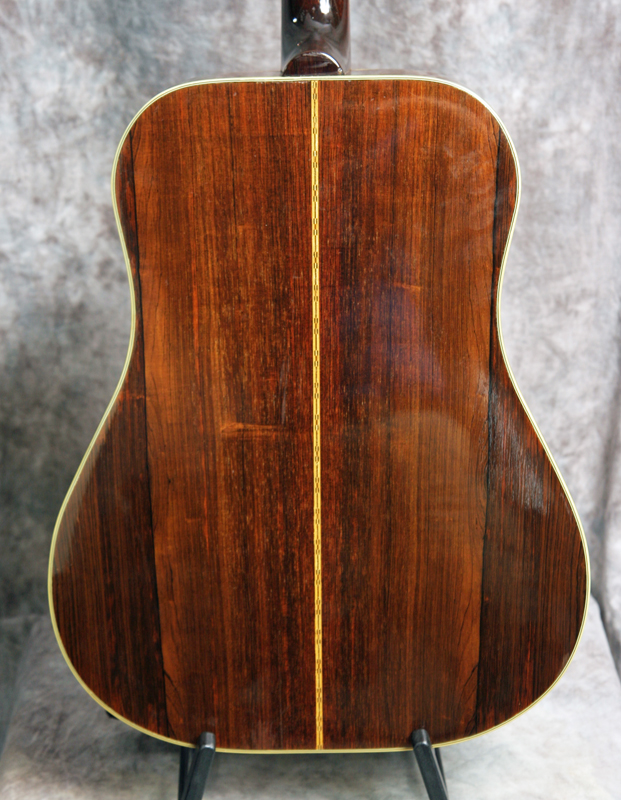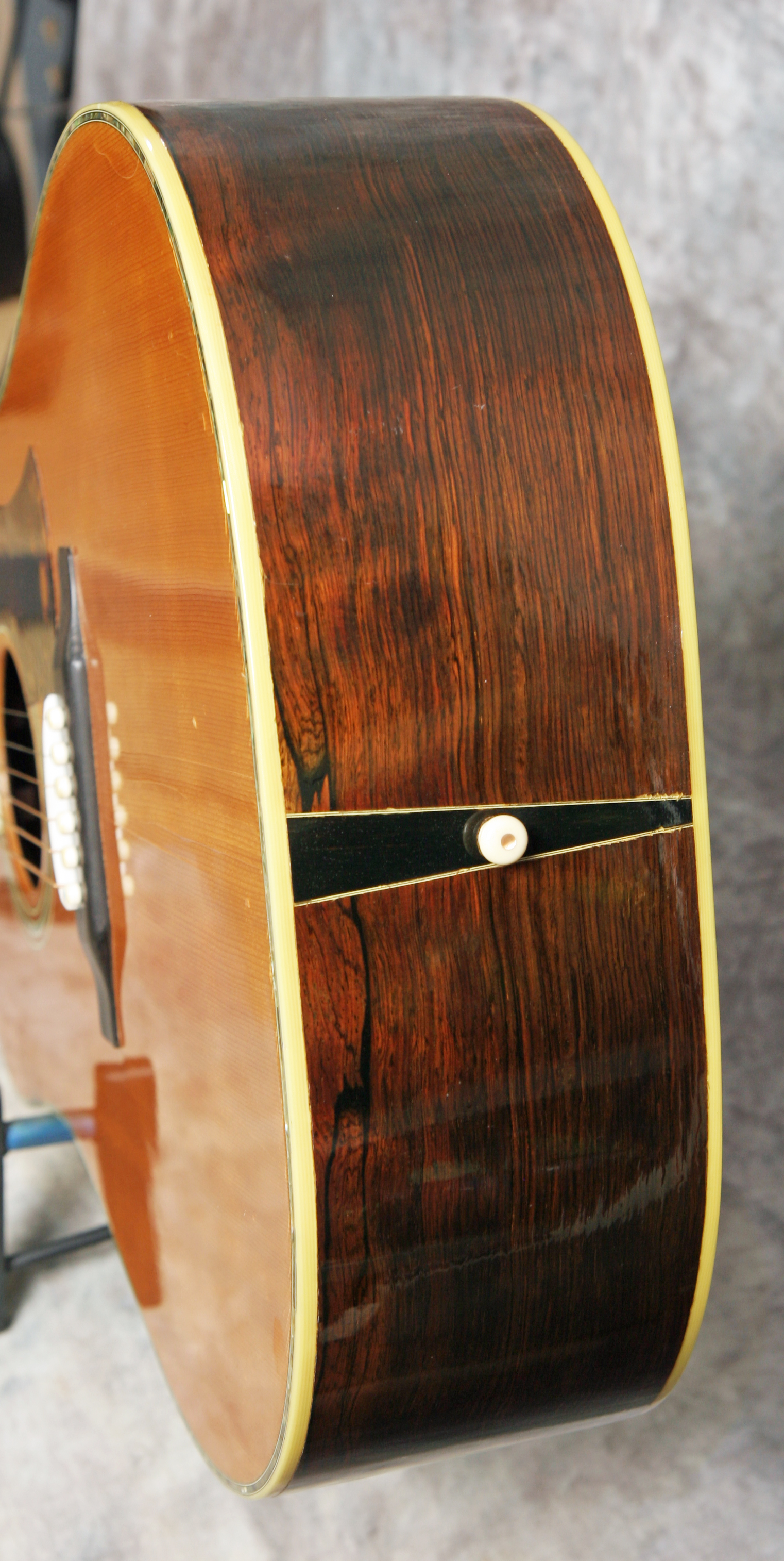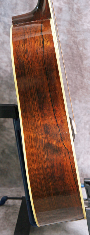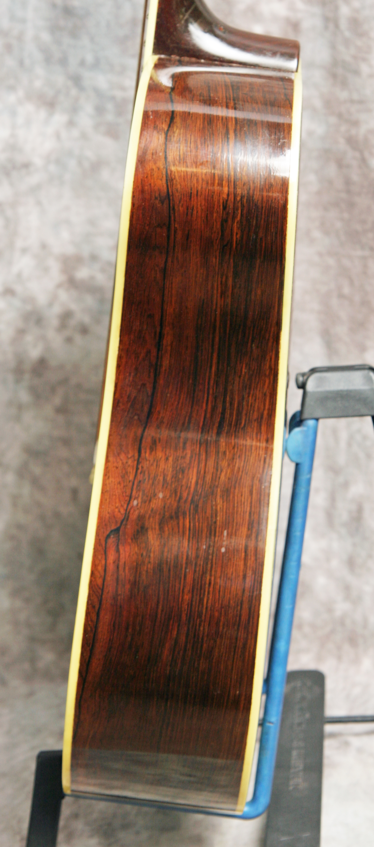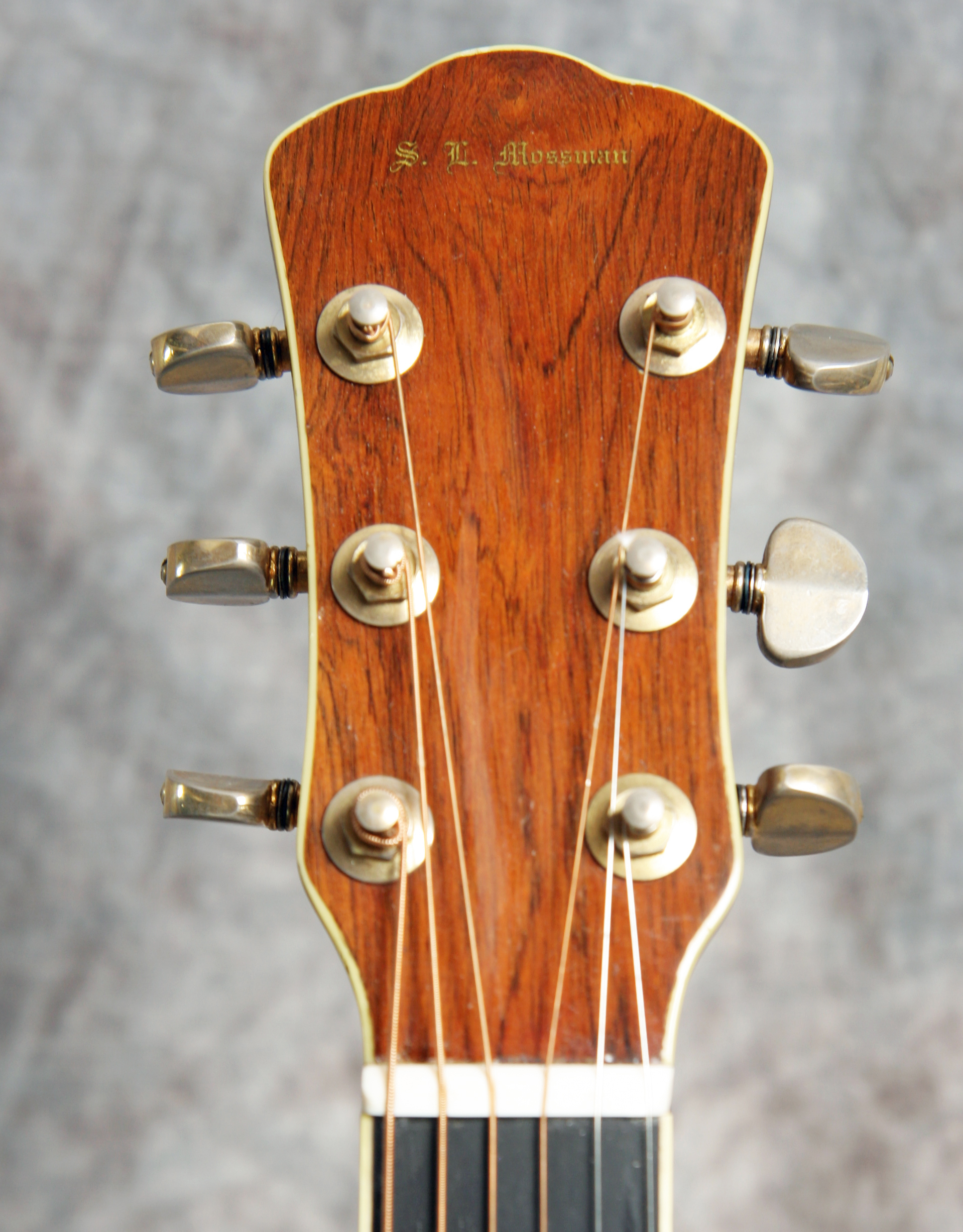 (Serial No. 73-252) My first "real" guitar was a Mossman. I still think they are outstanding guitars. Excellent condition with old growth straight grain Brazilian rosewood back and beautifully figured Brazilian sides (all sourced from Martin, as evidenced by the zipper backstripe), solid Sitka spruce top, ebony fingerboard with pearl dots, gold Grover tuners that appear original to the guitar, and an ebony bridge. Built pre-fire in the Winfield, KS shop (the Mossman factory had a devastating fire in 1975 which destoyed the companys considerable stash of Brazilian rosewood), 1 and 11/16 inch nut, low profile neck, ivoroid binding, B/W/B purfling and that GREAT strong Mossman sound, very good condition overall, and signed on the label by all the craftsmen that worked on it. Finish and hardware is all original with no repairs noted. Shows some minor finish checking. Stu Mossman was a builder 20 years ahead of his time, with some early innovations: bolt on neck, low profile necks, mortoise and tenon neck joints, and an attention to quality that was not prevelant in other American guitar factories in the early 70s – which many regard as the dark years for certain American brands. Mossmans were hand built very high quality guitars. Excellent action and playability, as the neck was reset and the guitar was set up by Richie Dotson of Acoustic Box LLC in Chesterfield VA. Here is a video clip of this guitar as played by Richie. This is an excellent US made bluegrass guitar with lots of volume and tone. Why play the same thing everyone else has? Comes with a very clean blue lined probably original hard case.