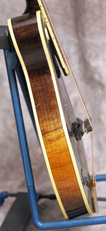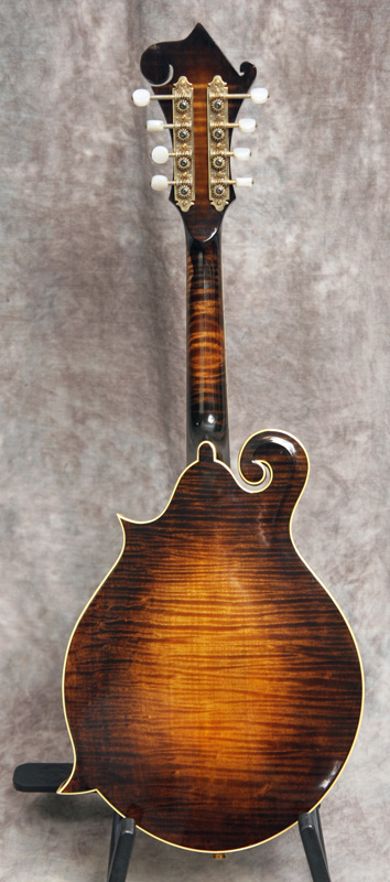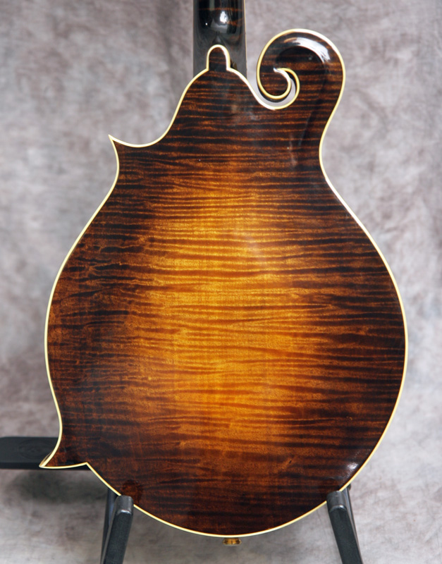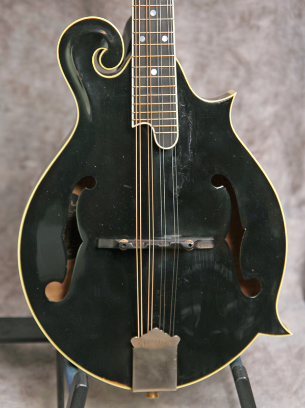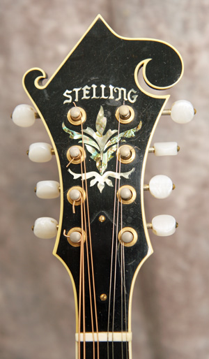 (Serial No. 070) Excellent structural condition showing a little playing wear. This was built by Kim Breedlove under contract to Stelling. Has a black top finish and a sunburst finish on the back. Has a Sitka spruce top, highly flamed maple sides and an one-piece back, flat ebony fretboard, ebony bridge, 1 1/8 inch nut, pearl headstock inlay and logo, and gold Gotah tuners with pearl buttons. It also features a gold plated Stelling one-piece tailpiece. It shows a little pickwear on the top where a pickguard is usually fitted. Excellent sounding instrument with a deep woof on the bottom and clear trebles on the top. Click here for a video clip of this mandolin. Just set up by luthier Marty Beeson. It needs nothing but your fingers on the strings! Comes with the original rectangular hardshell case marked Stelling.